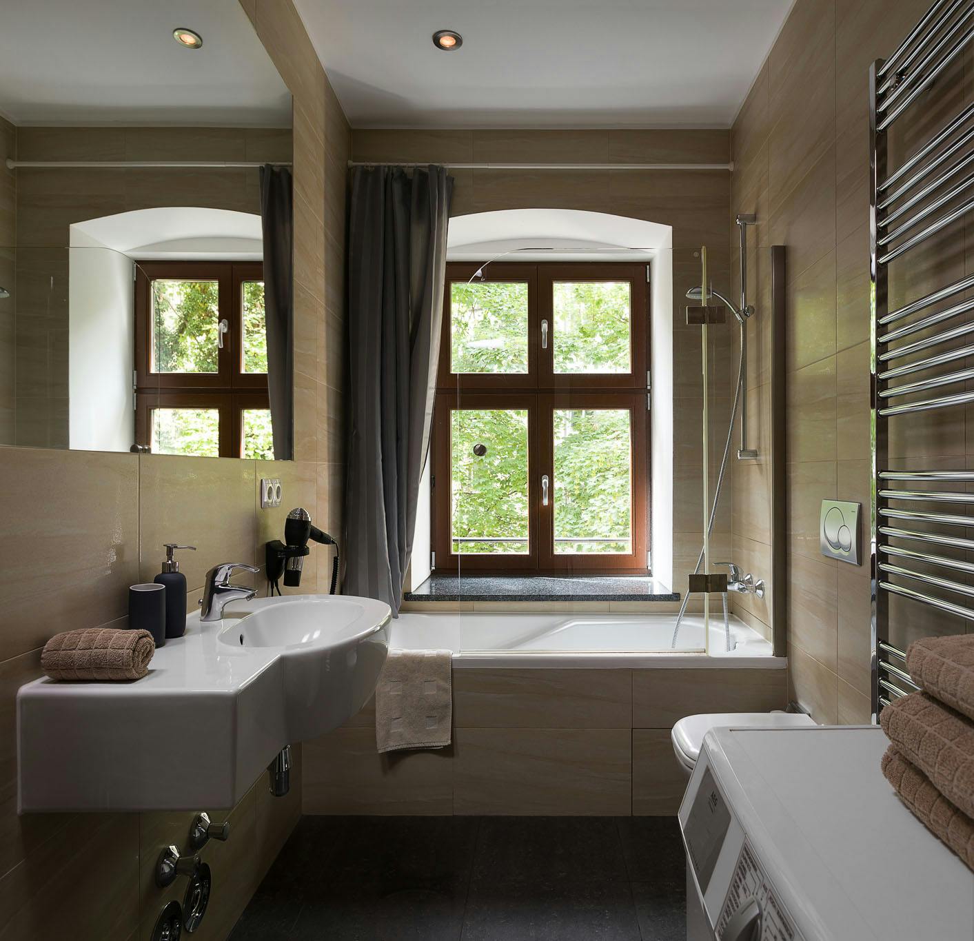 *Deutsche Beschreibung unten This one bedroom apartment is located in the North Wing of a luxurious furnished apartment complex in central Berlin. It is fully furnished and serves all the equipment necessary for a short or long term rent in Berlin. All rooms look out onto the peaceful and quiet courtyard which serves as an oasis of tranquility especially in summer, enabling you to sleep with the windows open listening to the background sound of the gentle breeze. This sense of peaceful bliss will be enjoyable after a demanding day at work. Solid floor boards, and interior doors are all original...
