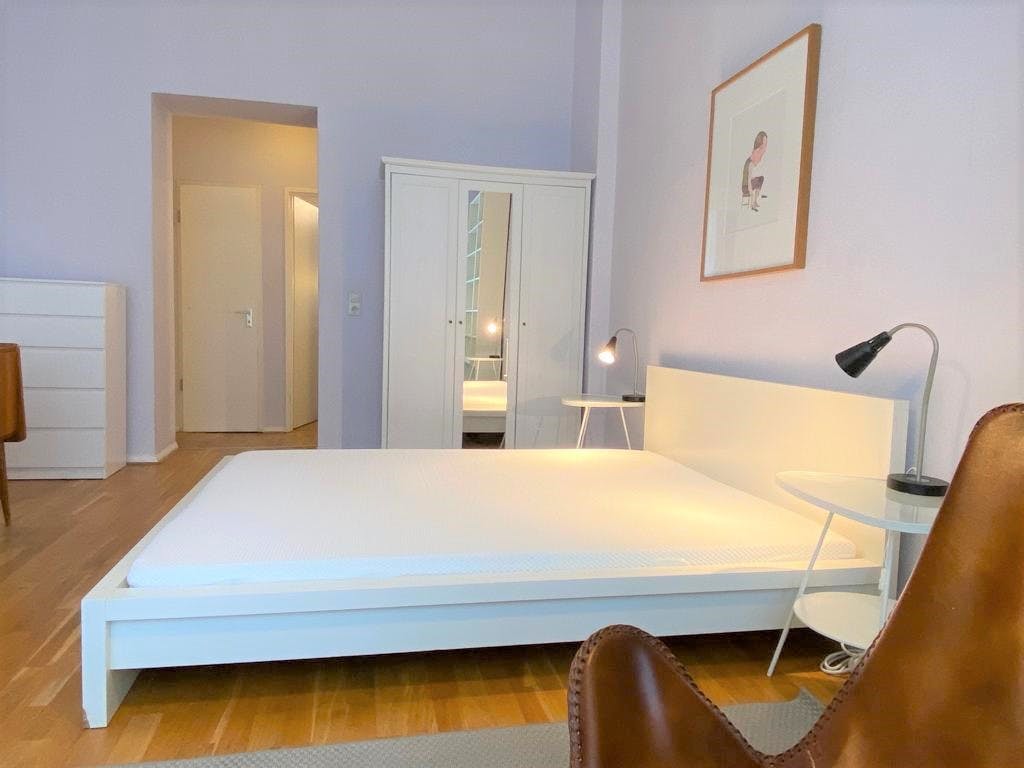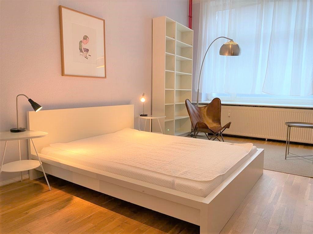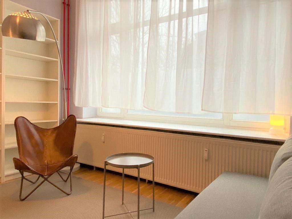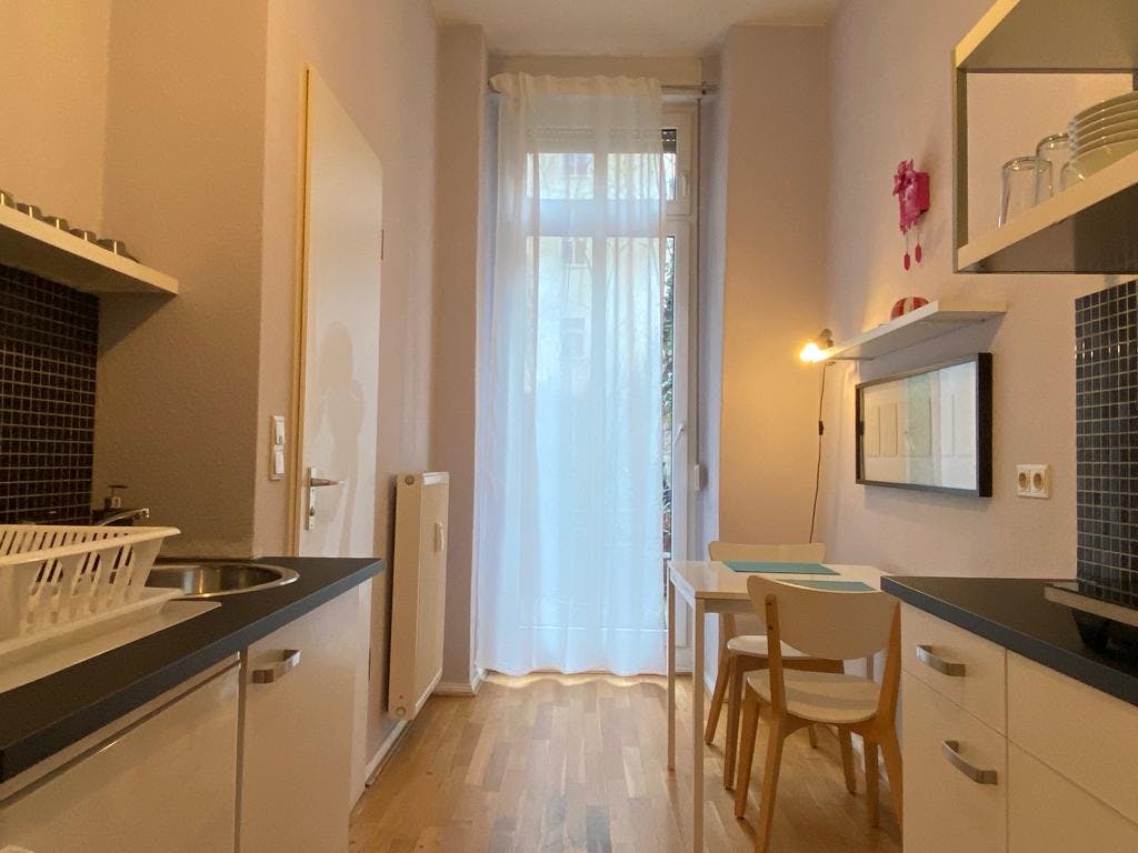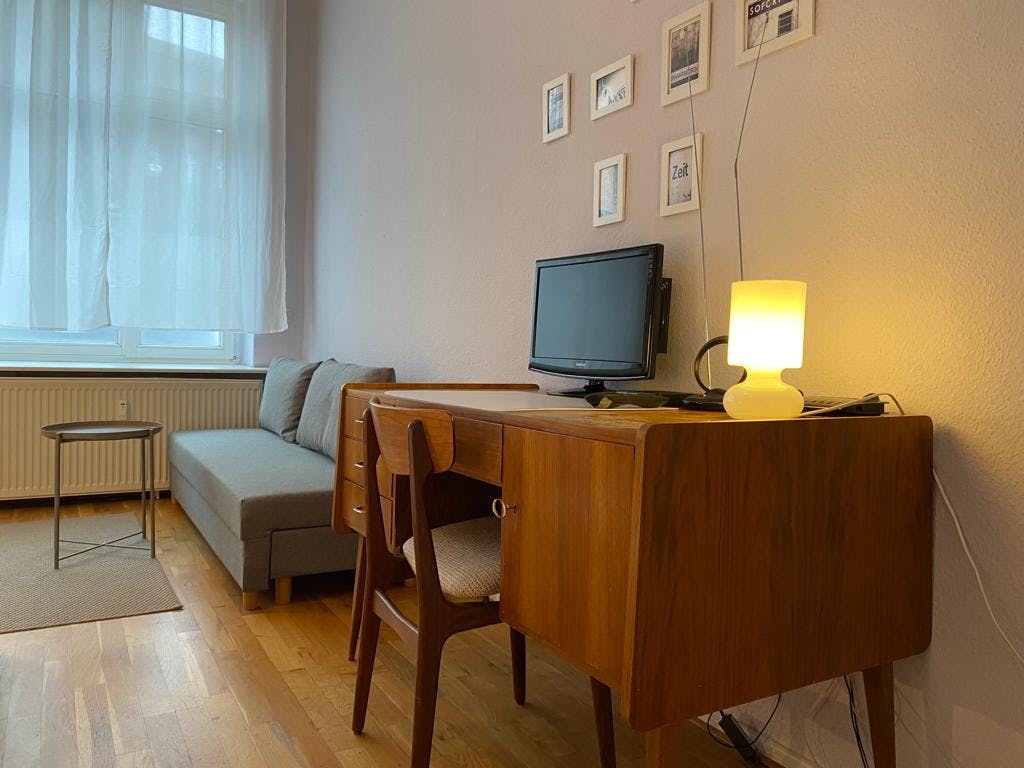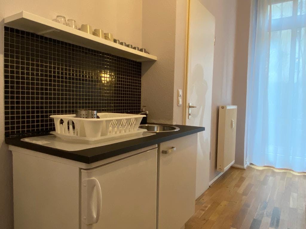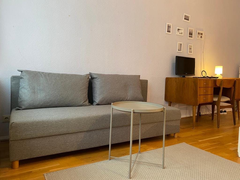 1 Room • 43 sqm • Ground floor • Terrasse • Prenzlauer Berg • Sonnenburger Strasse Minimum stay: 8 months • Maximum stay: 12 months • Anmeldung is provided Suitable for: Single / Couple / 1 - 2 People Room Double bed 160X200 2 night tables 2 reading lamps Wardrobe Chest of drawers Sofa bed 140x200 Arm chair Standing lamp Desk Chair Mirror Curtains Electric shutters Book shelf Kitchen Fridge (Small) Cooking plate Microwave Dining table 2 Chairs Electric shutter Access to terrasse Bathroom Washing machine Shower Towel rack Mirror Hall Hangers Bank Shelf Amenities WiFi Laminat floor Central heating Clothes hangers Vacuum cleaner Plates/glasses/cutlery Pots and pans Cooking equipment Public transport 5 minutes walk to Schönhauser Allee S+U Bahn station (U2/S41/S42/S8/S85) 5 minutes walk to Schönhauser Allee Tram station (M1) Supermarkets 5 minutes walk to REWE 6 minutes walk to EDEKA 6 minutes walk to Netto Marken-Discount Requirements Documents needed: Copy of...