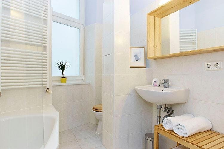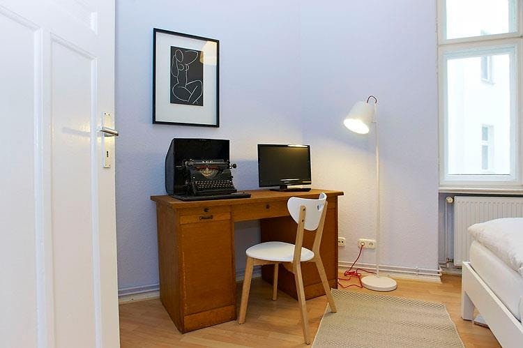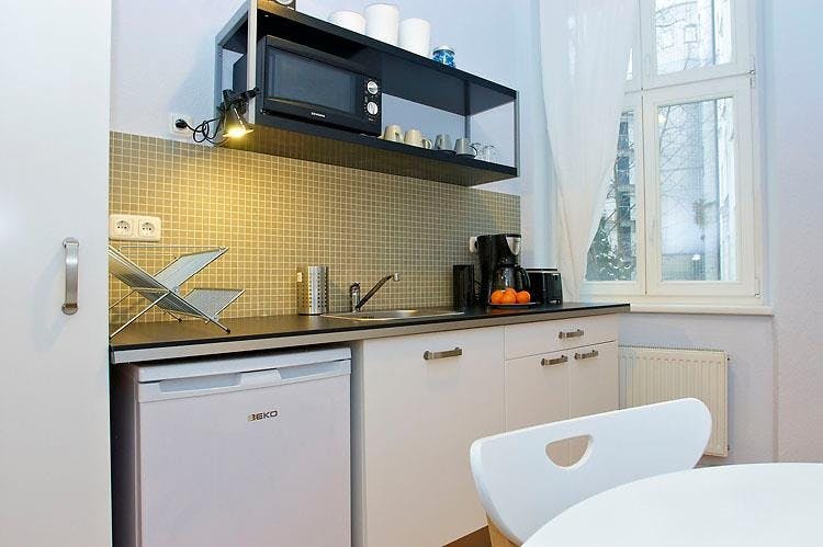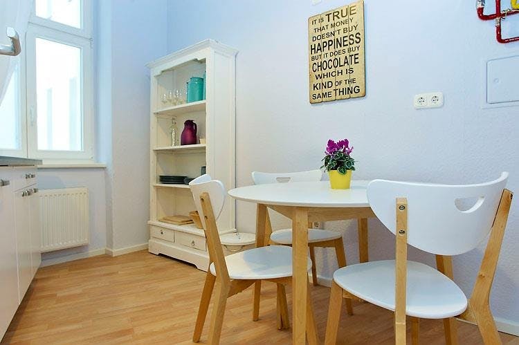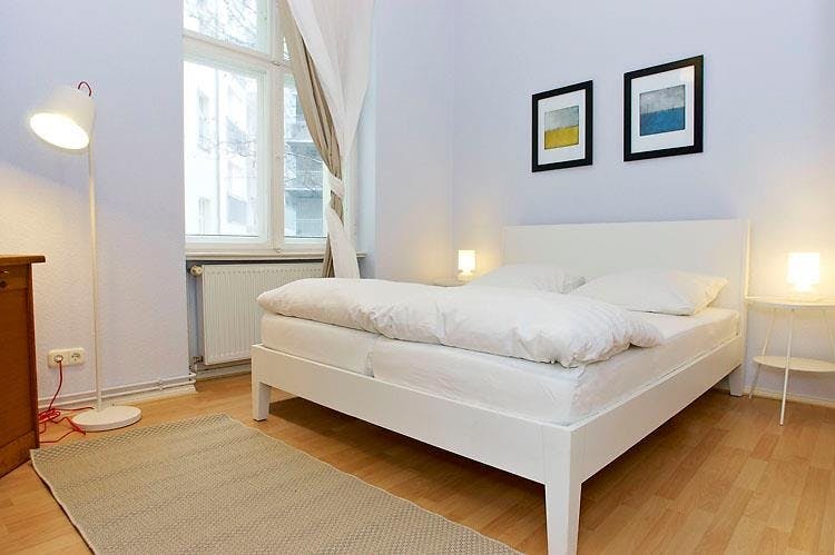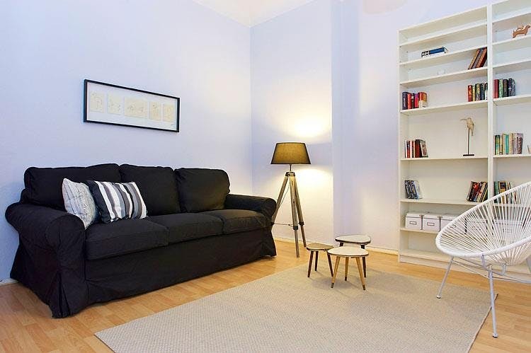2 Rooms • 50 sqm • 1st Floor • Lift • Friedrichshain • Simplonstrasse Minimum stay: 10 months • Maximum stay: 12 months • Anmeldung is provided Suitable for: Single / Couple / Roommates / 1 - 2 People Living room Sofa bed 160x200 Coffee table Carpet Desk Chair Curtains 2 Book shelves Bedroom Double bed 160X200 2 night tables 2 reading lamps Wardrobe Desk Chair Curtains Kitchen Fridge (Small) Cooking plate Microwave Toaster Kettle Dining table 3 Chairs Dish drying rack Bathroom Washing machine Bathtub Shelf Towel rack Mirror Hall Hangers Amenities WiFi Laminat floor Gas heating Clothes hangers Vacuum cleaner Cleaning tools Plates/glasses/cutlery Pots and pans Cooking equipment Public transport 2 minutes walk to Tram station (M13) 9 minutes walk to Ostkreuz S-Bahn station (S3/S5/S7/S9/S41/S42/S8/S75/S85) Supermarkets 3 minutes walk to ALDI 8 minutes walk to PENNY 10 minutes walk to REWE Requirements Documents needed: Copy of passport Proof of income/financial support Studies admission Pets: allowed Smoking: not...