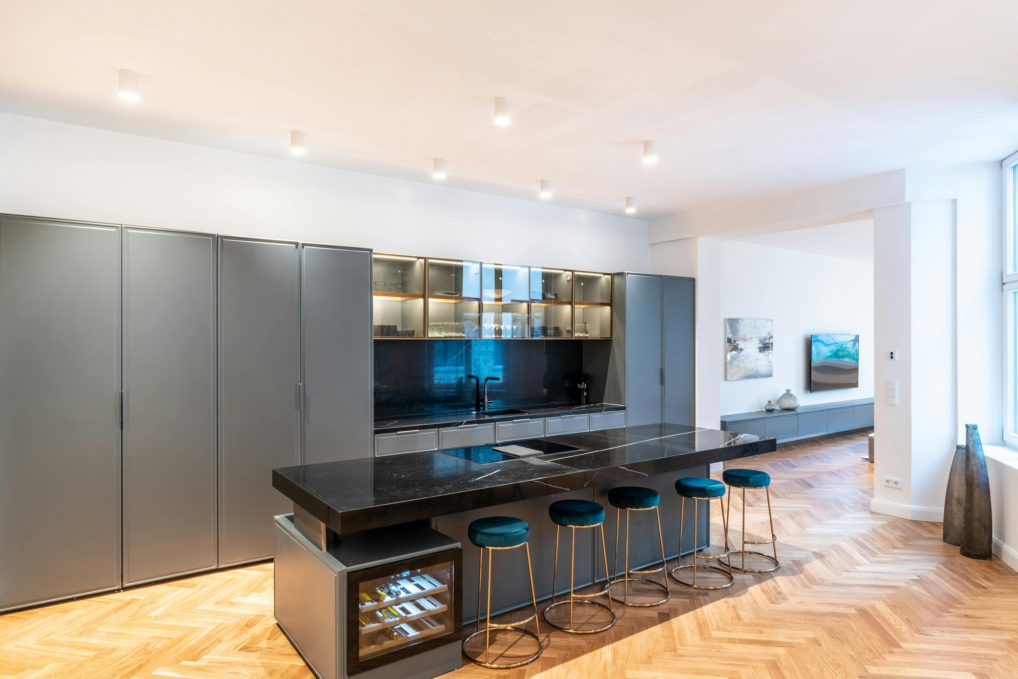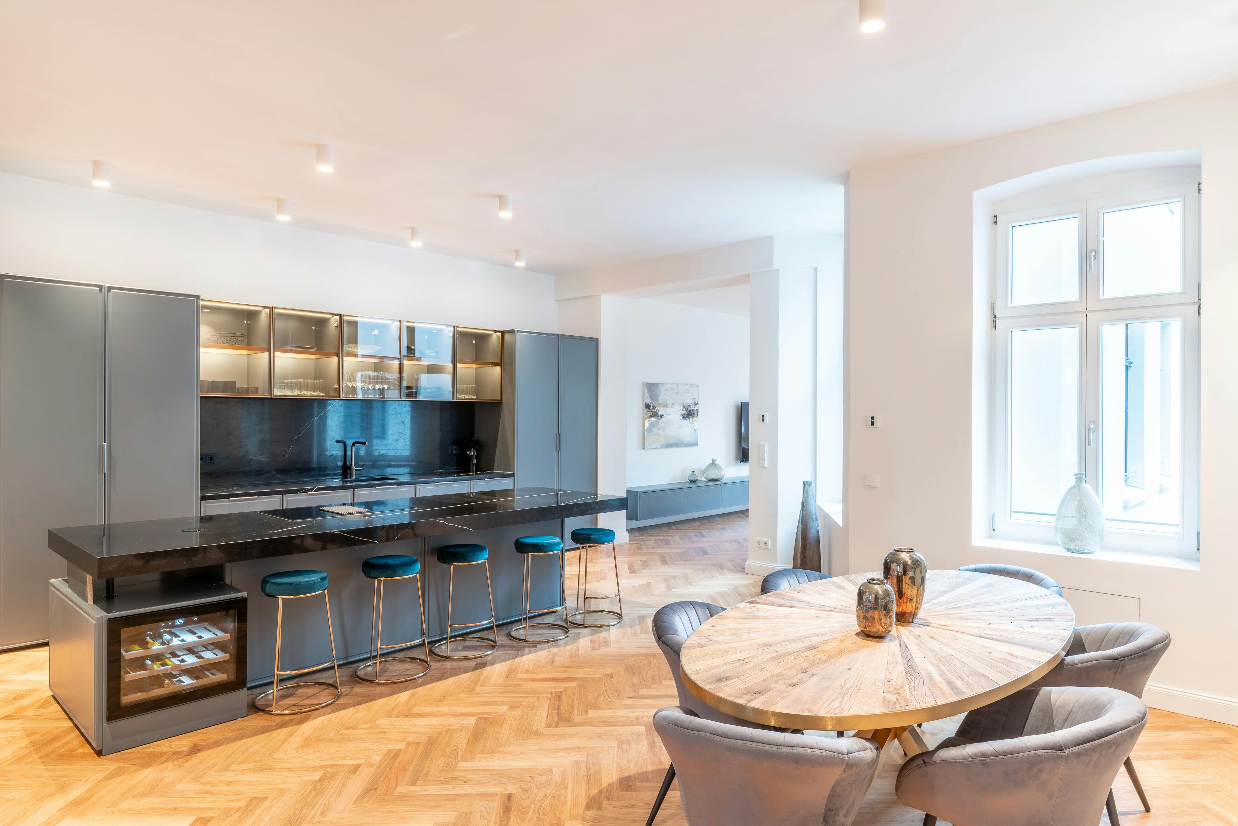 Substantial and Stylish One Bedroom Apartment in Berlin Mitte. Ideally situated in the heart of the city, these 130-150sqm (approximately 1,399-1,614sqft) fully furnished, brand-new apartments offer luxury, enormous living spaces, daily convenience, and direct access from the building to a gorgeous secret park. Stunning vernacular architectural detailing evidences superb craftsmanship, while the exterior displays subtle and tasteful aspects of modernity. Automobiles delightfully line the streets, as pedestrians happily and briskly walk to a variety of local destinations and attractions. Impressively designed, the apartment features an open floor plan, dedicated living spaces, high ceilings, neutral color scheme, and phenomenal hardwood floors....