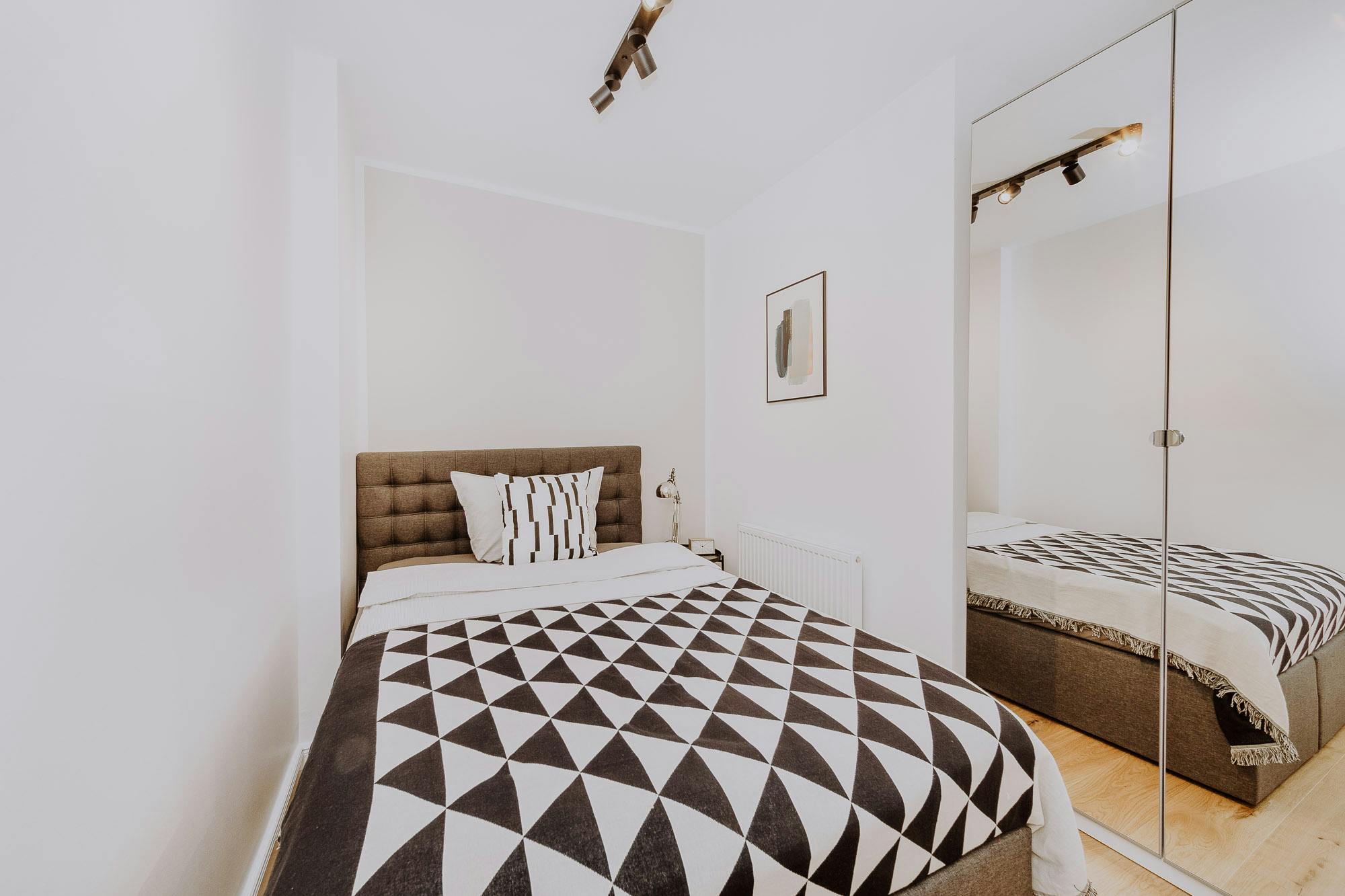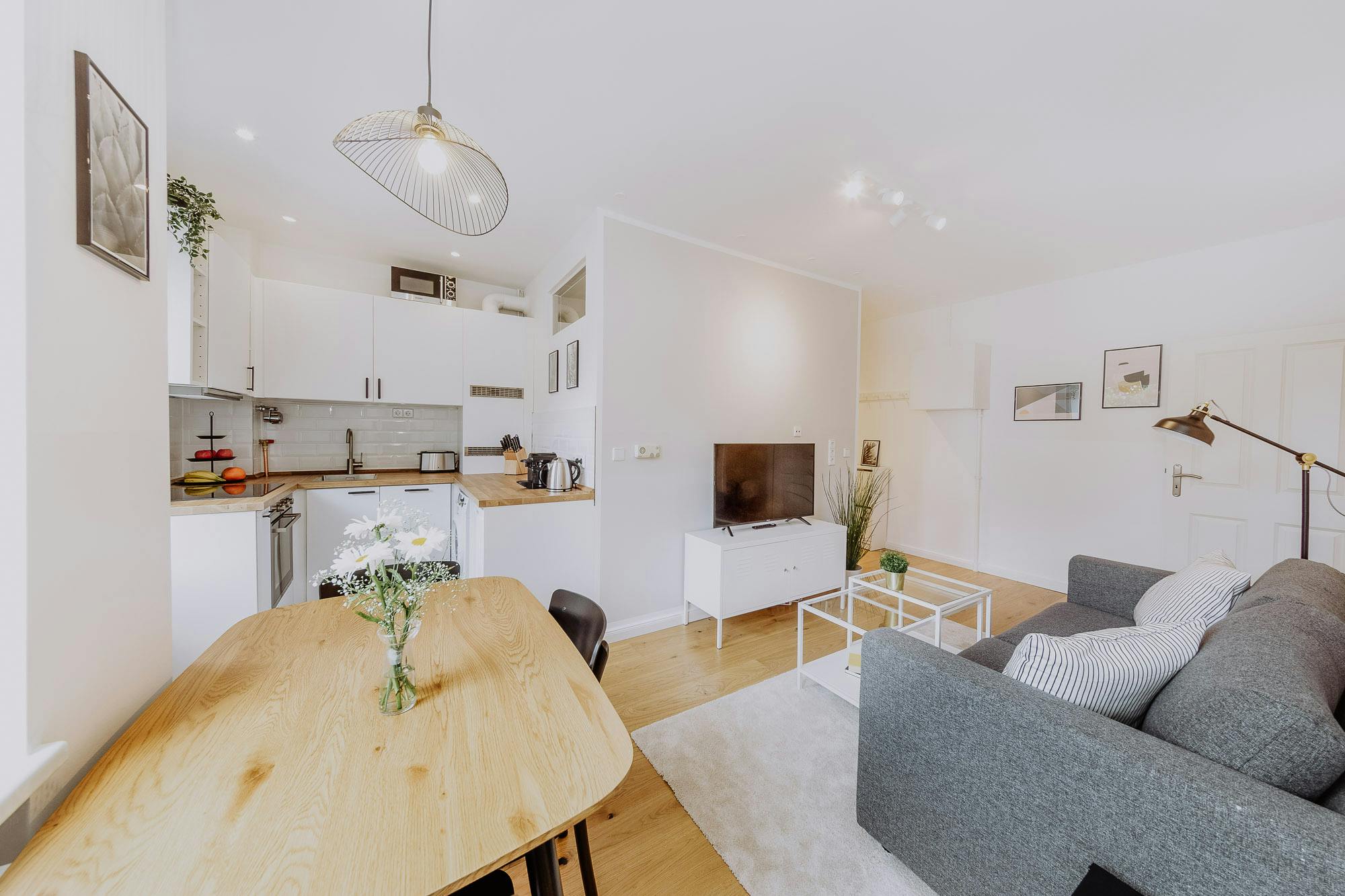 PLEASE NOTE THAT IF YOU RENT THE ACCOMMODATION FOR LESS THAN 6 MONTHS, THE RENTAL PRICE INCREASES BY 7%. This two-bedroom apartment leaves nothing to be desired. The bright and high-quality furnished 3-room apartment with two comfortable box spring beds looks quietly towards the inner courtyard, with a beautiful location near the Havel and Eiswerder. The bathroom is equipped with a large shower and your own washing machine allows you to wash and dry your clothes comfortably at any time (washer-dryer). The living and dining area with its fully equipped kitchen and a dining table, which can seat 4 people, as...