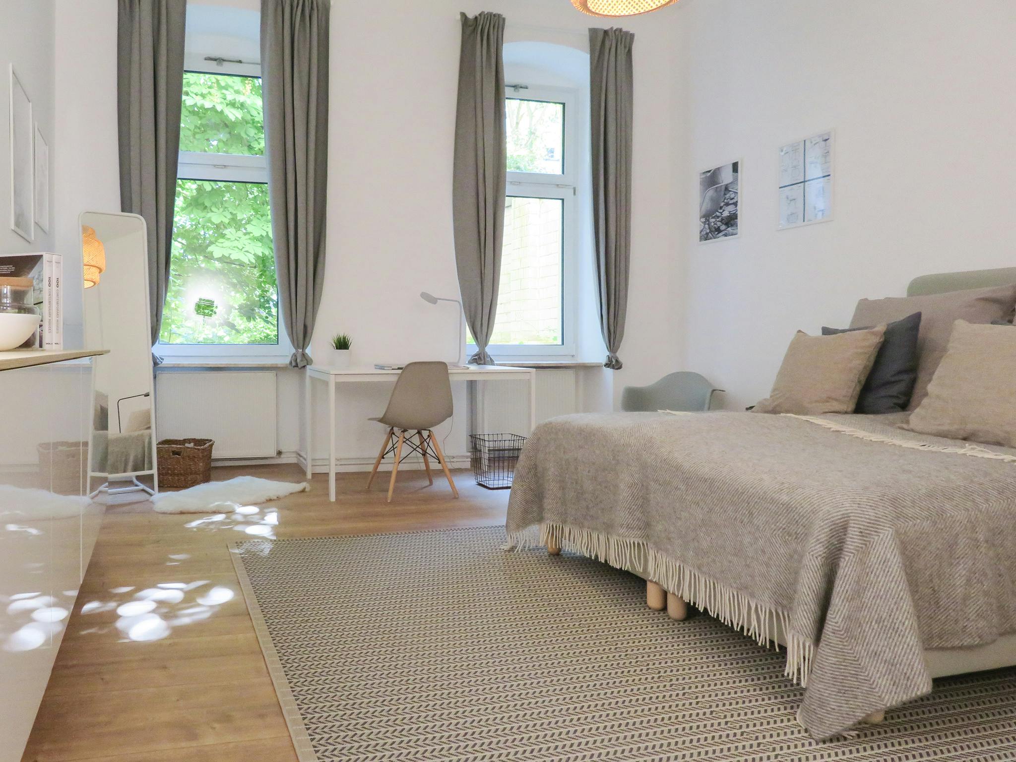 Beautiful and quiet 2 room apartment in Bergmannkiez. This space is characterized by its neat modern design. It features large window panes that glare natural light into the space, stylish decoration, exceptional furniture, a bathroom with a walking shower a fully equipped kitchen to cook comfortably, creating a beautiful housing space! The two rooms are equipped with a comfortable double bed ensuring a great night of sleep, a large closet providing plenty of room for your clothes, a desk perfect for studying or reading in peace, and you can totally make it feel like your personal spot to unwind. In one...