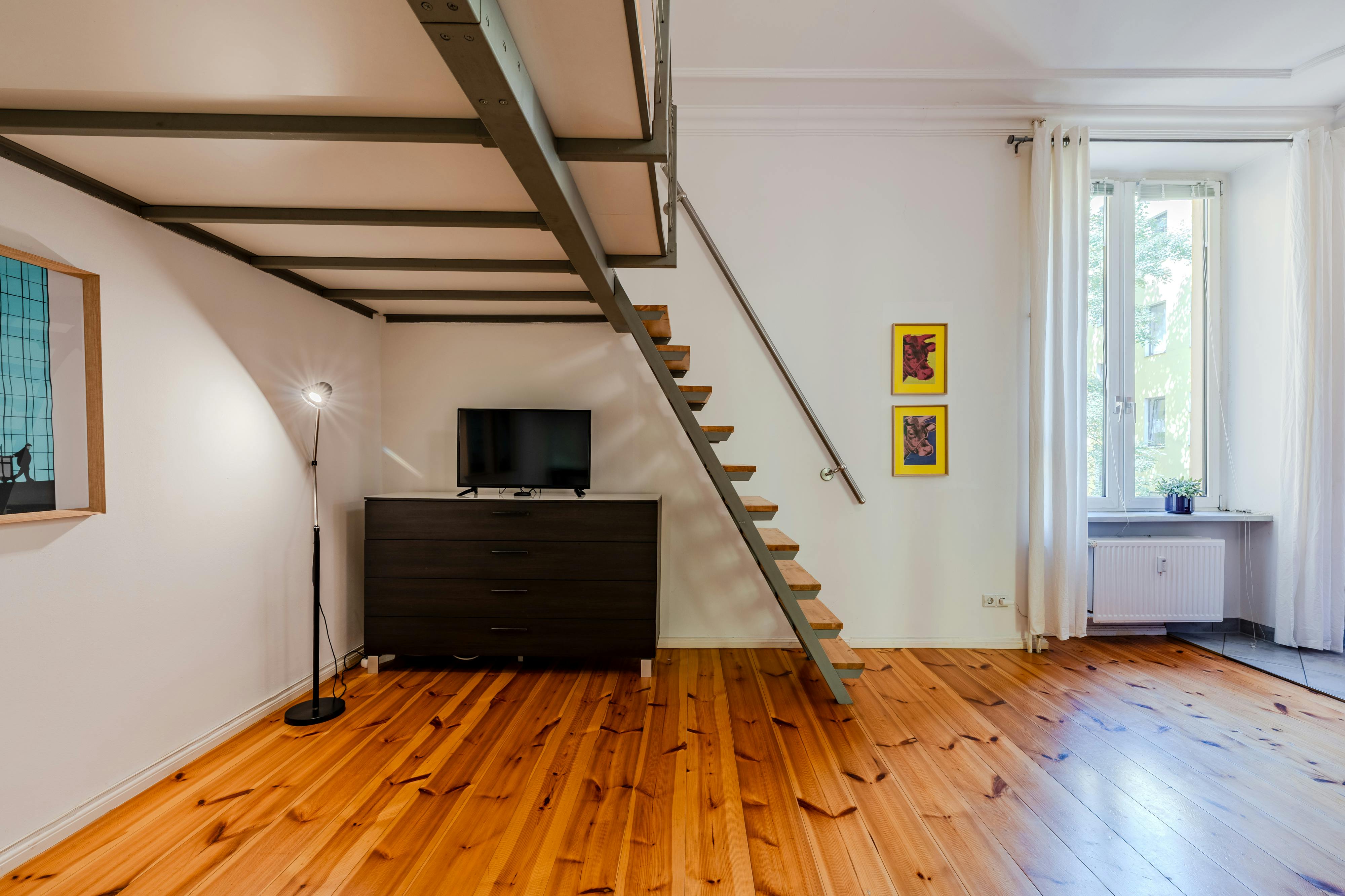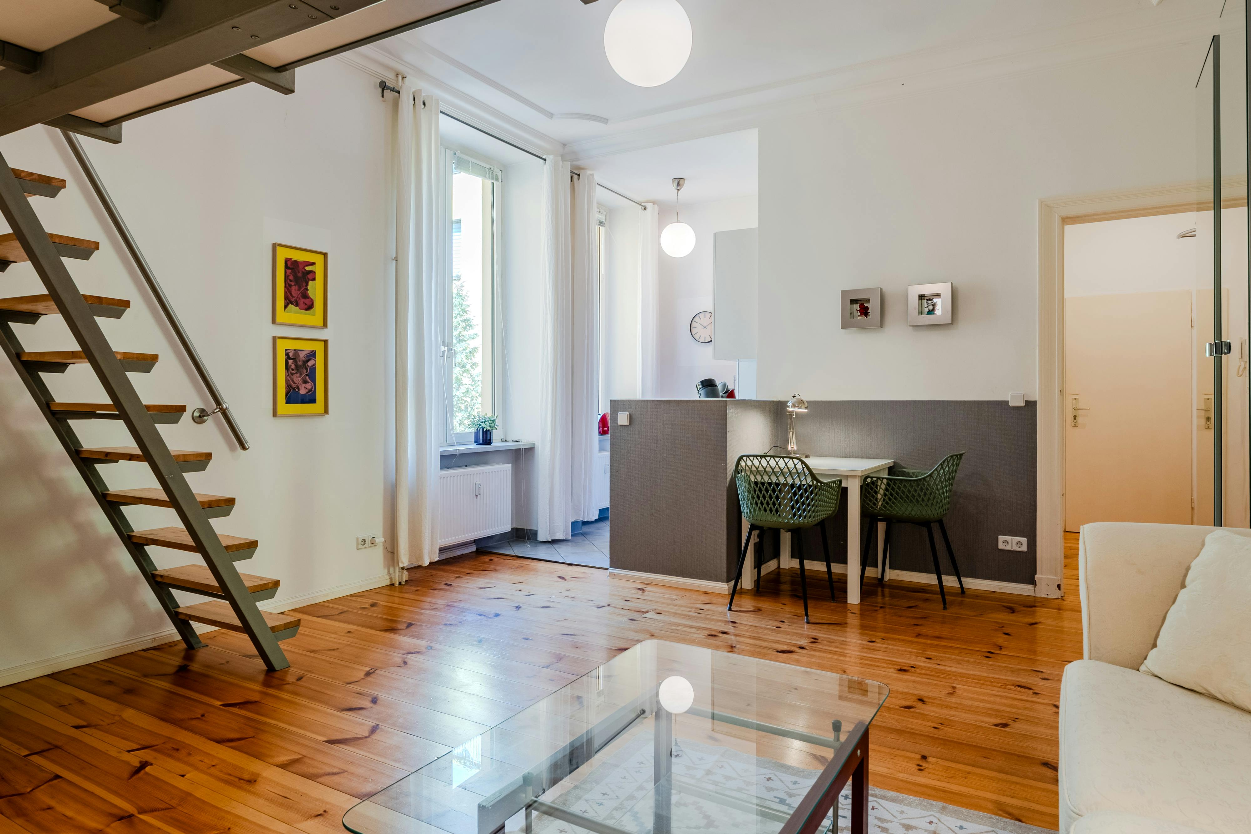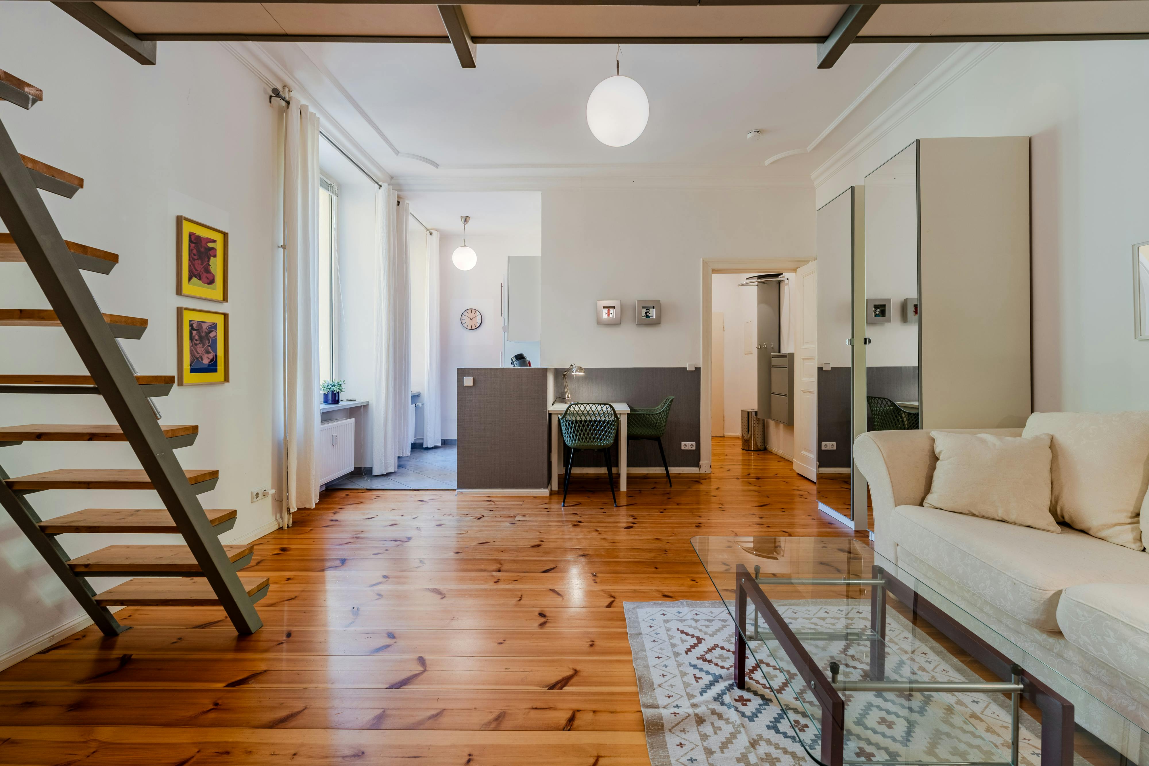 This is a big and convenient studio in an old building with high ceilings and stucco overlooks the beautiful landscaped garden courtyard and is about 35 square meters (2. floor). It consists of an open living room with sofa, dining table and a big loft bed 160x200. Monthly costs = 1247,- EUR all included (rent 997,- + 120,- house costs + 80,- heating + 50,- electricity = 1247,- EUR) Living- and bedroom equipped with: - loft bed (160x200) - Dining table, Sofa - WiFi - HOTSPOT is for free, no guarantee for the signal strength / speed / quality The kitchen equipped with: -...