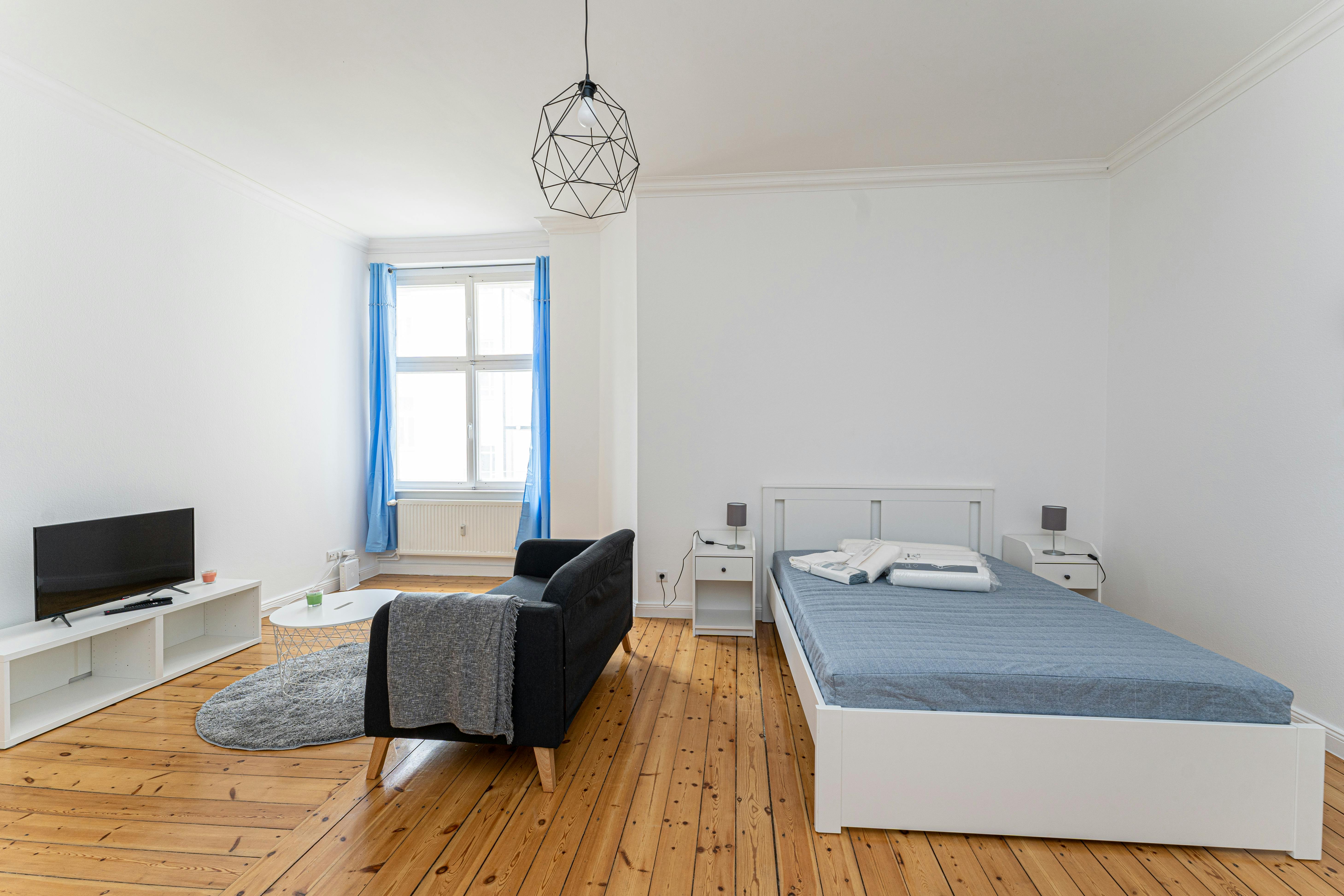 Welcome to the heart of the city! The apartment is in a great location and offers you everything you need for a great stay in this city! The location of the property offers everything your heart desires. Quiet living, work and leisure come together here. Everything you need for daily life is in the immediate vicinity. The apartment offers you many advantages for a pleasant stay. See for yourself. Here you will feel like in your second home. This marvelous 1-room apartment offers a spacious 46 qm with high ceiling as well as wodden flooring . The apartment is located on...