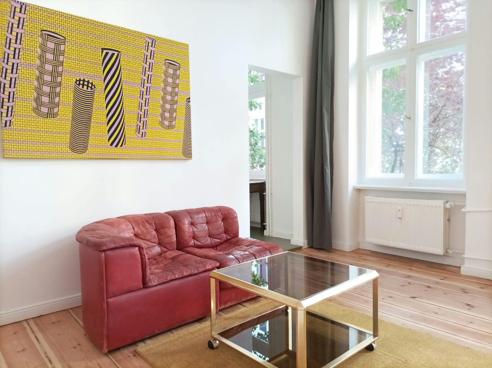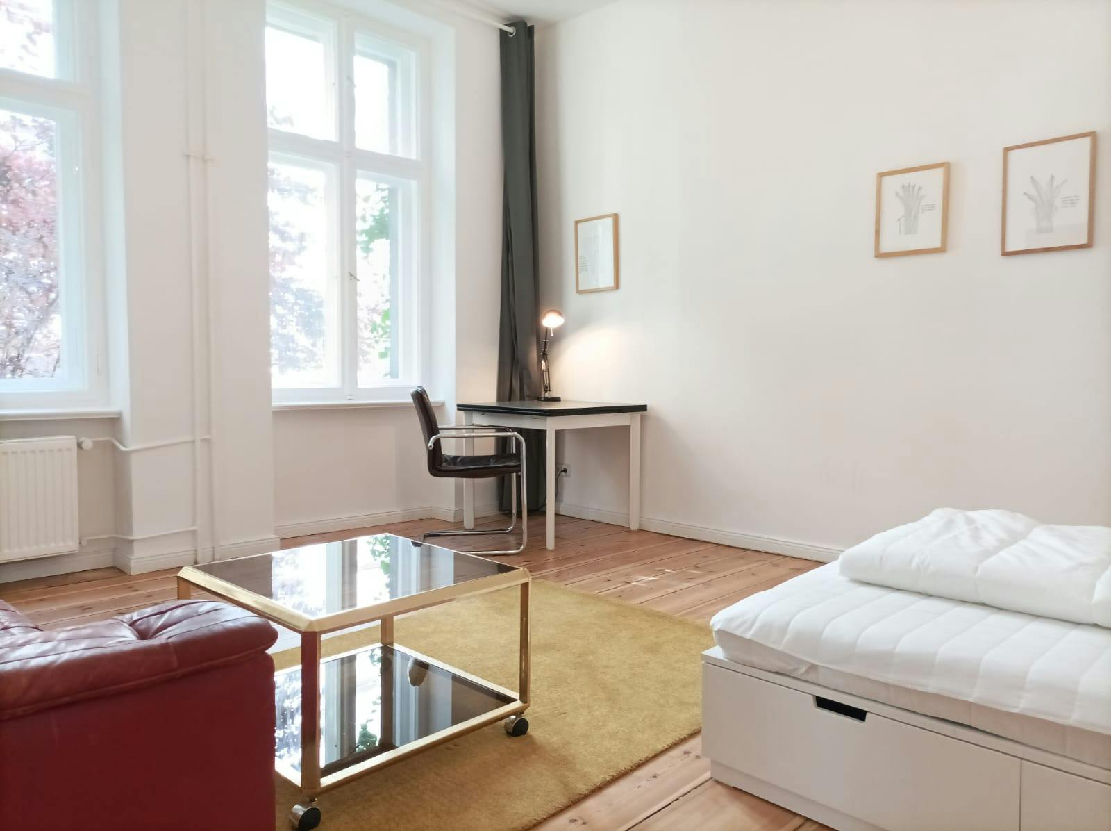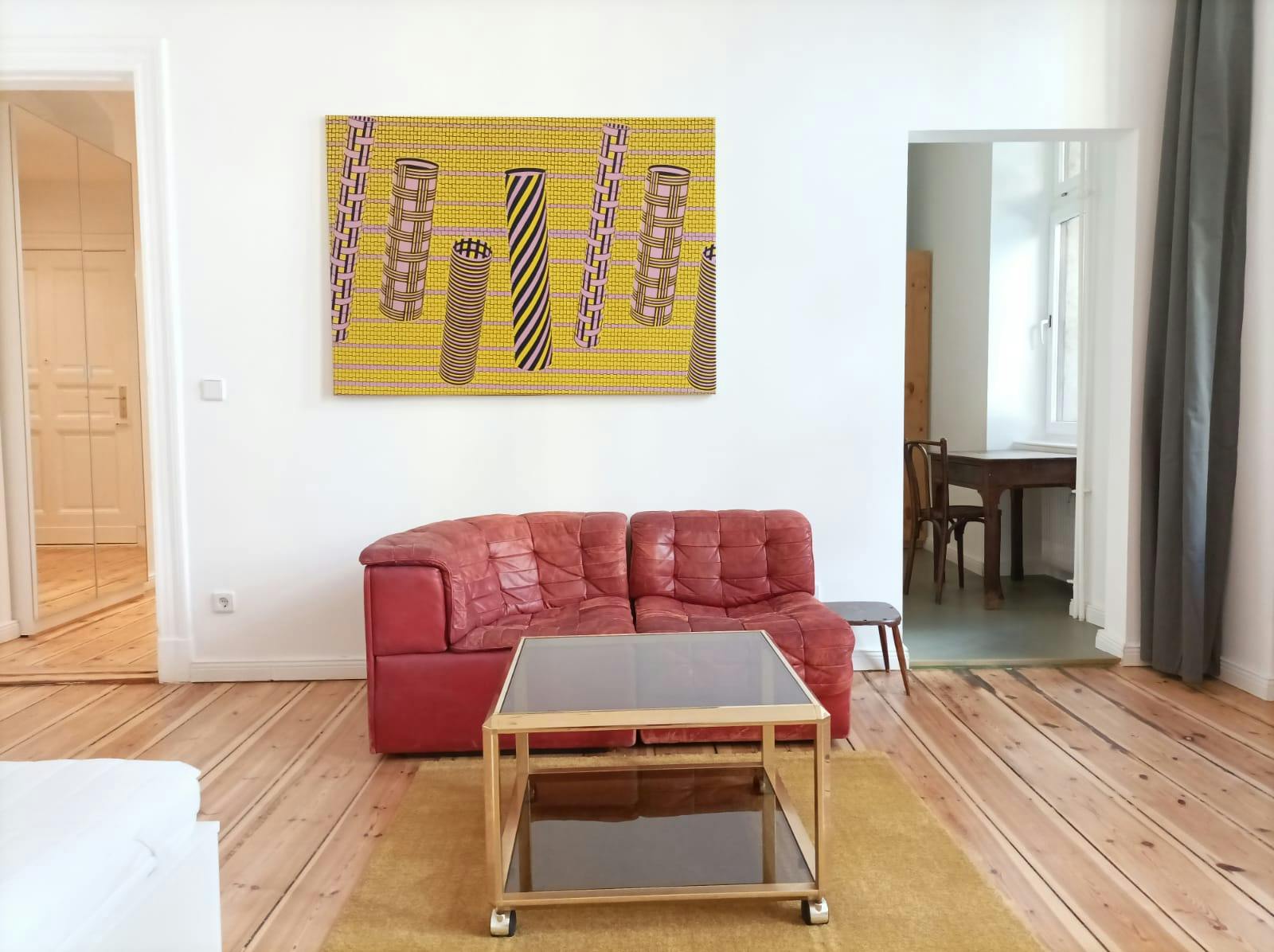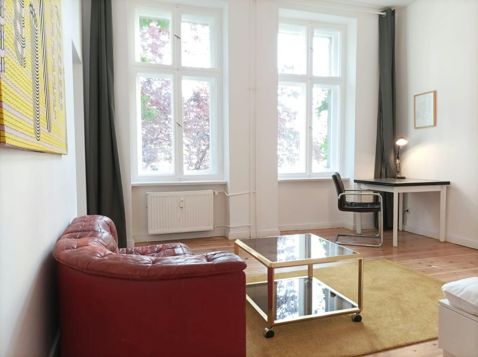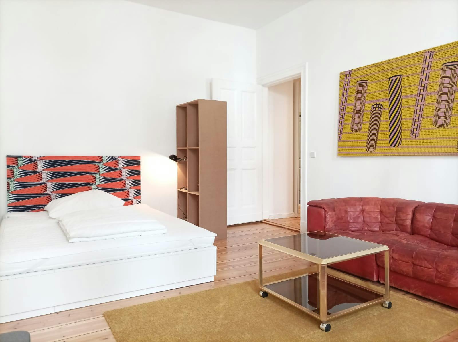 1 Room • 42 sqm • 1st Floor • Neukölln • Nanasenstrasse Minimum stay: 7 months • Maximum stay: 12 months • Anmeldung is provided Suitable for: Single / Couple / 1 - 2 People Room Double bed 160X200 2 night tables 2 reading lamps Wardrobe Sofa Coffee table Carpet Desk Shelves Blackout curtains Kitchen Fridge (Big) Oven Electric stove Hood Small dishwasher Dining table Chairs Blackout curtains Bathroom Washing machine Dryer Shower Drawers Towel rack Mirror Hall Mirror Hangers Shelf Wardrobe Amenities WiFi Wooden floor Central heating Clothes hangers Vacuum cleaner Cleaning tools Plates/glasses/cutlery Pots and pans Cooking equipment Public transport 1 minute walk to Bus station (171/194/M29) 8 minutes walk to Hermannplatz U-bahn station (U8) 8 minutes walk to Schönleinstrasse U-bahn station (U8) Supermarkets 2 minutes walk to ALDI 2 minutes walk to EDEKA 2 minutes walk to LIDL Requirements Documents needed: Copy of passport Proof of income/financial support Studies admission Pets: not allowed Smoking: not...