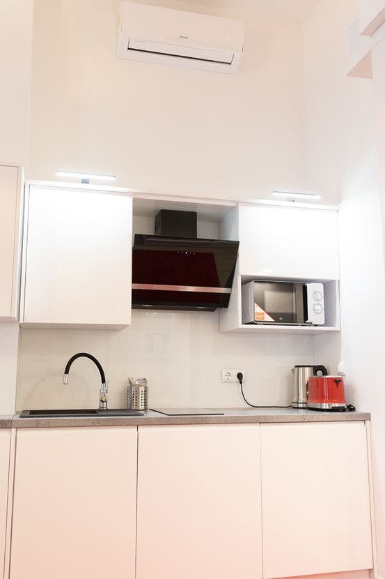 EN: Whether for travel-happy free spirits, business people or as an interim solution, the freshly renovated living studio offers compact living with style. The studio includes a kitchenette with a fully equipped kitchen, which is integrated into the living area. The modern tiled bathroom is equipped with a floor-level shower. The high windows offer a view into the green inner courtyard. The property is located in Charlottenburg-Wilmersdorf near the park of Charlottenburg Palace. It is connected to the S- U and regional train services via the Jungfernheide and Mierendorffplatz stations, which are only a few minutes walk away. The Edeka market...