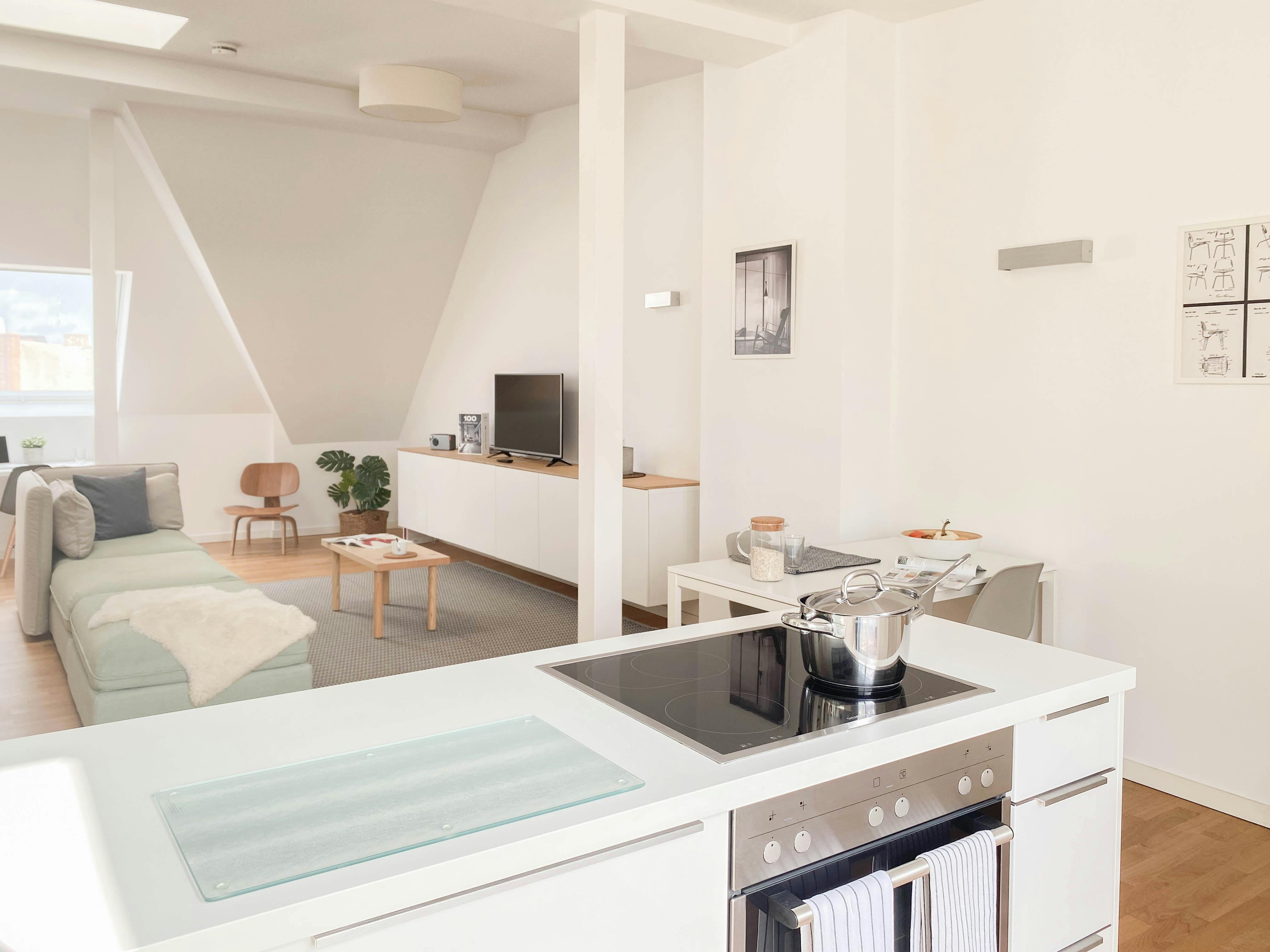 Freshly renovated two-room penthouse in the heart of Schöneberg. Beautifully remodelled historic building complex located in a quiet side street. The surrounding offers plenty cafes, restaurants and small shops. Supermarkets, and further local amenities are very close by. This apartment is bright, quiet and beautifully decorated in a natural design. Completed by a private balcony overlooking the famous television tower and the town hall of Schöneberg, offers full comfort. Please note: - There is an elevator in the building for your convenience. The connection to the public transport network is superb. The S-Bahnhof Julius-Leber-Brücke and the subway station Kleistpark and Eisenacher Straße are...