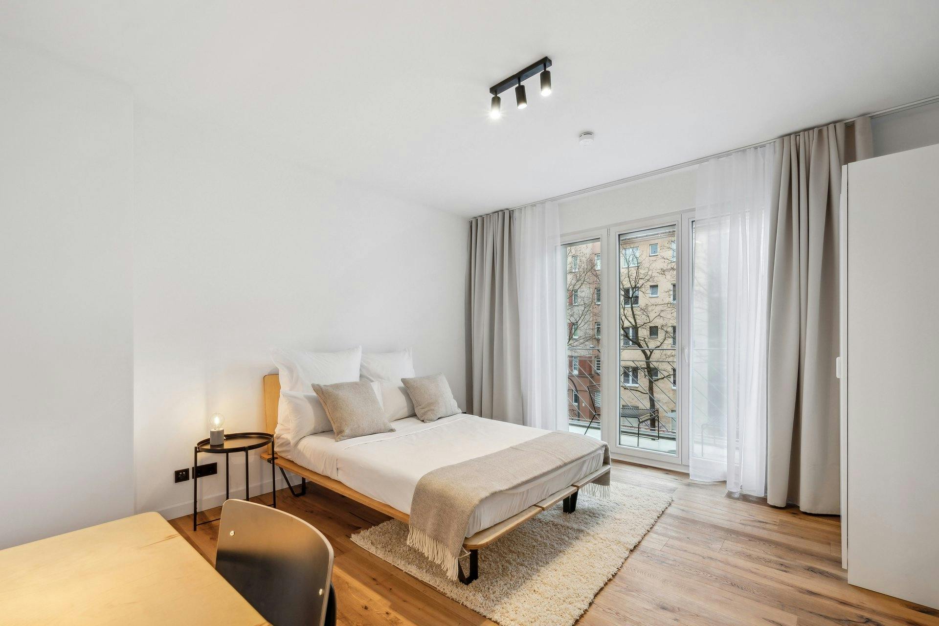 ROOM Our rooms come fully furnished with everything you need for a comfortable daily life. In the bedroom area, you will find a bed with a nightstand and lamp, as well as a large wardrobe. A premium mattress with a set of bedsheets, pillows, and duvets is also always included. To comfortably work or study from home, there is a table with a lamp and chair. You wont need anything additional to settle in, and can arrive just your luggage at hand. APARTMENT You will be the first to move into our newly constructed and renovated apartments. Each flat has a fully equipped...