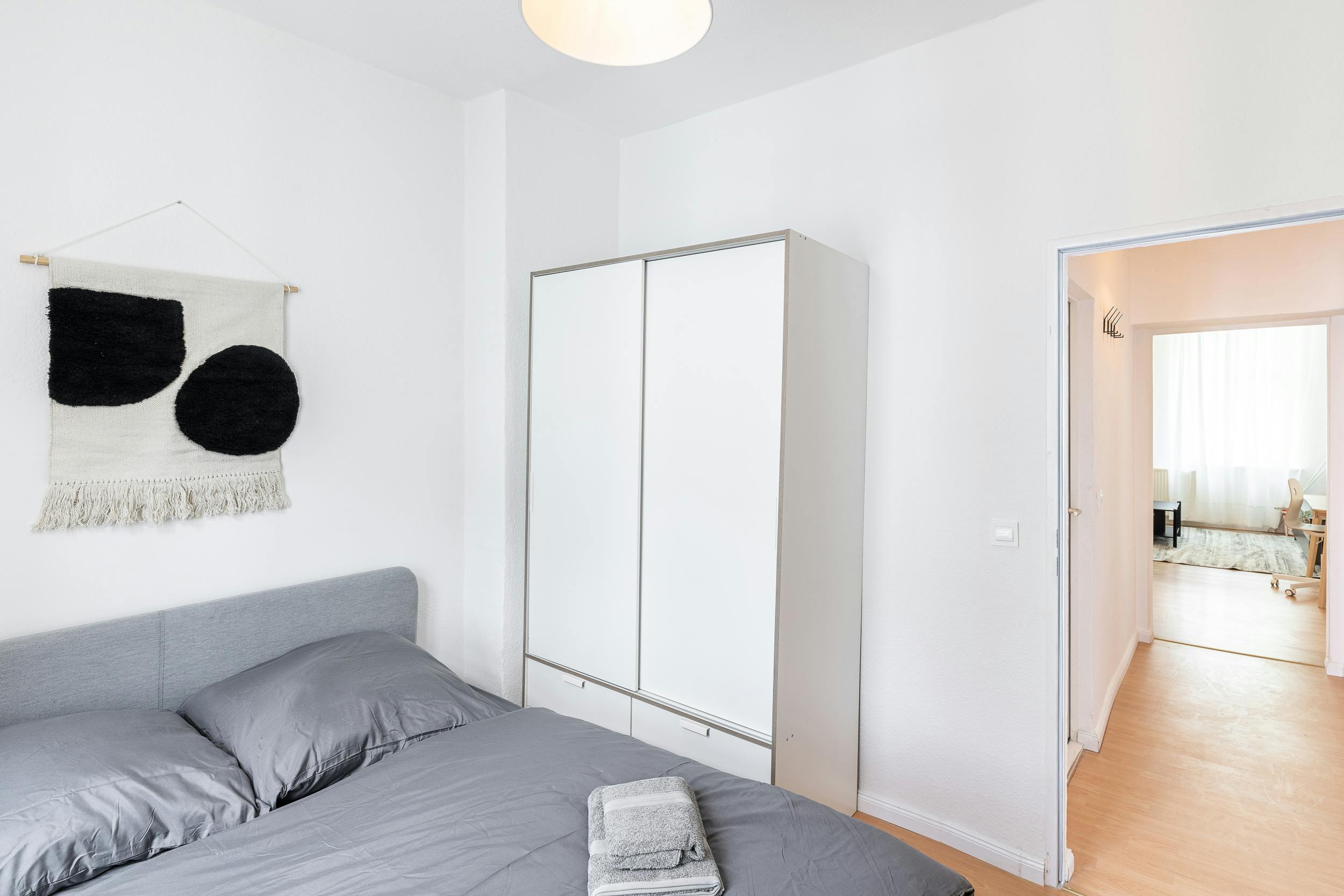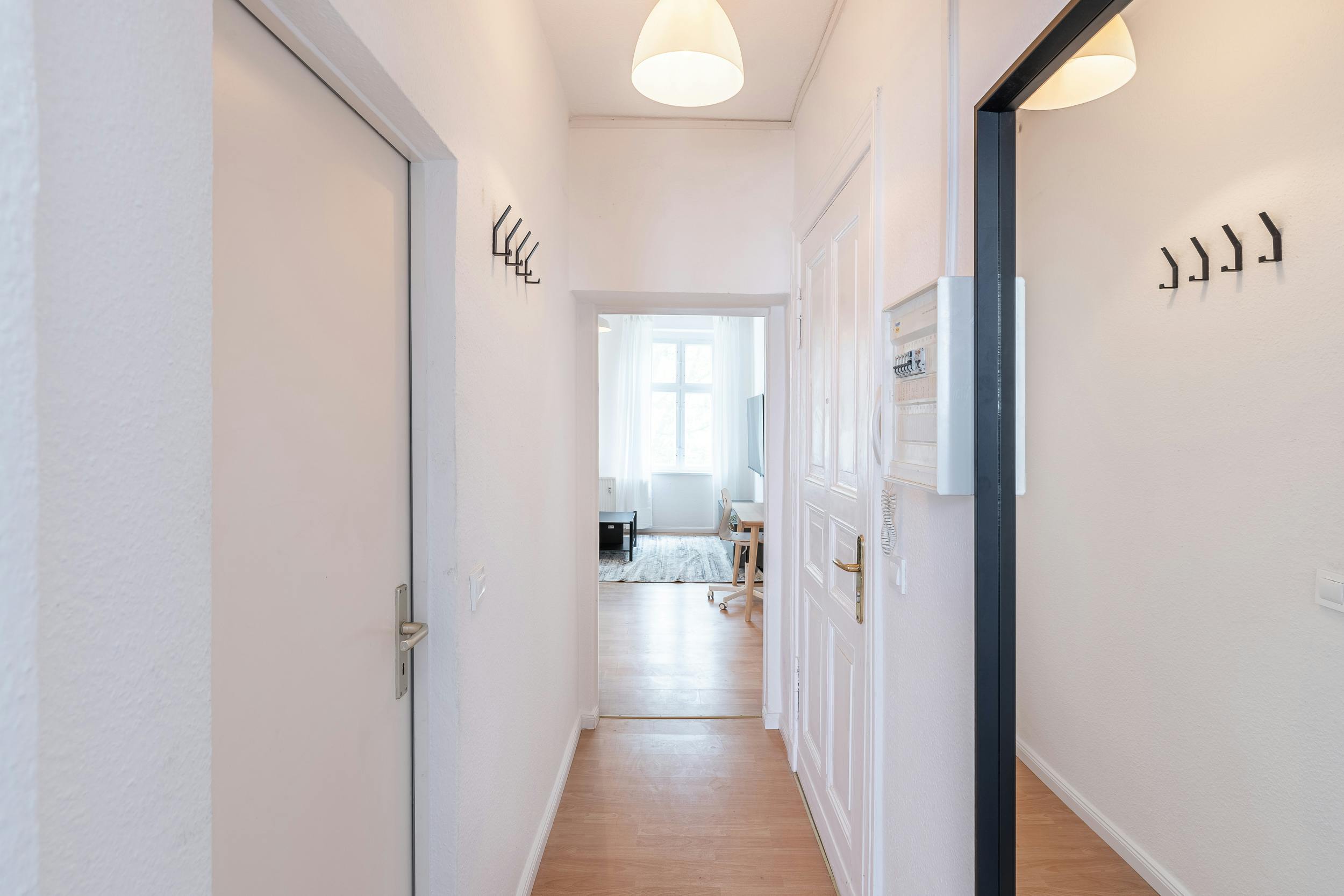 Located in the middle of the trendy neighborhood Friedrichshain, the fully equipped two-room apartment offers you everything you could wish for your stay: The apartment is located in the trendiest district of the city. Discover the city's hippest bars, clubs and restaurants. Or take a walk in Volkspark Friedrichshain. At home you will have your peace, because the apartment is located in the rear building. The apartment is modern furnished. The large living area impresses with its open kitchen and a bright dining area, which invites you to a cozy get-together. You can look forward to a fully equipped kitchen. This is...