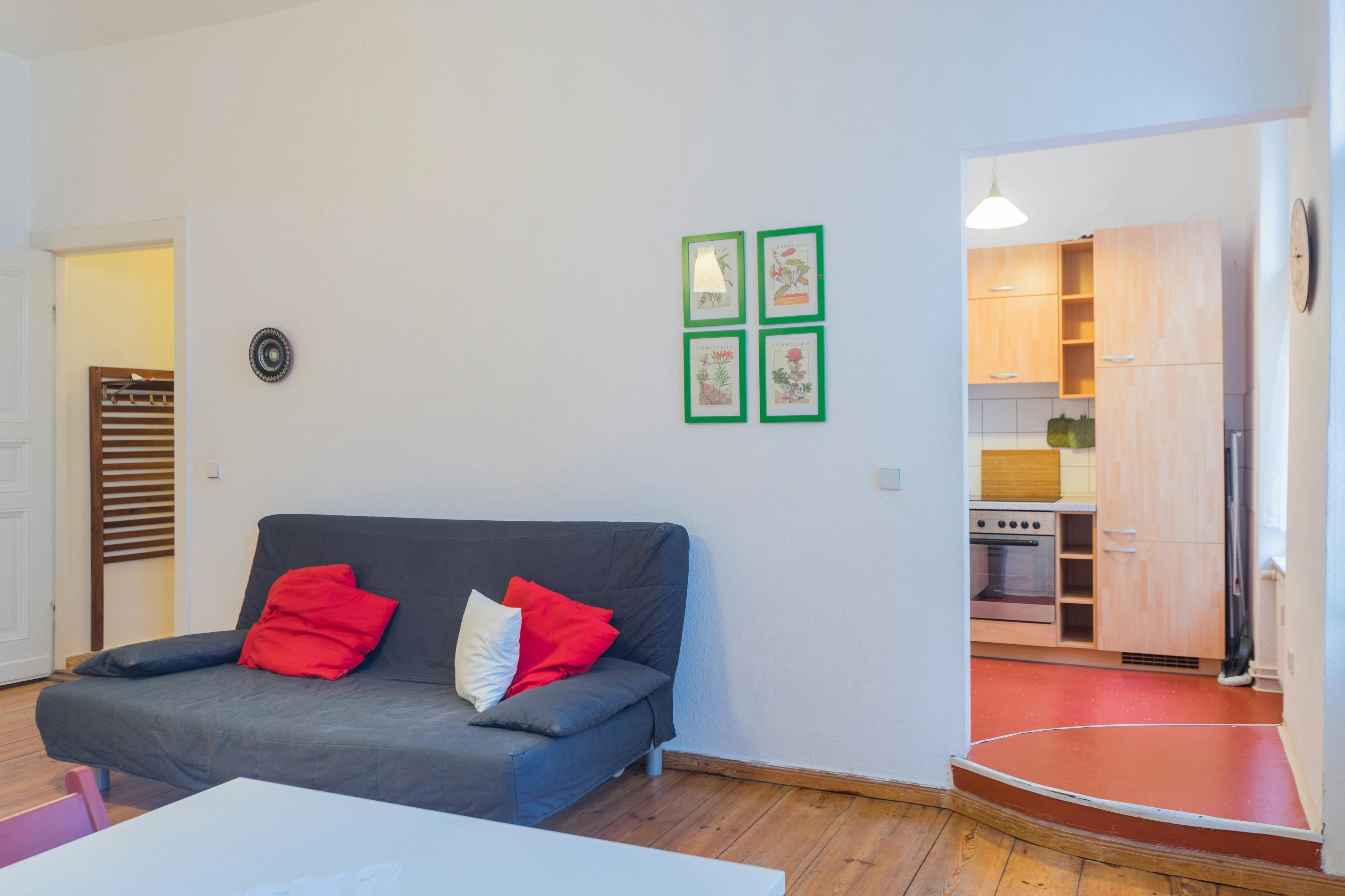 DESCRIPTION OF THE BUILDING: The apartment is located on the second floor of a building in a quiet neighborhood. FLAT: The apartment opens onto the corridor. The bedroom is furnished with two beds, a single bed and a French bed. There is also a large closet. The corner kitchen is open and equipped with everything you need, from a microwave to a dishwasher. The living room has a young style, consisting of a table for four people and a sitting area with a sofa and two armchairs. There is also access to the balcony from the room. The well-kept bathroom is equipped with...