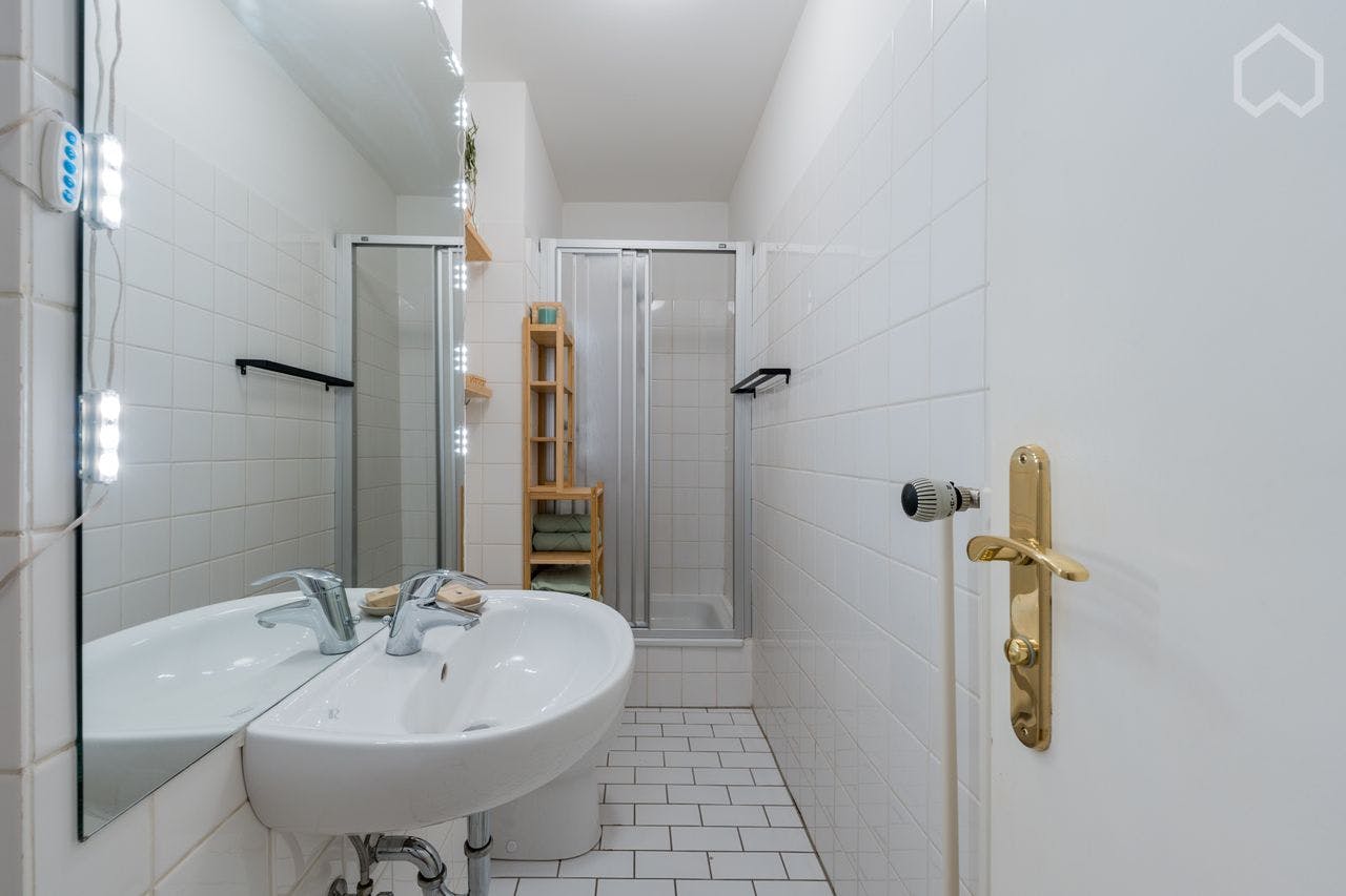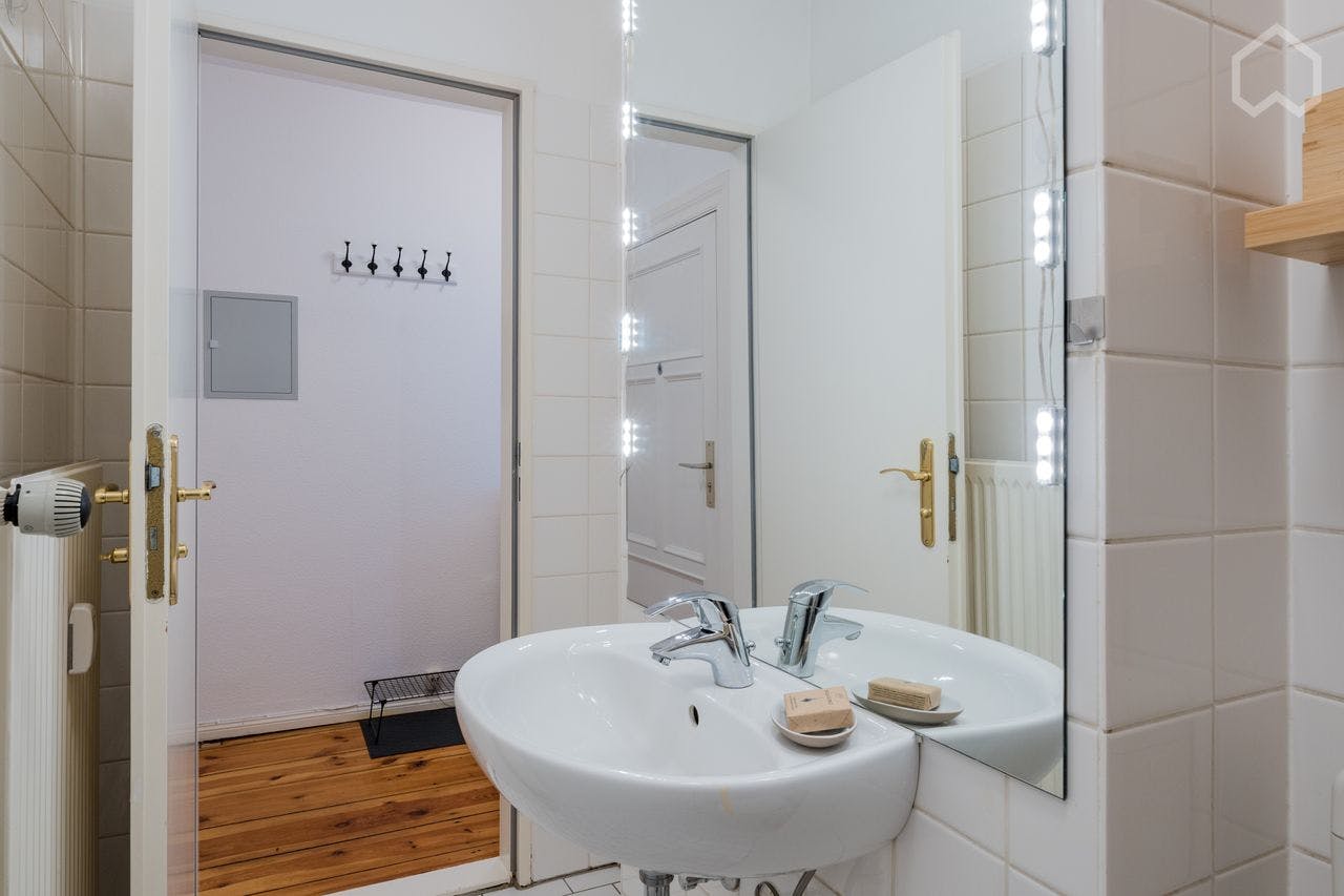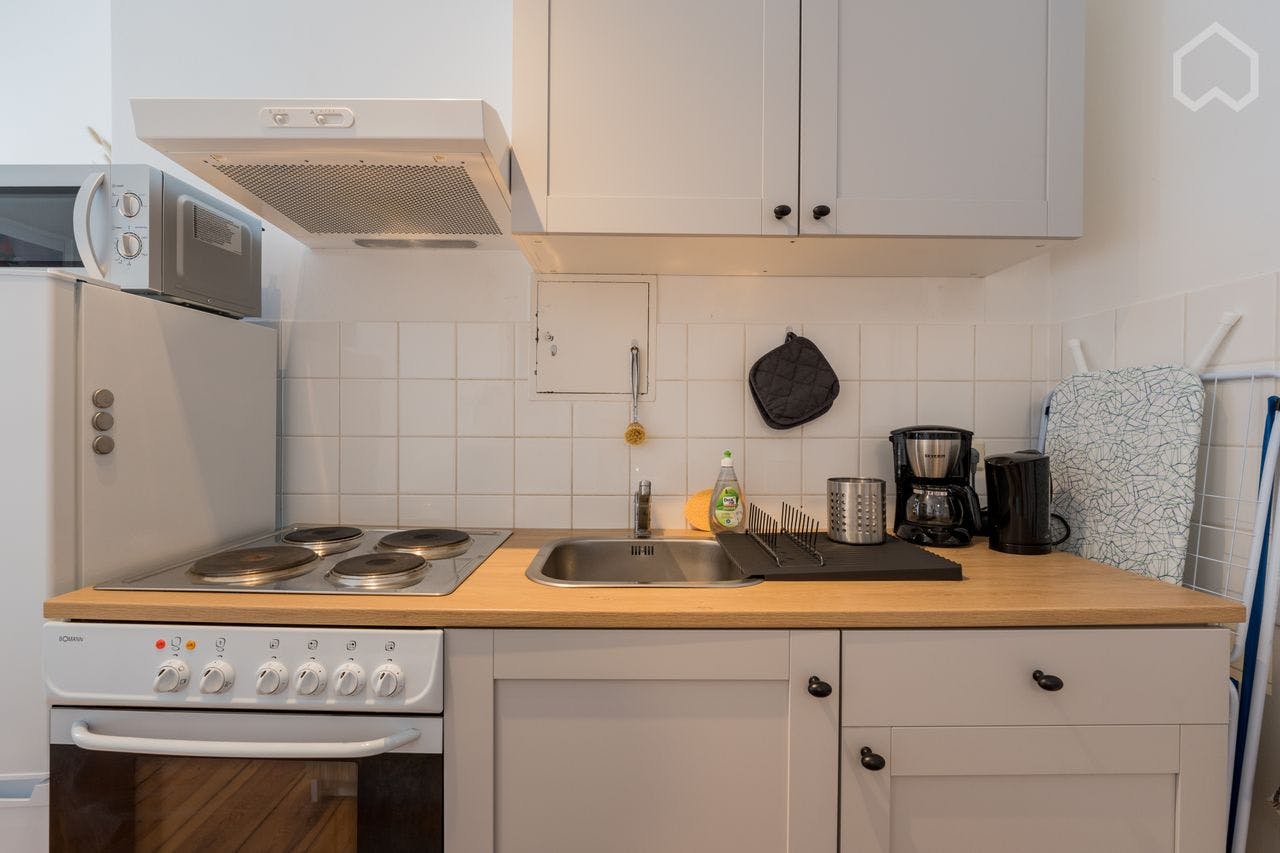This sun-drenched, stylishly furnished flat is located on the 4th floor of a typical Berlin old building in the middle of the trendy Friedrichshain district. The flat is fully furnished, has fast internet and is absolutely quiet due to its location in the first backyard. The living room / bedroom has a comfortable 1.40m wide bed, a cosy sofa and a beautiful antique desk. A modern blackout system and beamer incl. projection screen are also installed. Bedside table, bed drawers and a spacious wardrobe provide sufficient storage space. The modern kitchen is fully equipped with electric cooker, oven, microwave, a large fridge...