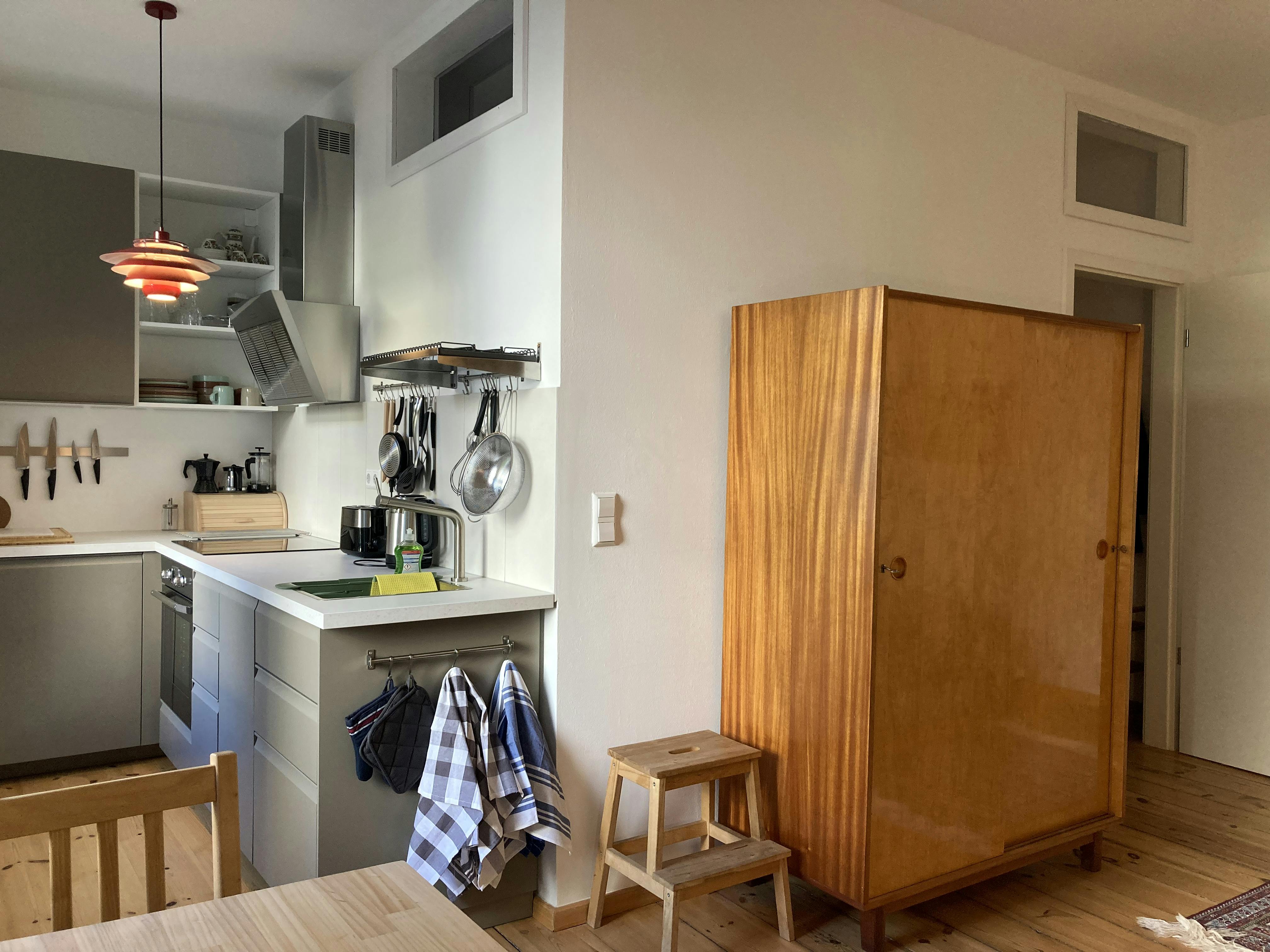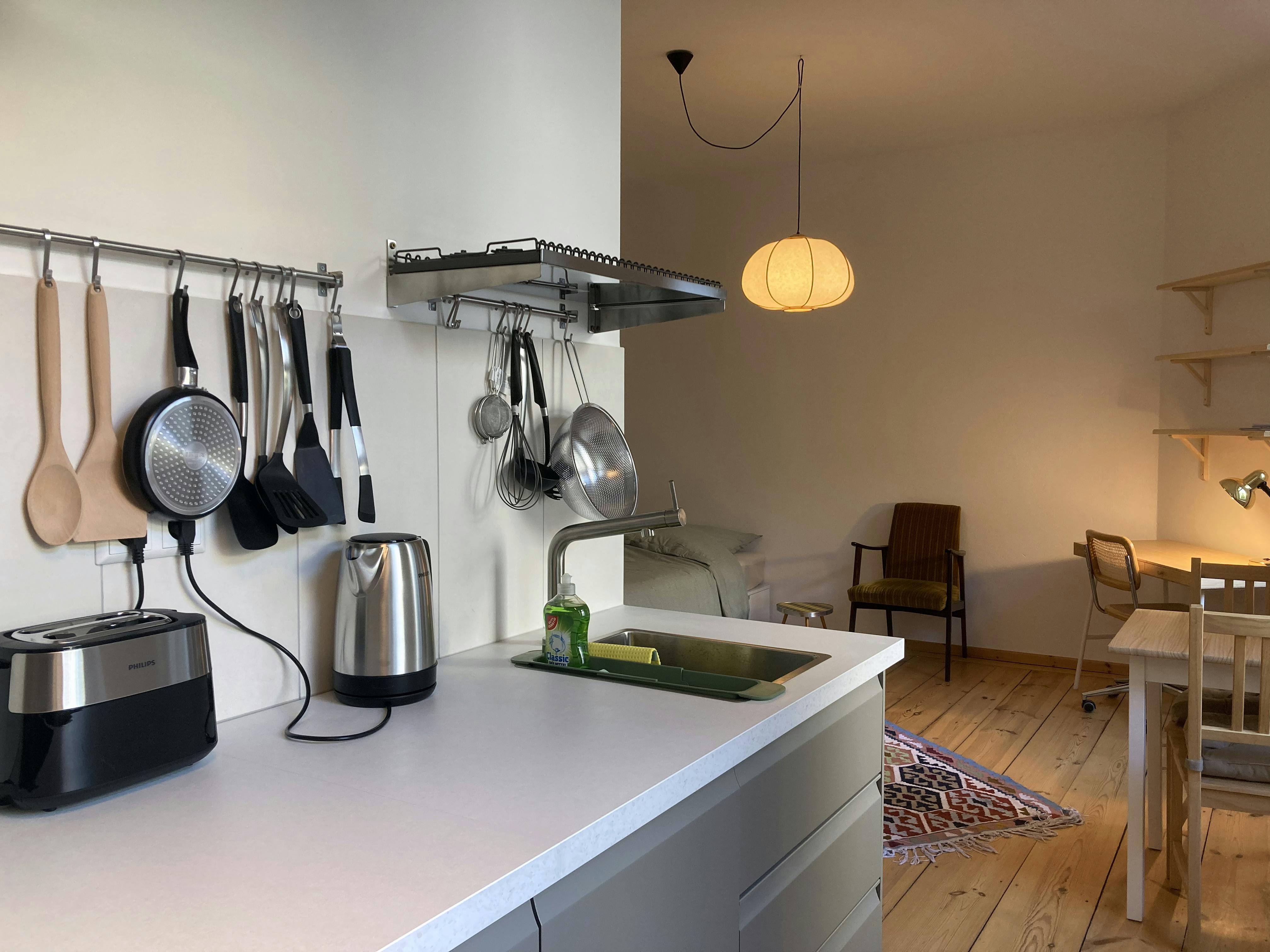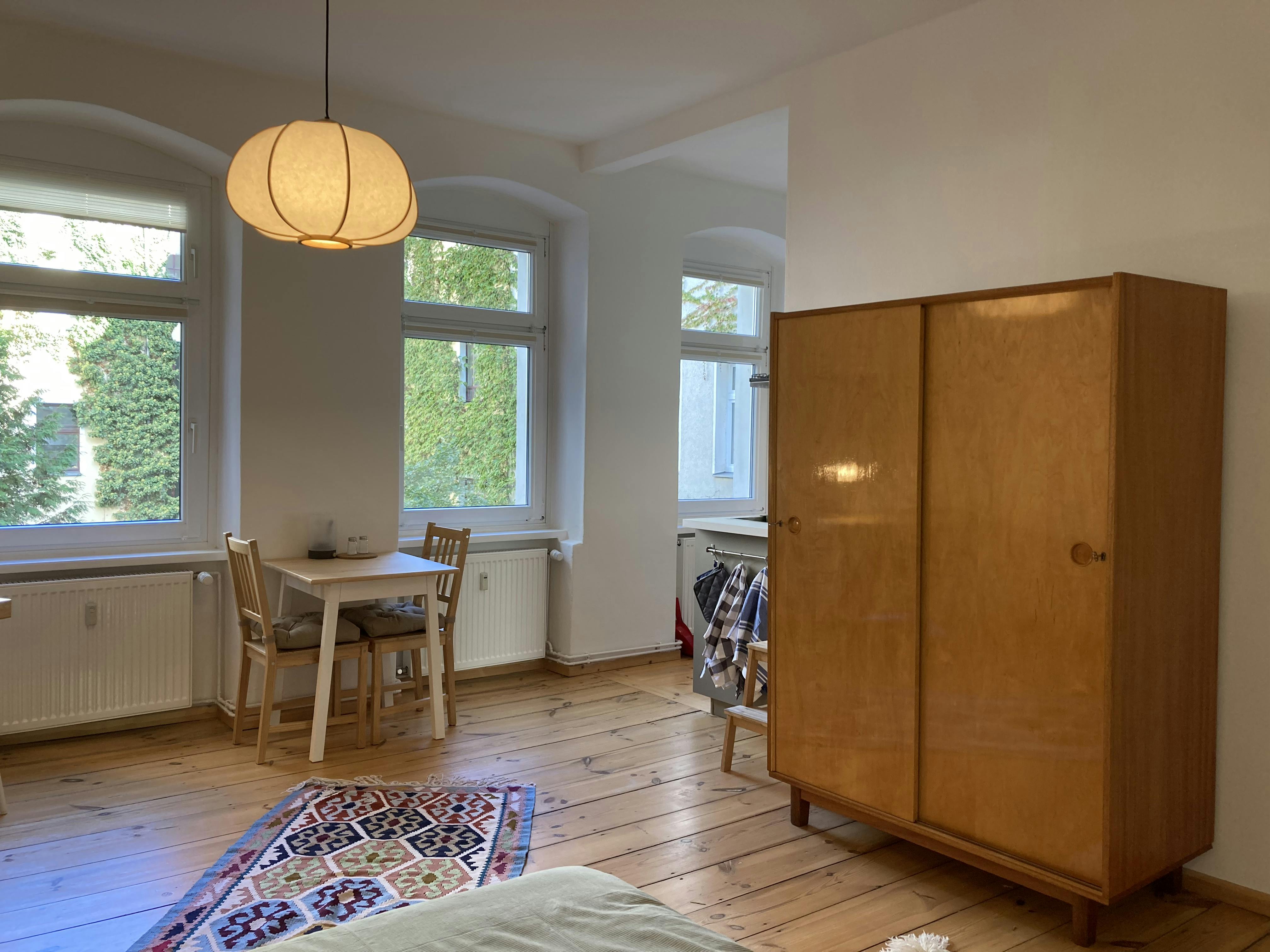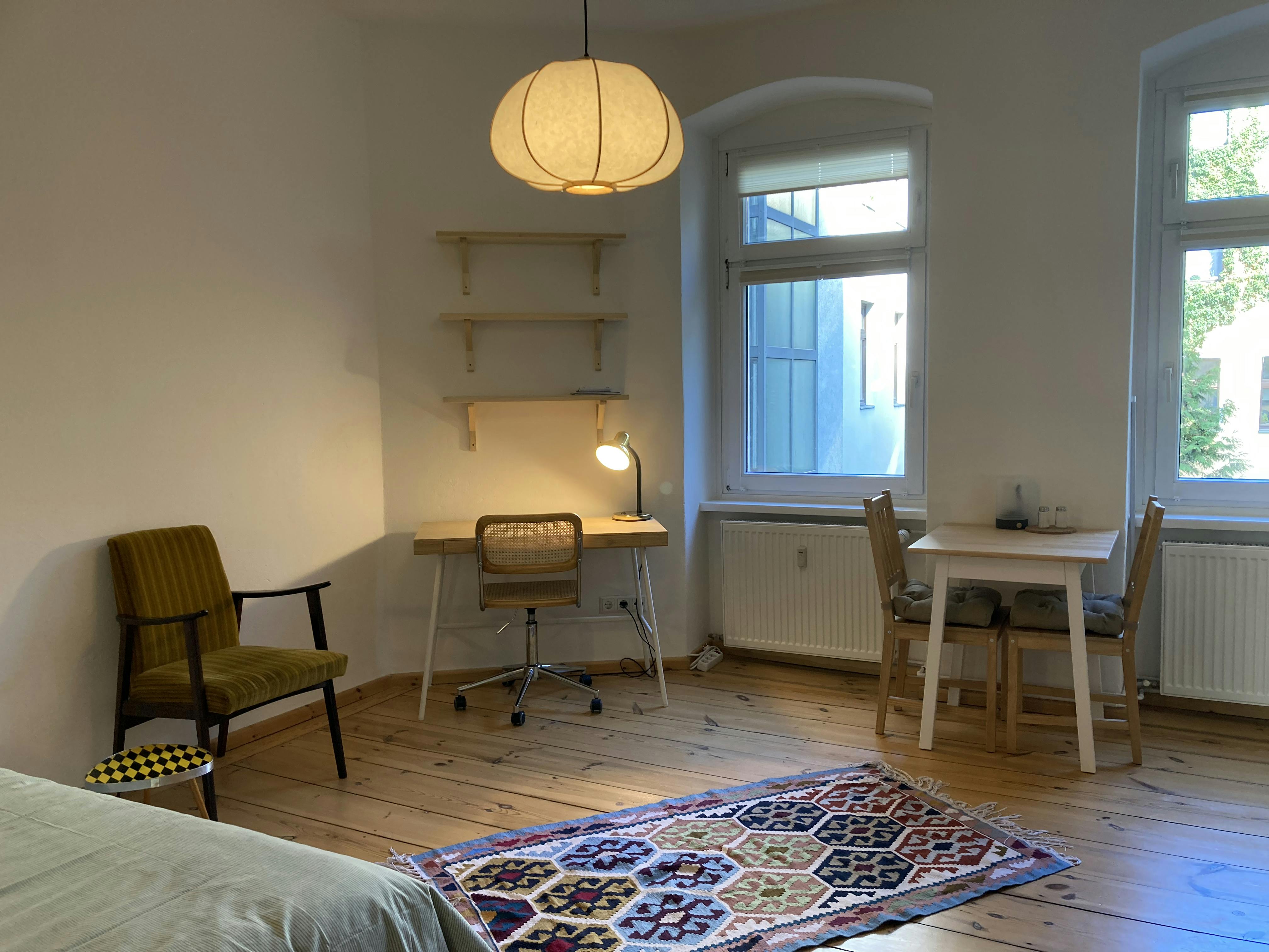 * A confirmation of residence can be given. Newly renovated, cozy and stylish studio apartment in the quiet courtyard of a charming old building in Berlin's most popular district, Neukölln. Renovated in 2024, the apartment combines modern and vintage design and is fully equipped with high-quality appliances and elegant furniture, offering both comfort and character. The property is located in a lively and popular area of Berlin Neukölln, just a 3-minute walk from Hermannplatz. Several bus lines as well as the subway lines U7 and U8 (U7, U8, M41, M29 and more) are in the immediate vicinity. There are excellent connections...