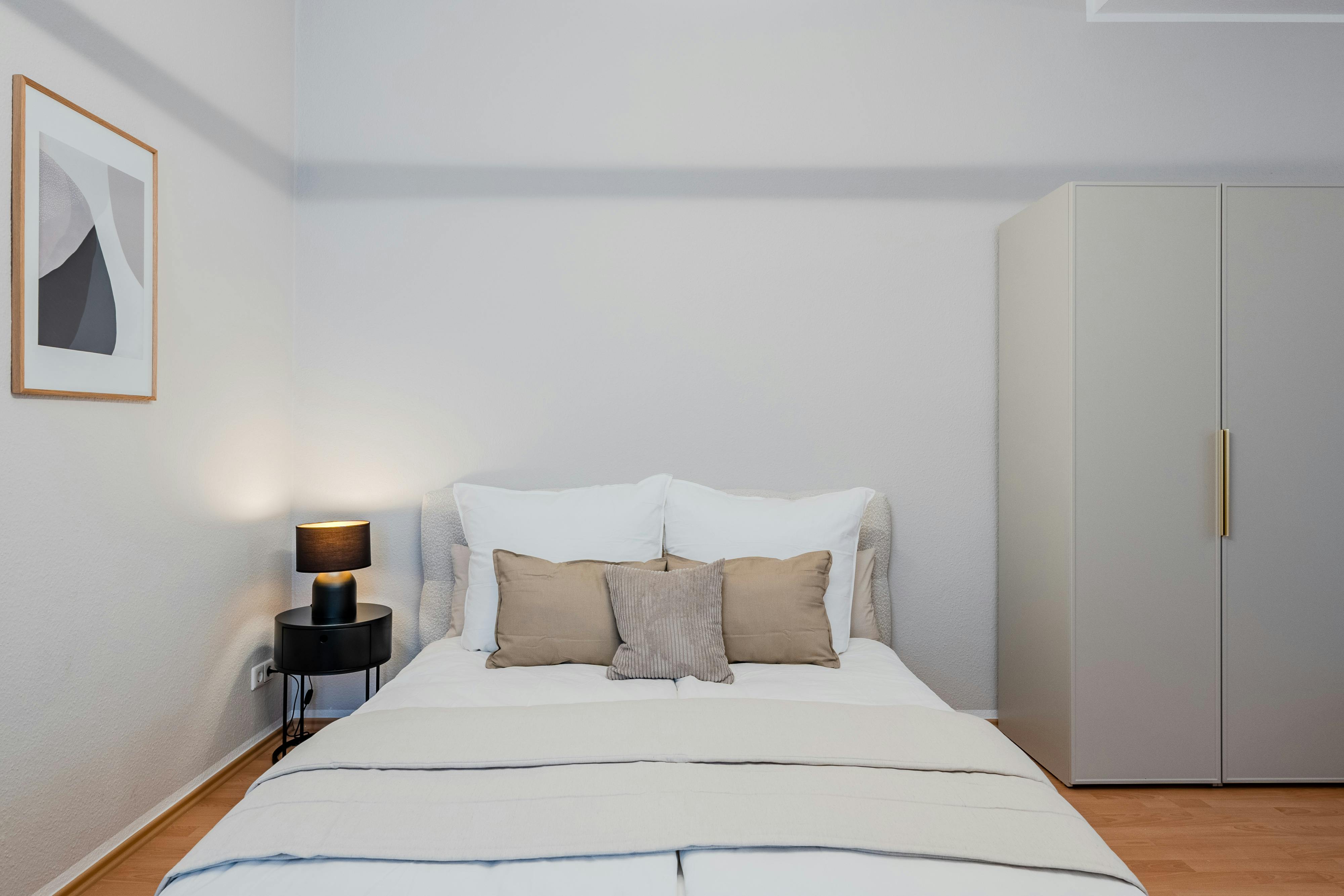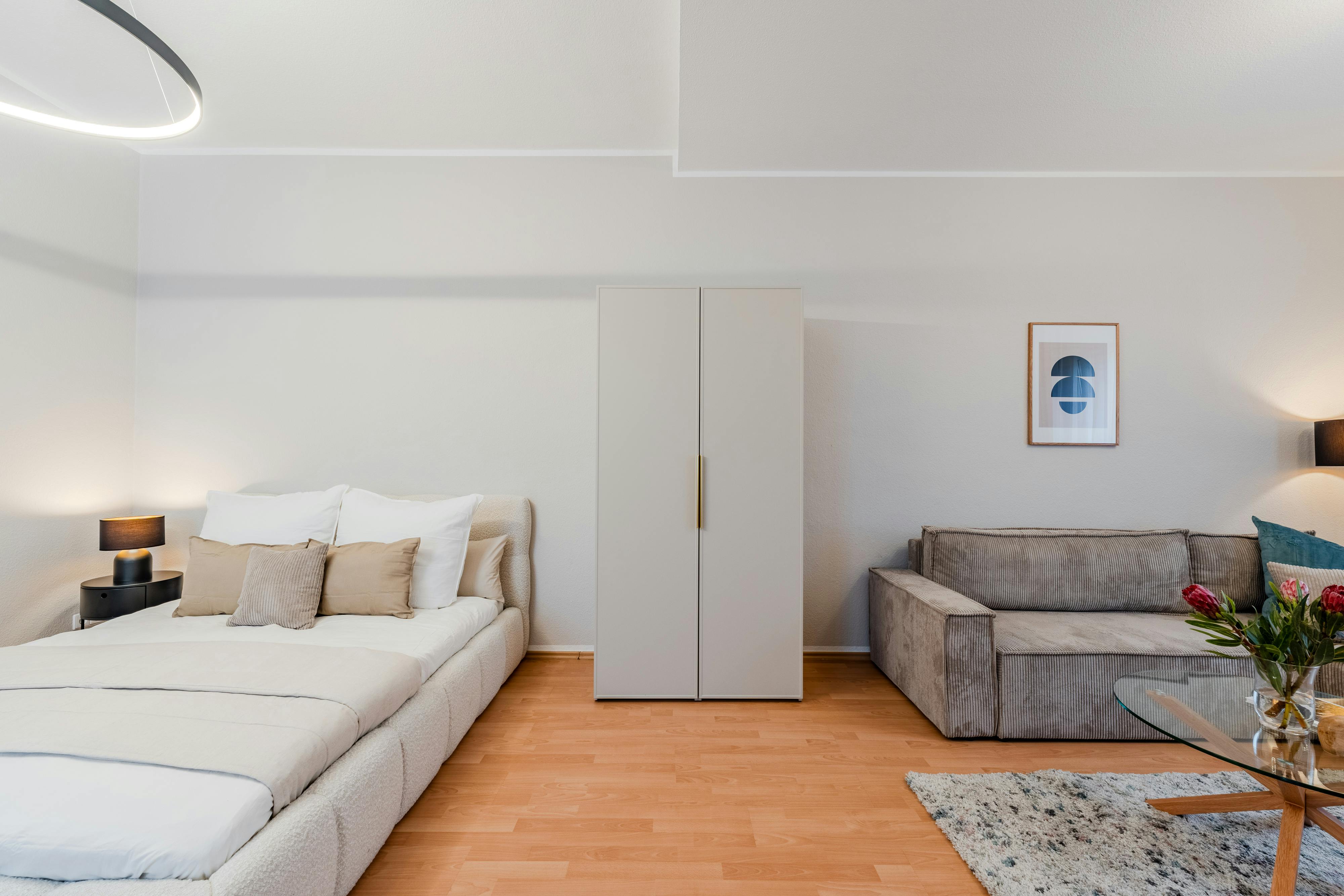 This brand new 46 m2 apartment in the heart of Friedrichshain, Berlin, has been meticulously designed with modern standards, offering an inviting and comfortable living space. The design emphasizes comfort and functionality, providing a well-thought-out living experience for professionals or individuals who appreciate contemporary urban living in one of Berlin’s trendiest neighborhoods. The apartment features an open-plan layout with two distinct areas: the living room and the bedroom. The bedroom area is well defined, furnished with a comfortable double bed, a large wardrobe for storage, and a working desk situated by the window, making it ideal for productivity with natural light...