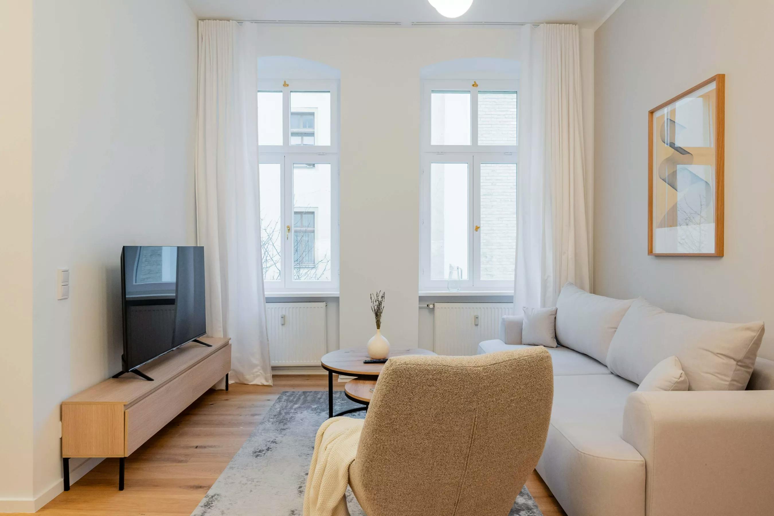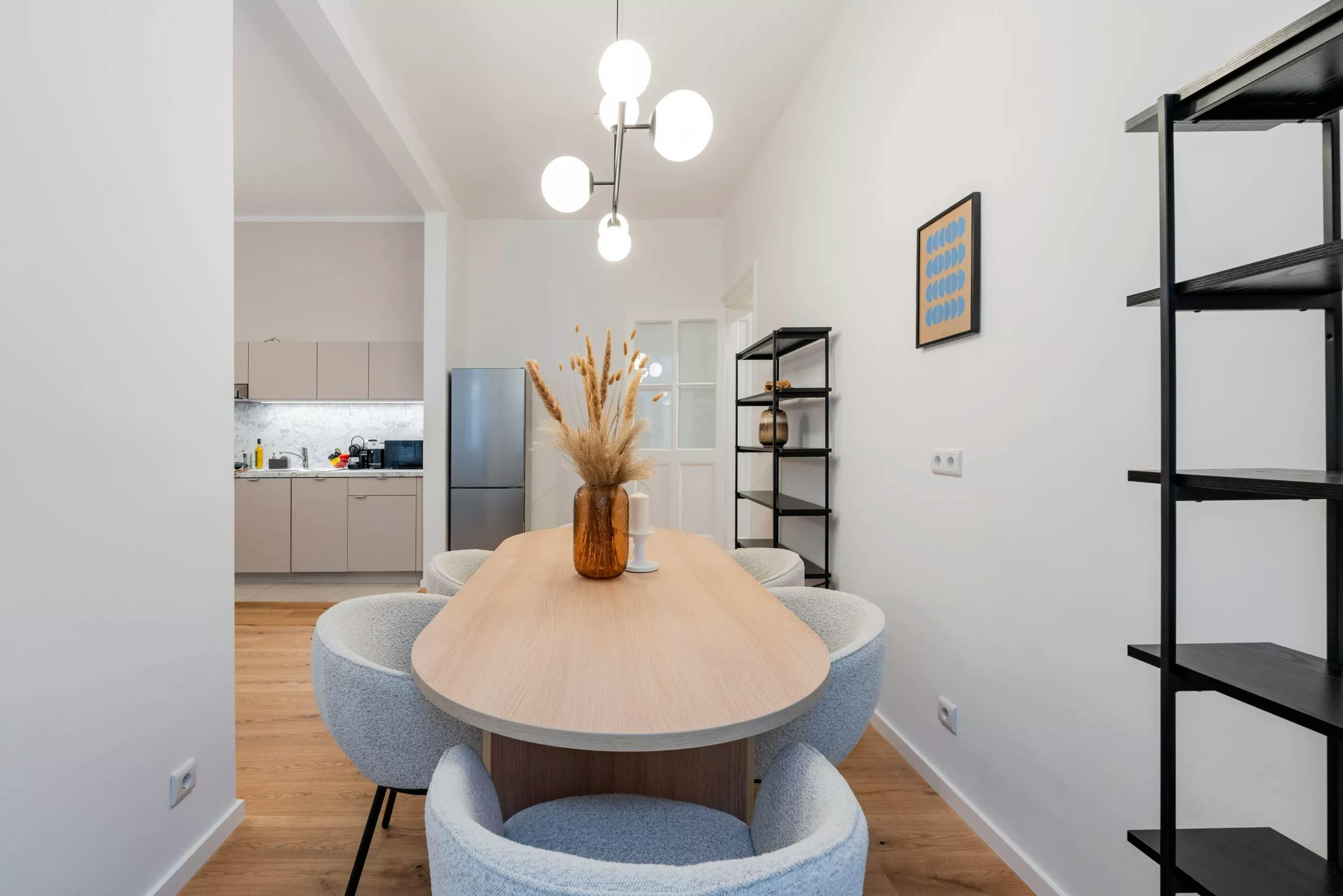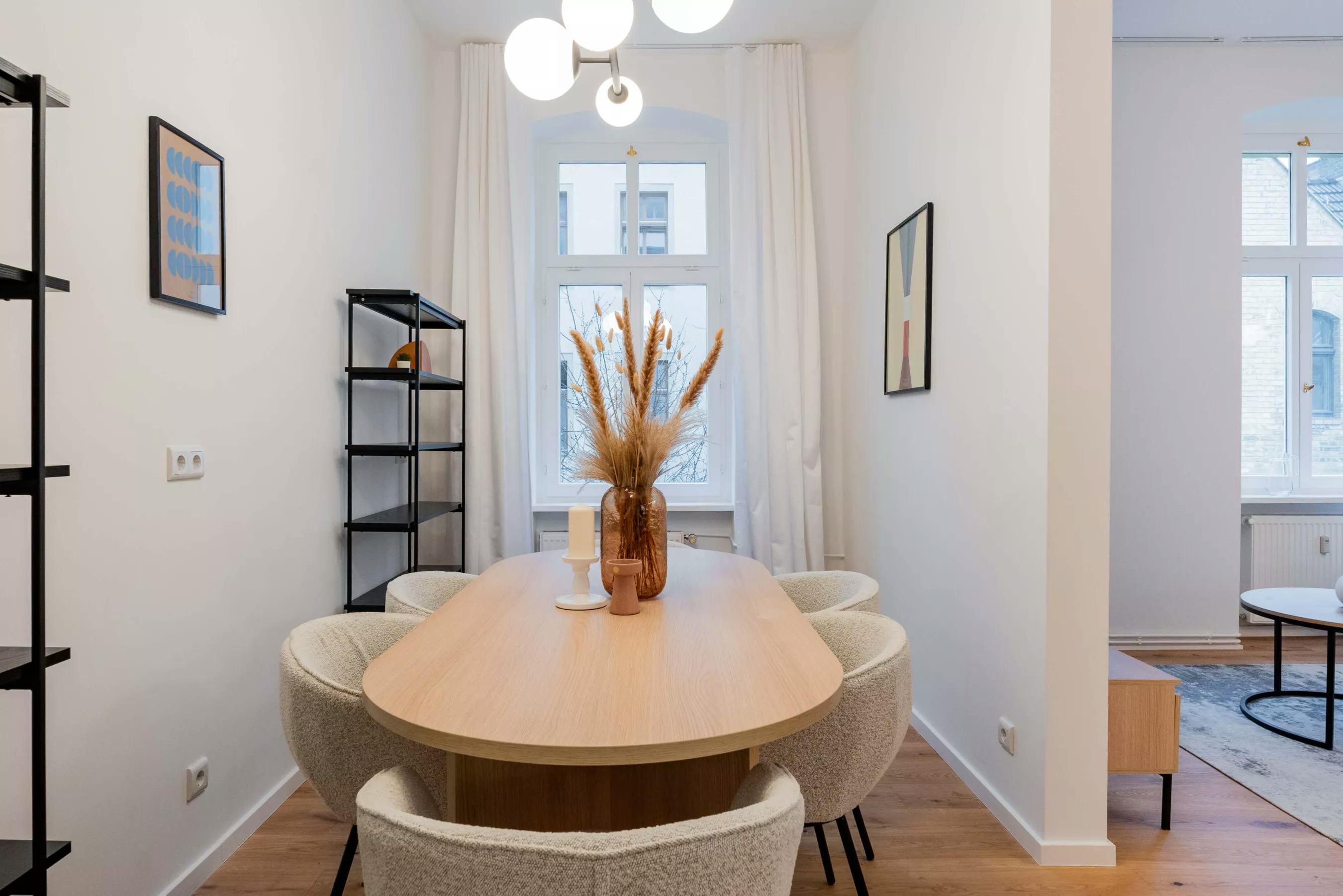 Discover modern luxury in this brand-new, fully furnished apartment in Berlin's Moabit neighborhood. It's designed with a touch of elegance, combining light colors and wood accents for a classy look. Inside, you'll find a spacious bedroom with a comfy king-size bed, a separate work area with a desk and a big wardrobe. The kitchen is fully equipped with modern appliances and is connected to the living room, where there's a large 4K TV for your enjoyment. The bright dining area is not only perfect for meals but also offers two convenient bookshelves for your books or decorative items. The bathroom is...