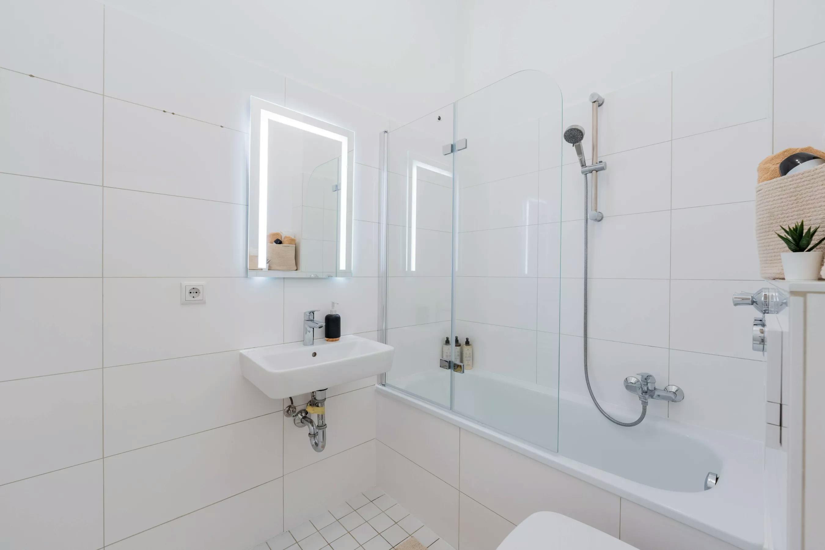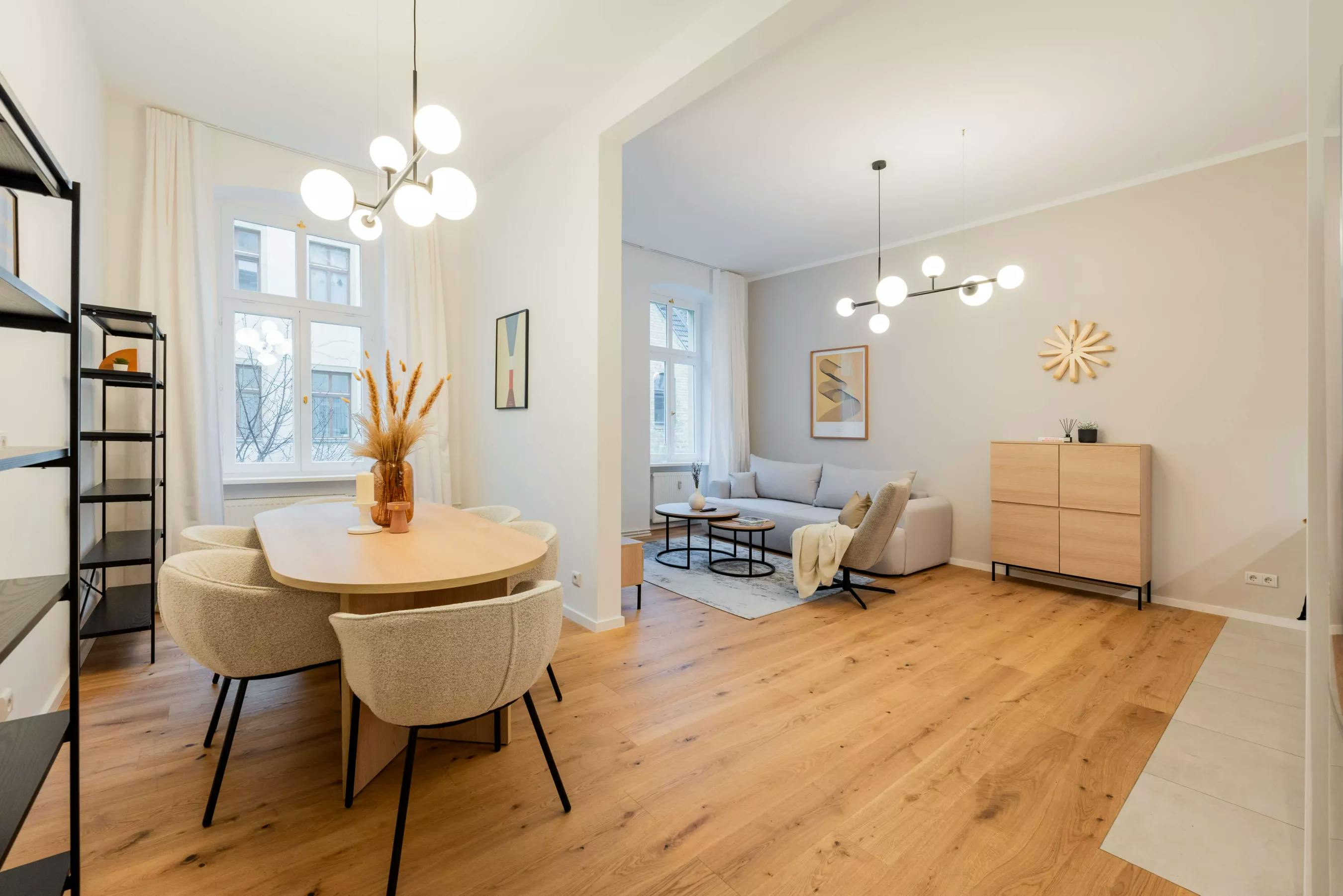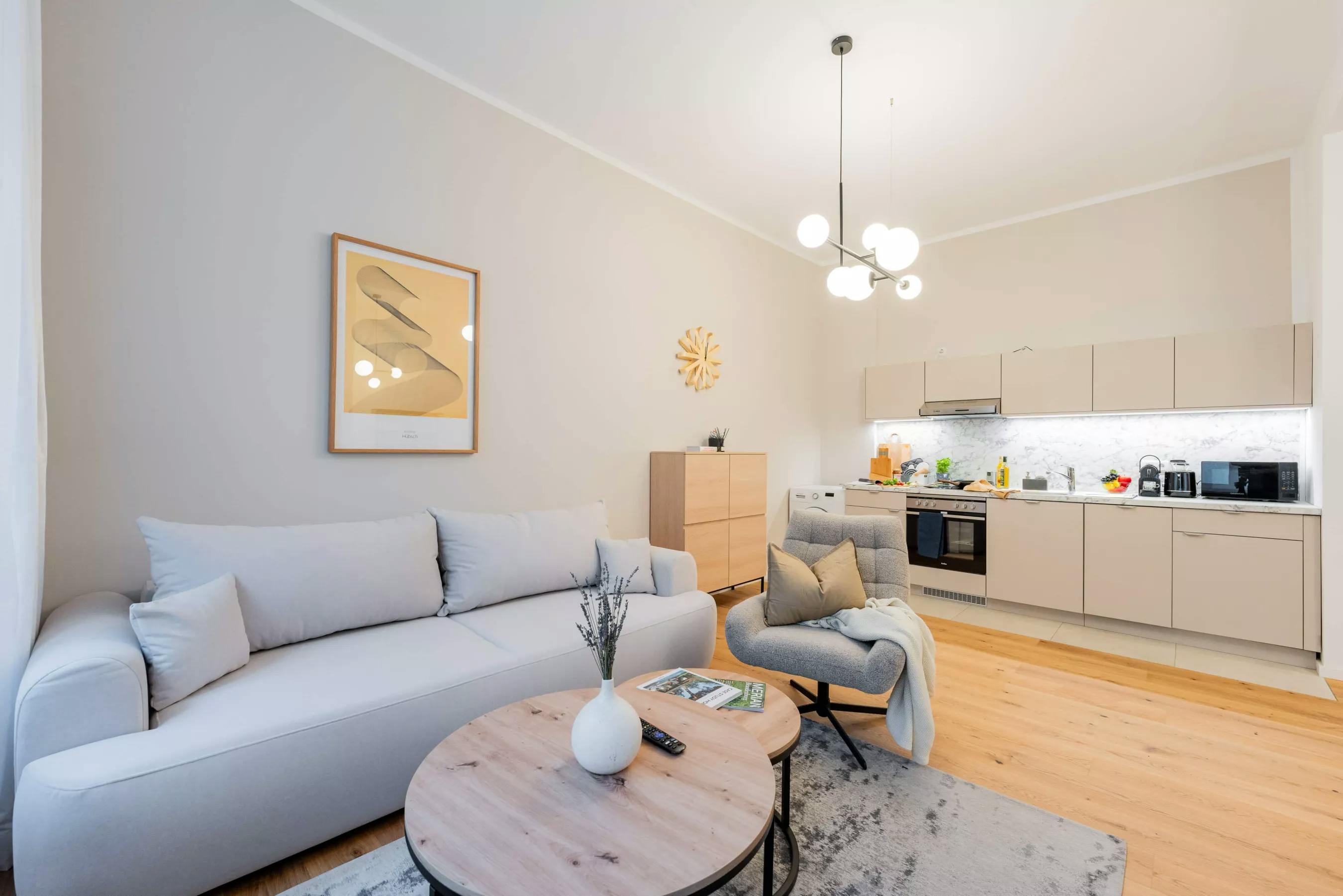 Discover modern luxury in this brand-new, fully furnished apartment in Berlin's Moabit neighborhood. It's designed with a touch of elegance, combining light colors and wood accents for a classy look. Inside, you'll find a spacious bedroom with a comfy king-size bed, a separate work area with a desk and a big wardrobe. The kitchen is fully equipped with modern appliances and is connected to the living room, where there's a large 4K TV for your enjoyment. The bright dining area is not only perfect for meals but also offers two convenient bookshelves for your books or decorative items. The bathroom is...