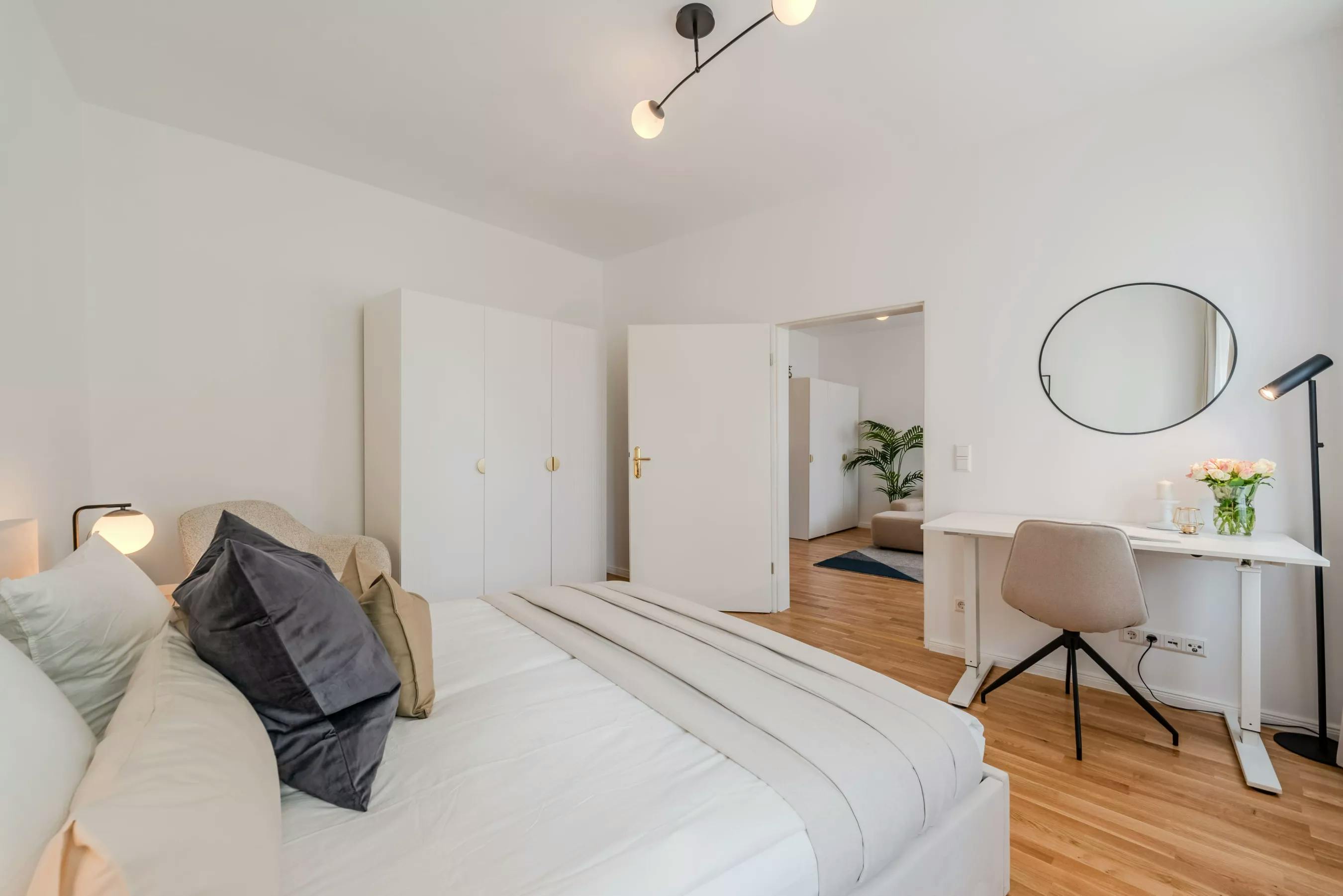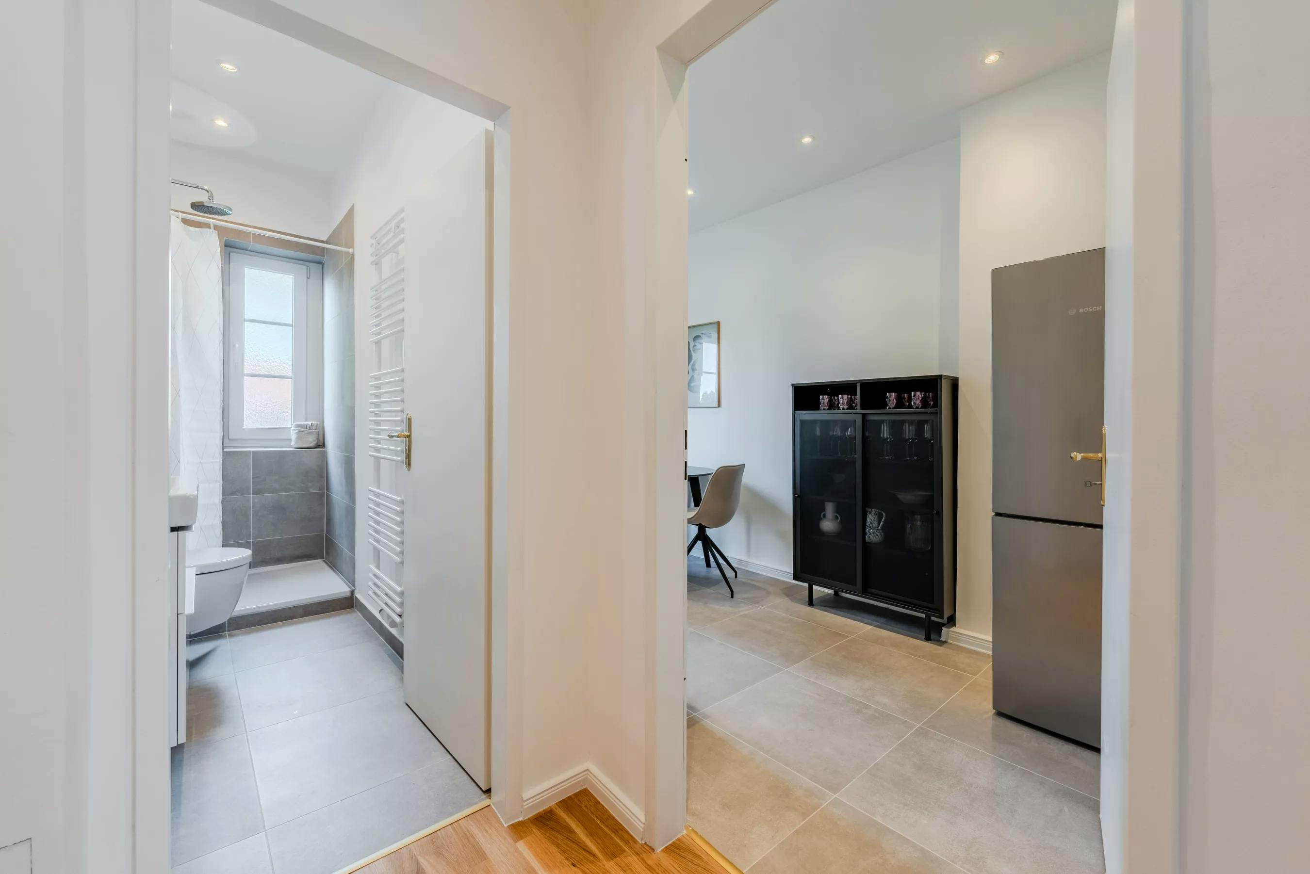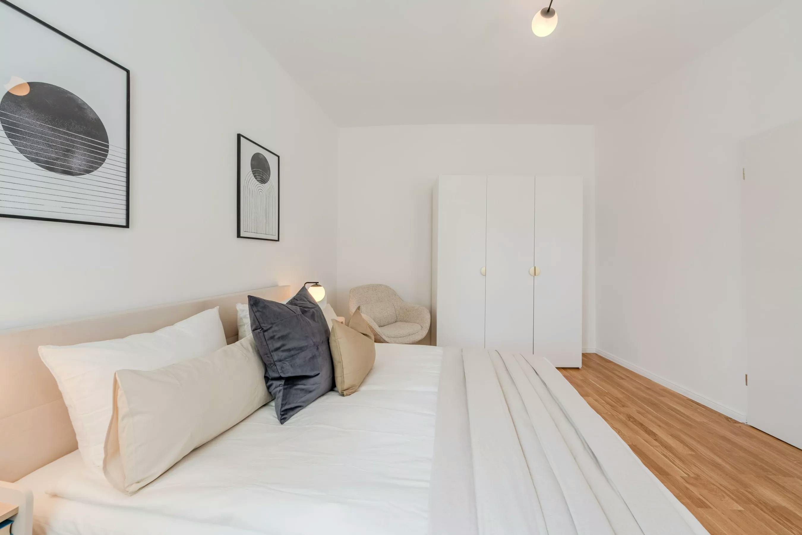 Step into the tranquility of our newly renovated 55 m2 apartment in Zehlendorf, Berlin, ideal for leases under 12 months. This apartment has been meticulously designed with contemporary touches, featuring light beige tones, wood accents, and wooden floors throughout, ensuring a warm and inviting atmosphere. The apartment offers a spacious, well-planned layout. Upon entering, you're greeted by an entrance hall with a designated area for personal belongings. The living room is perfect for relaxation and entertainment, featuring a large sofa that can convert into a bed for an additional guest, a 4K TV, ample shelving, and a full-size mirror. Large windows...