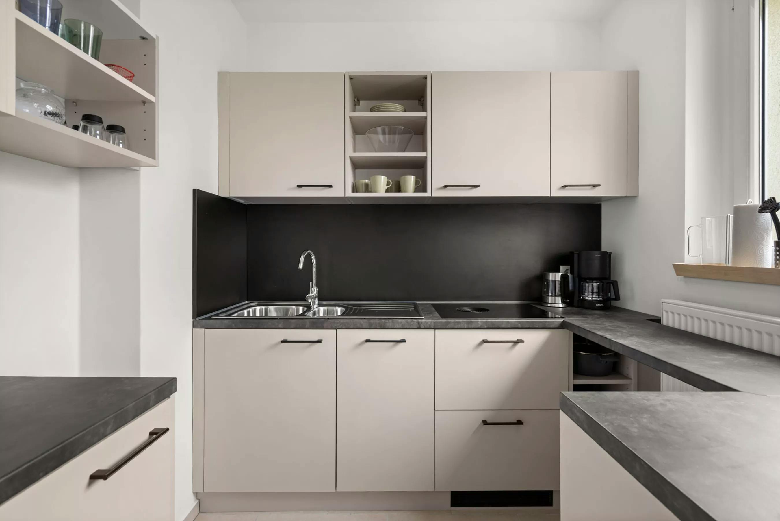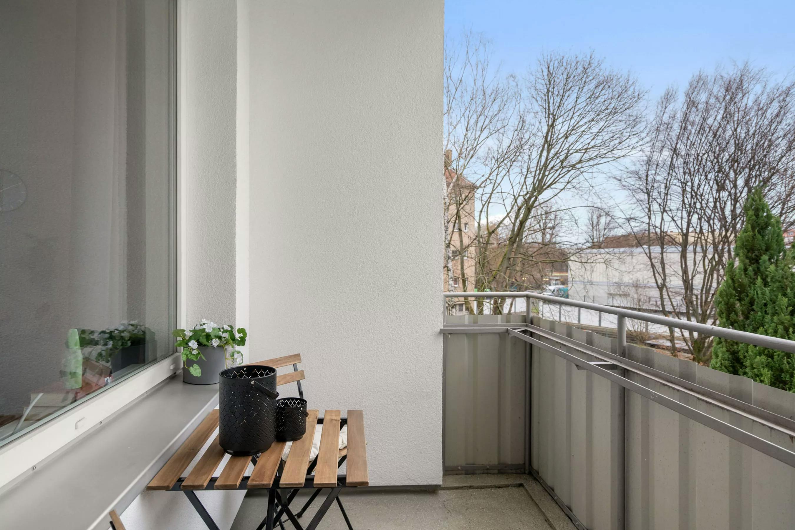 In the southeast of the capital, in the middle of the trendy Neukölln district, you will find a modern single apartment with numerous smart interior solutions. Upon entering the apartment, the attractively furnished hallway immediately catches the eye. The main room offers a cleverly integrated sleeping alcove, custom-made and separated from the rest of the living area by a wall of wooden slats. The living and dining area is characterized by an appealing light-dark arrangement. The compact kitchen is fully equipped and offers ample storage space. The predominantly bright kitchen ambiance gains dynamism through deliberately placed dark accents and feels particularly...