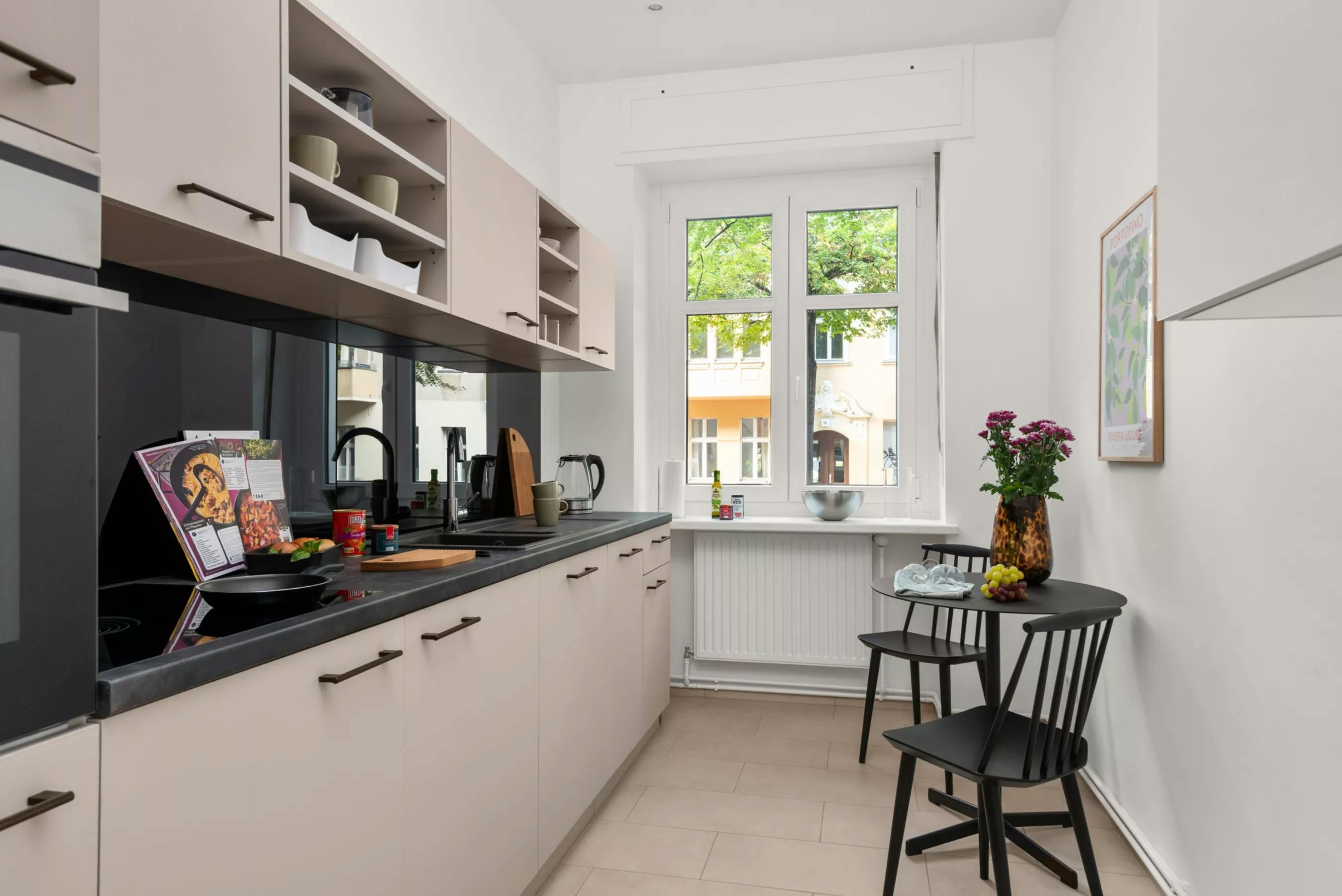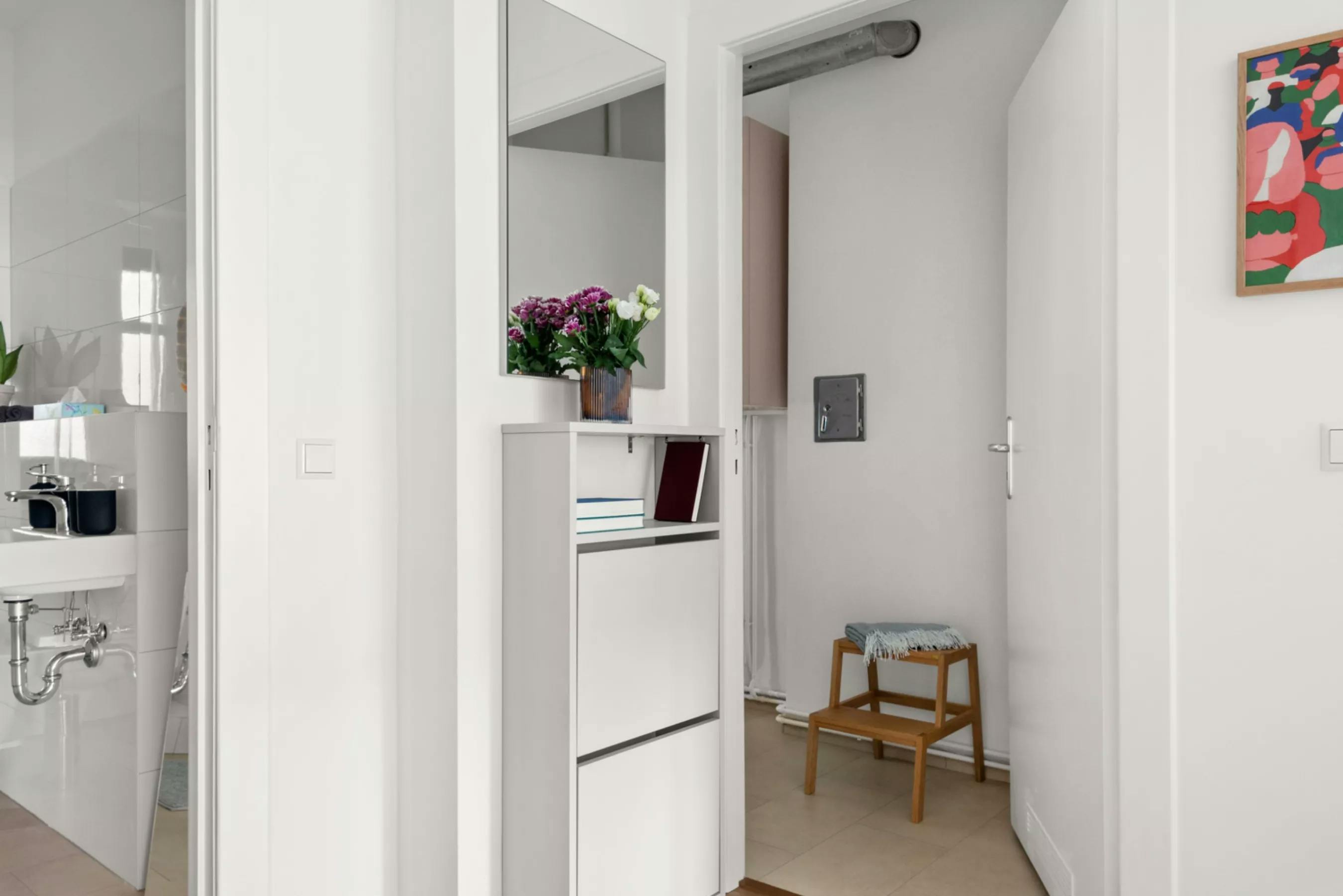Discover modern living in Neukölln, Berlin, with this beautifully designed two-room apartment, perfect for those seeking a stylish and functional home in the city. Located on the mezzanine level, this fully equipped apartment is a gem in one of Berlin's most vibrant districts. Upon entry, a shoe closet with a large mirror immediately offers ample storage for street clothes, leading elegantly to the elongated bathroom. This space features a window and a bathtub, ideal for unwinding after a busy day. Adjacent is the corner kitchen, equipped with an integrated stove and oven, catering to both the enthusiastic cook and those who...