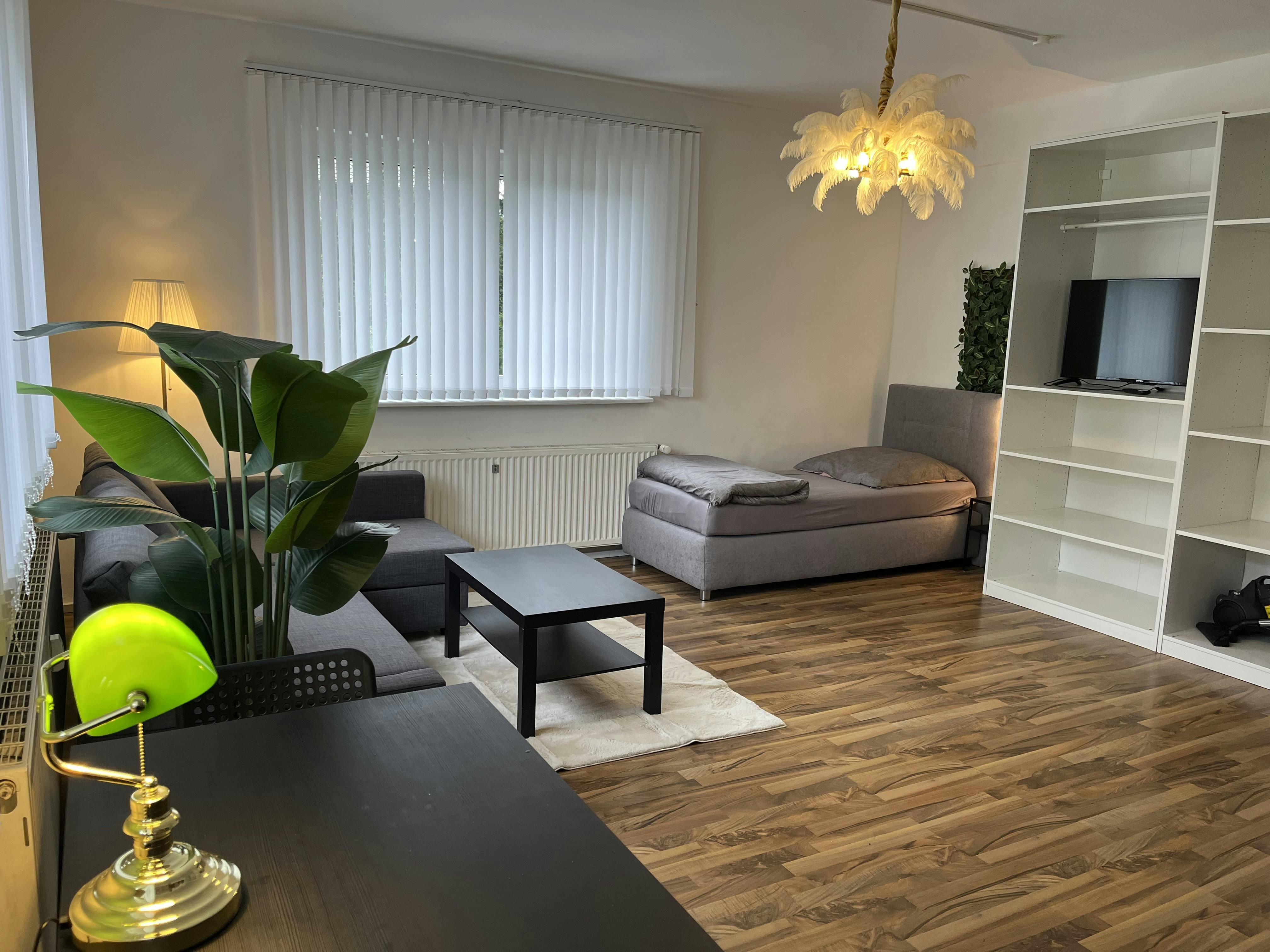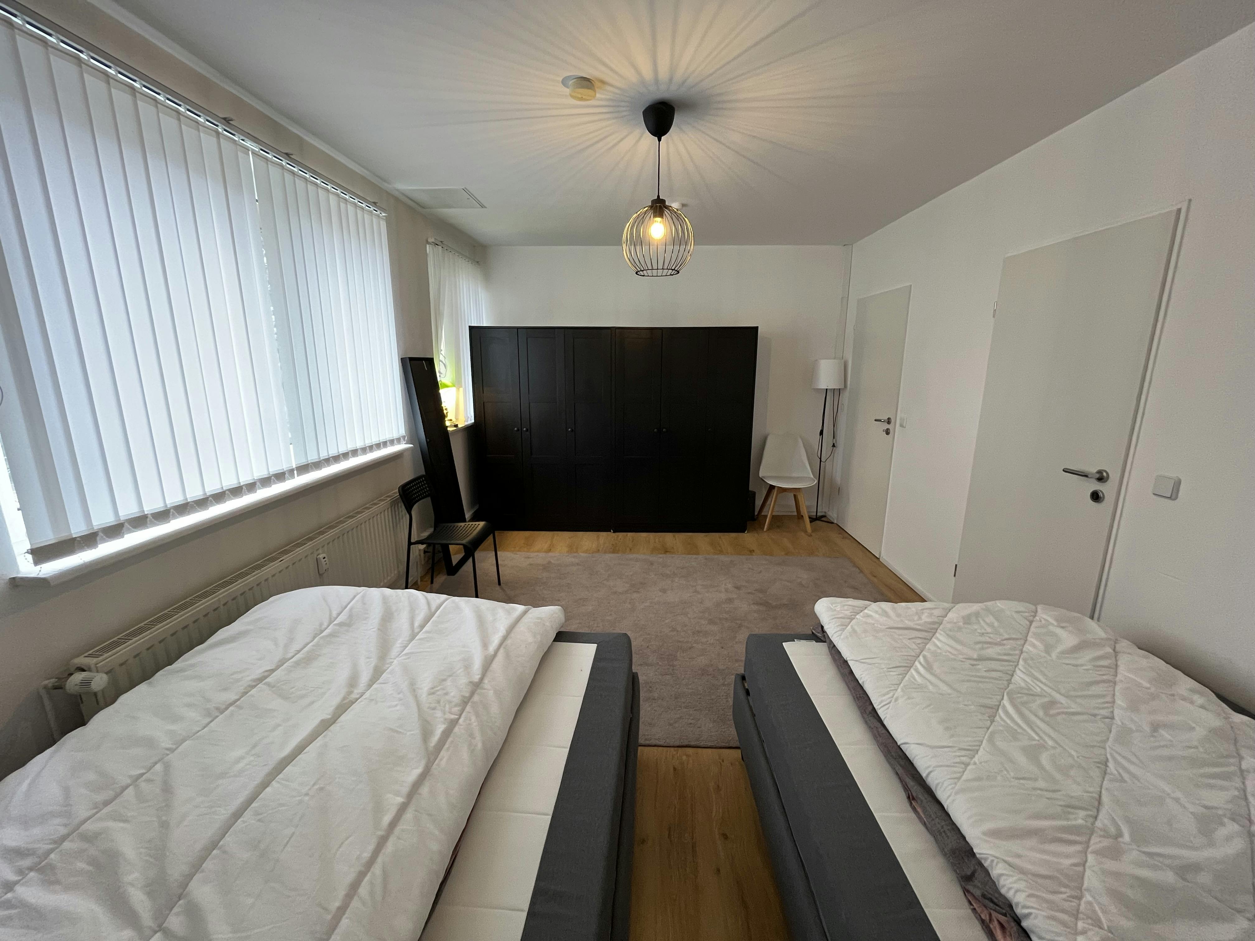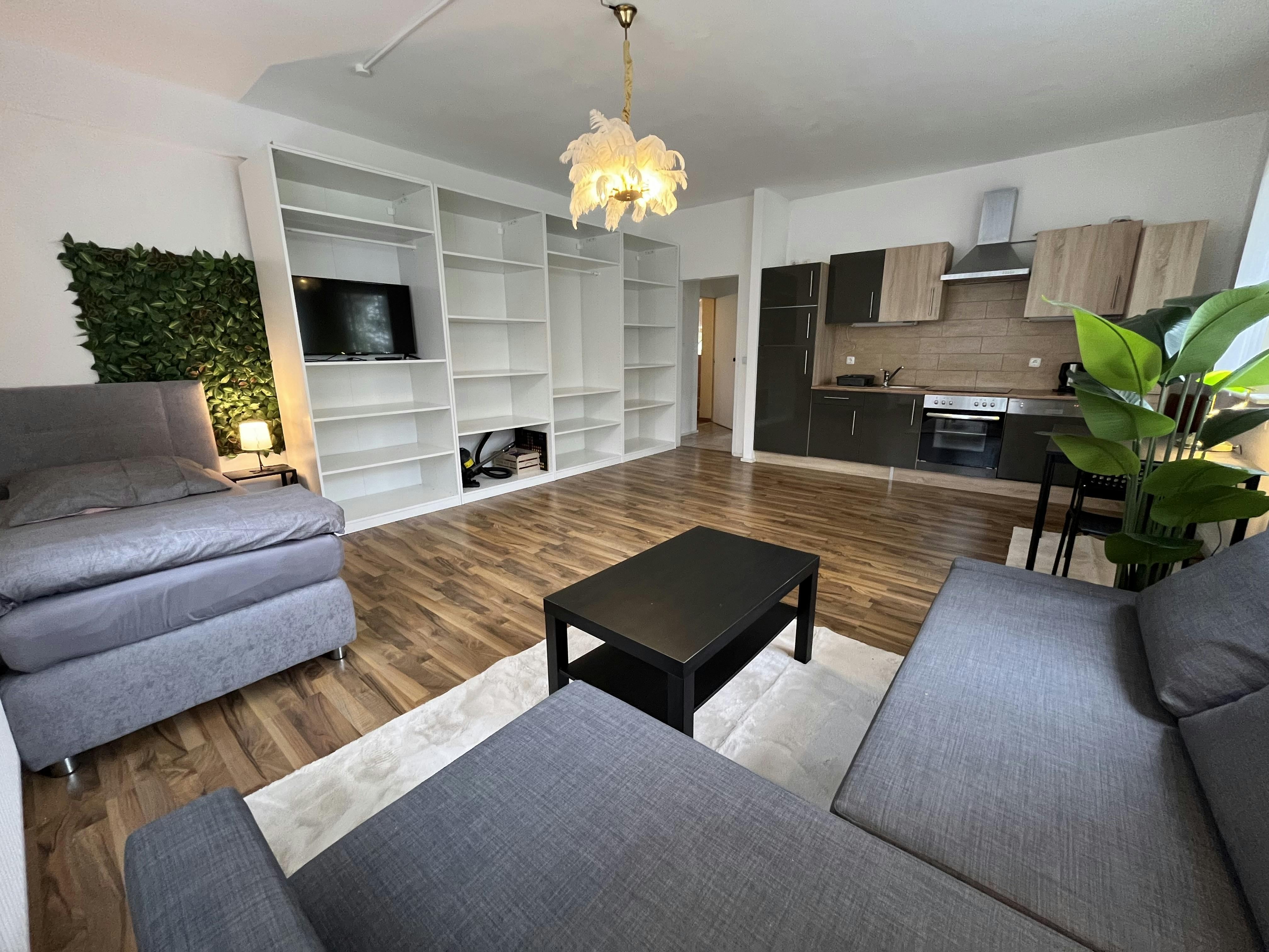 Die 2-Zimmer Erdgeschoss Wohnung ist großräumig und lichtdurchflutet. Im Wohnzimmer befindet sich eine Schlafcouch gegenüber liegend ist ein riesen Kleiderschrank mit Smart TV und daneben bei Bedarf ein Boxspringbett. Dazu ein Esstisch für zwei. Die Einbauküche im Wohnbereich enthält einen Kühlschrank, eine Spülmaschine, ein Herd, Backofen, Dunsztabzugshaube und alle Kochuntensilien. Ebenfalls befinden sich 2 neue Boxspringbetten im Schlafzimmer mit einem großen Kleiderschrank. Das Bad mit der Badewanne kann man durch die separaten Eingänge durch den Flur oder durch das Schlafzimmer betreten.