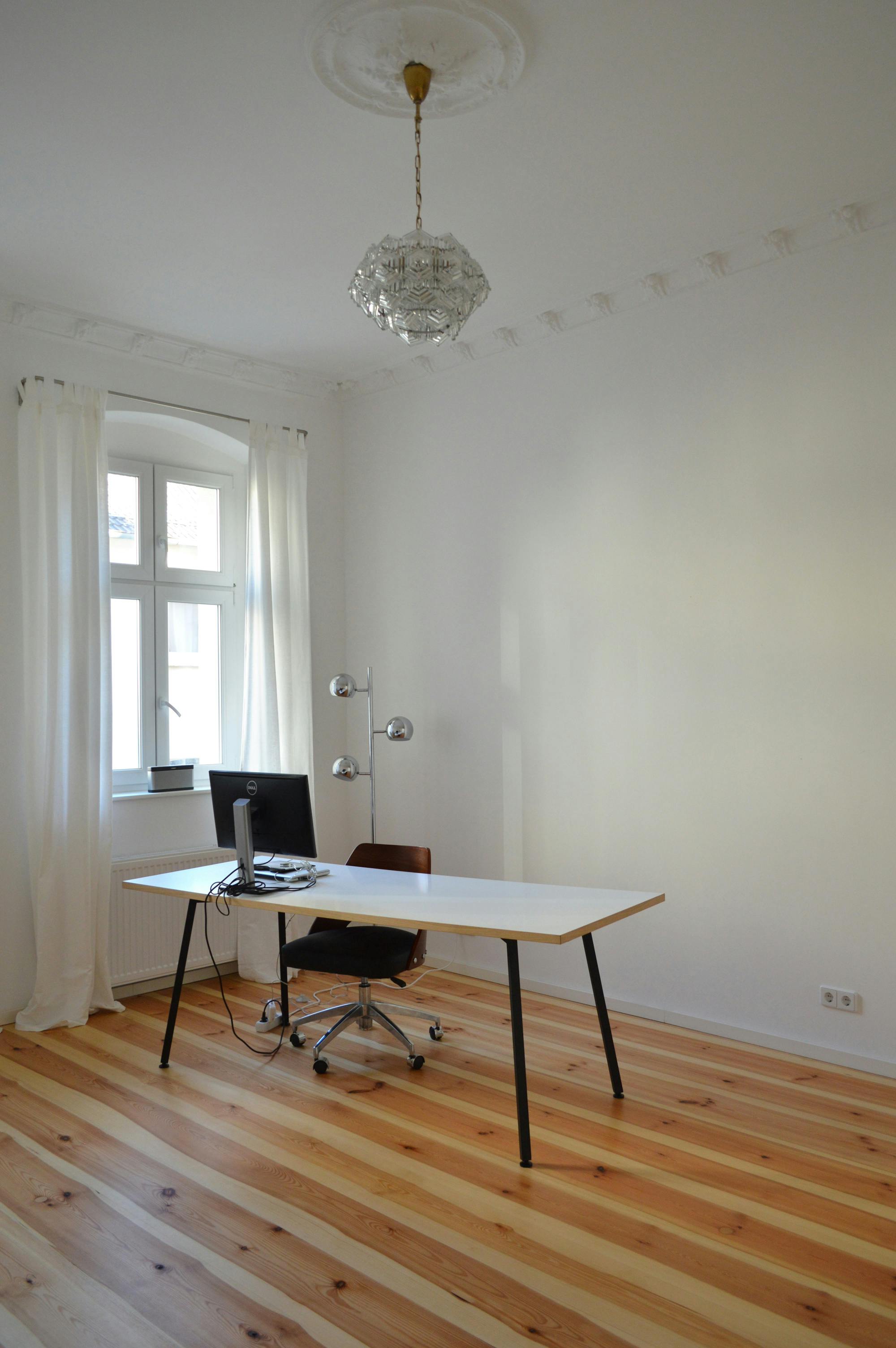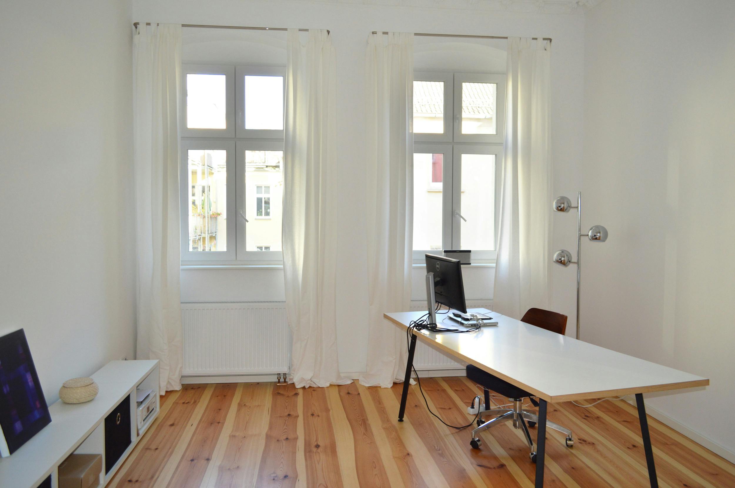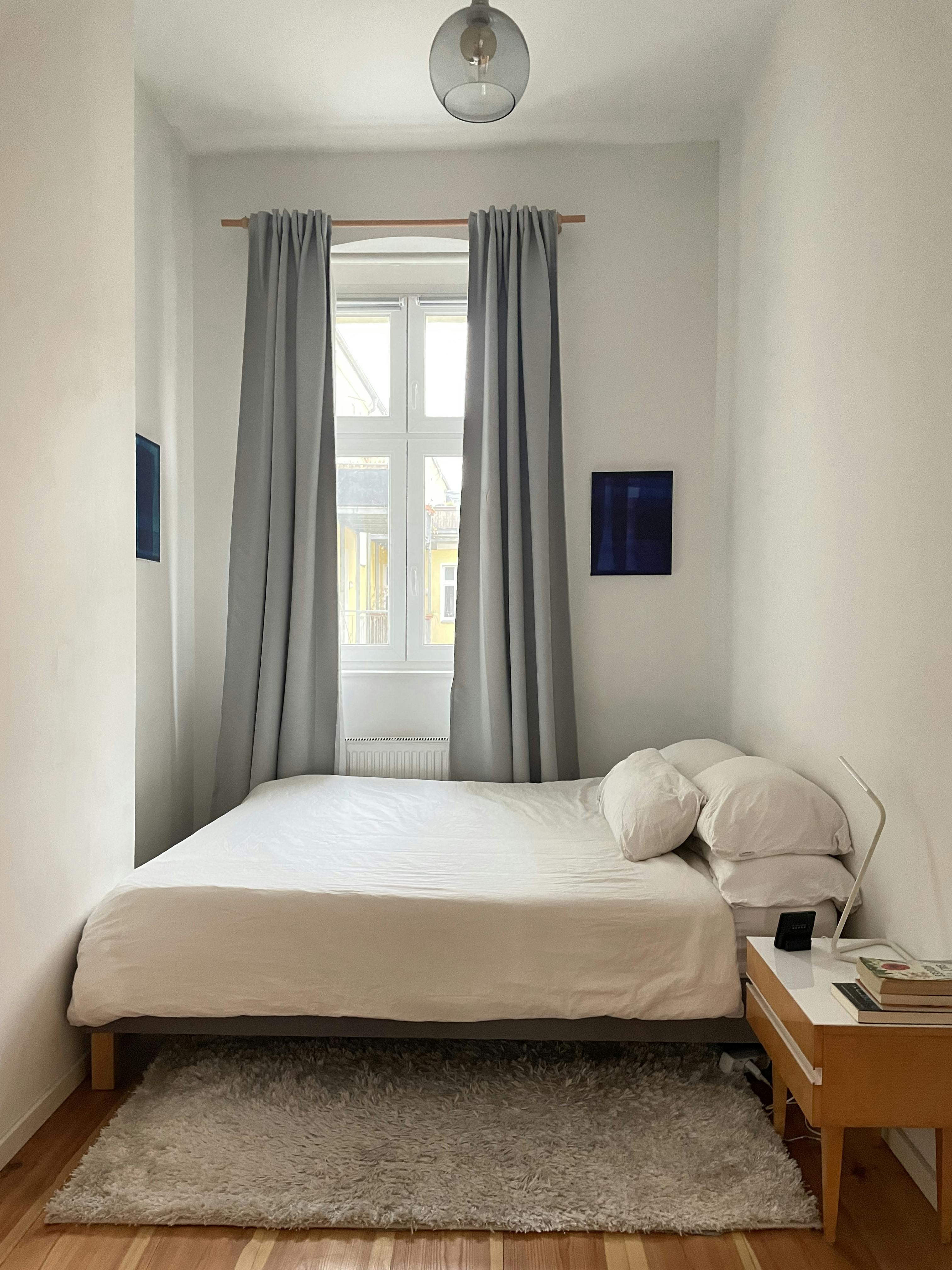 Beautiful, newly renovated, sunny 1BR apartment with a large office and fully equipped open kitchen with a dishwasher and washing machine. The bedroom with a 160 x 200 bed and office are quiet facing the back. The bathroom has Villeroy and Boch fixtures, and the living room has a small balcony with a beautiful view. It is minimally and tastefully furnished (no Ikea!), and has all the comforts you need. The high ceilings, stucco, wooden plank floors, and balcony make it a charming typical Berlin Altbau. It's right across from Petersburger Platz, a charming square with a few...