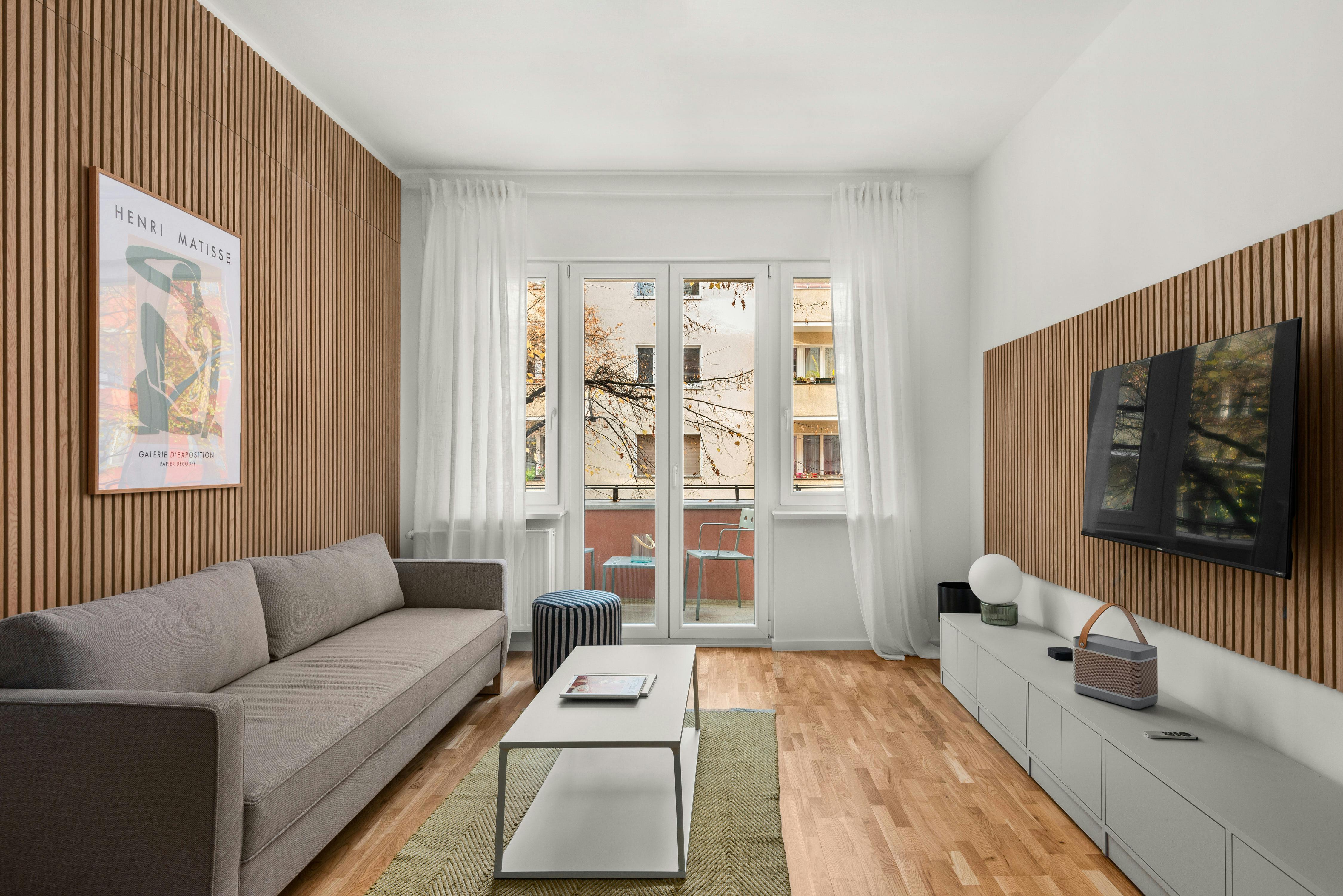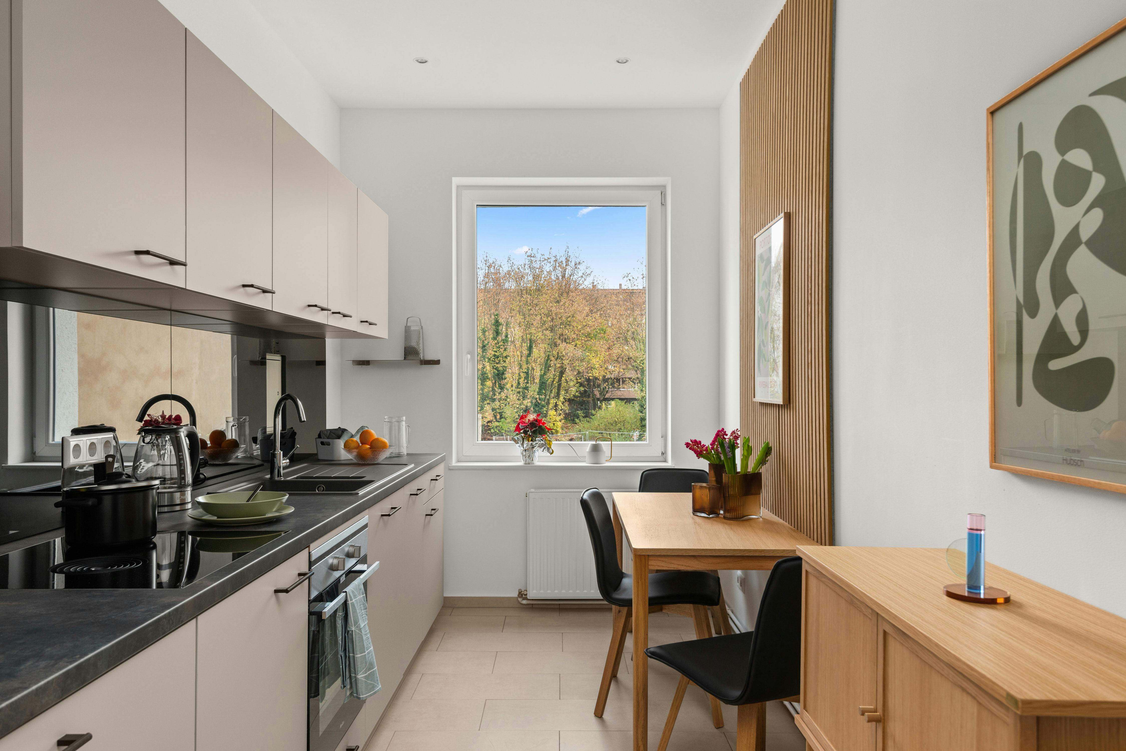 This refurbished flat has everything you need to feel right at home in Berlin. Current design trends and clean lines characterise the two-bedroom flat, which is located in one of the capital's trendy districts. The 60-square-metre flat is not only very tastefully furnished, it also looks much larger than it is. Much of the stylish design furniture was specially made for the individual rooms, so that the available space is used in the best possible way. As a result, you have a lot of storage space available in the bright, light-flooded rooms. Comfort and functionality are the criteria according...