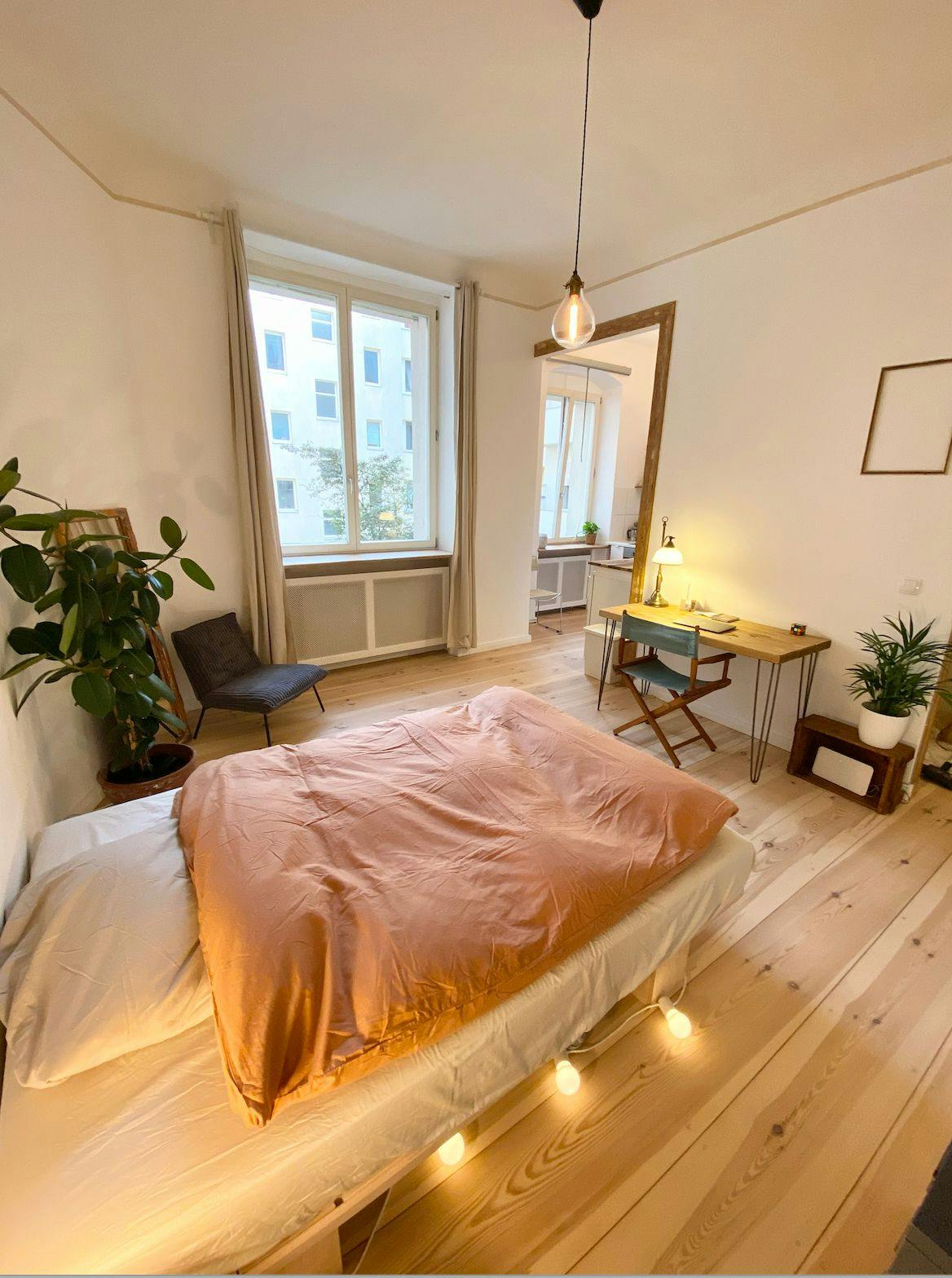 This bright 32 m2 studio apartment is located in a quiet residential area in the heart of the vibrant, multicultural and hip Berlin district of Neukölln. Tempelhofer Feld can be reached in approx. 5 minutes on foot. The recently renovated studio is located in an old building. The original wooden floor has been brought back to life throughout the apartment. The interior design reflects the artistic and industrial DIY aesthetic typical of the German capital. The furnished apartment consists of one room divided into a bedroom, living room and desk/work area; adjacent is the bathroom with bathtub. The living area offers a...