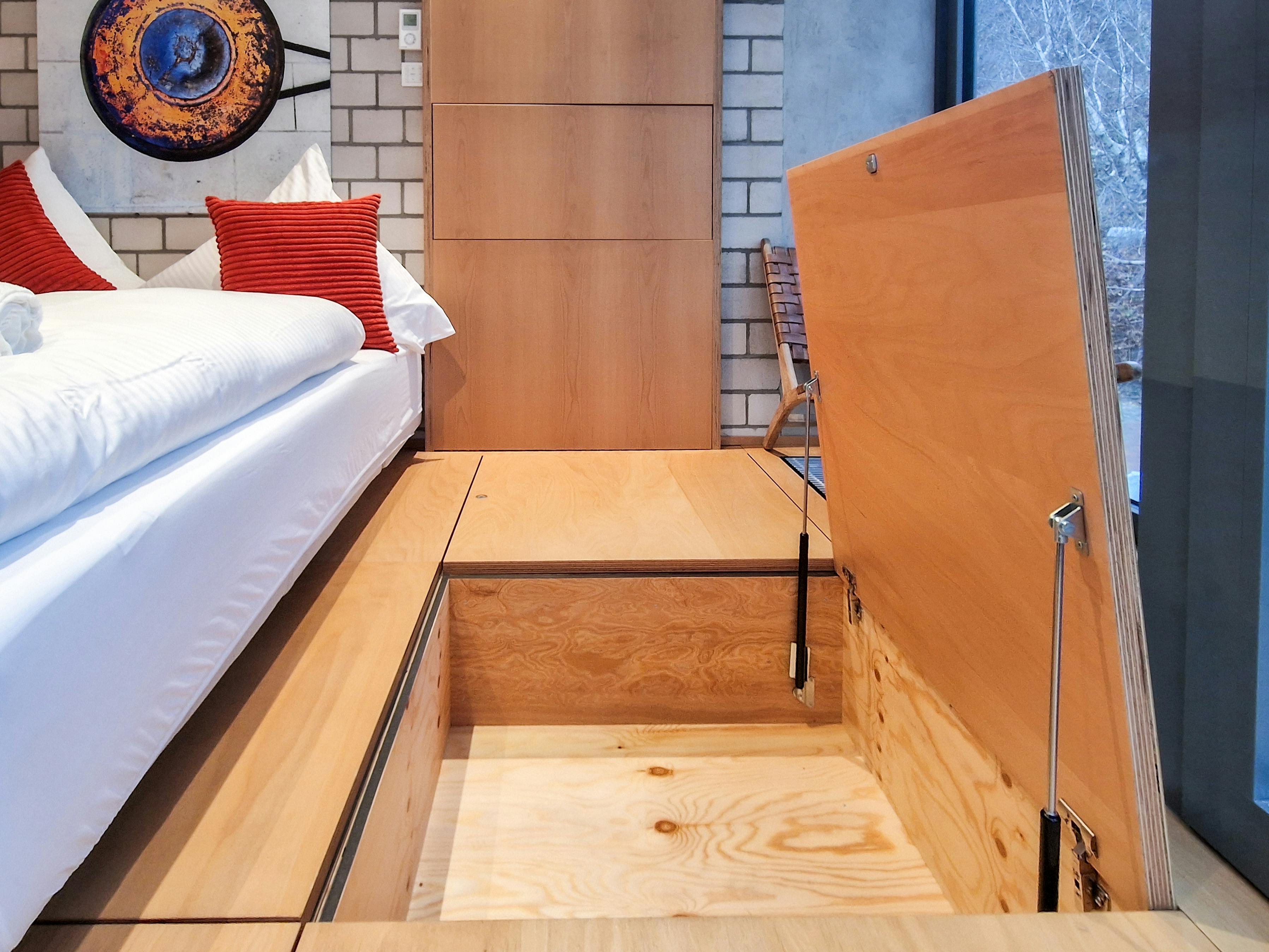 This stylish maisonette apartment offers modern comfort and innovative design. Downstairs, the open-plan living area includes a fully equipped kitchen (oven, microwave-combi, mobile cooking field, dishwasher, compact fridge) and efficient underfloor heating. A large rooftop window above the stairs and a glass section of the upstairs floor ensure the kitchen is bathed in natural light. Upstairs, the bedroom opens onto a small terrace, offering a private outdoor space. A fold-down desk is conveniently located next to the bed, perfect for work or study. The bathroom is equipped with a shower. The apartment also features clever storage solutions, with a built-in cabinet...