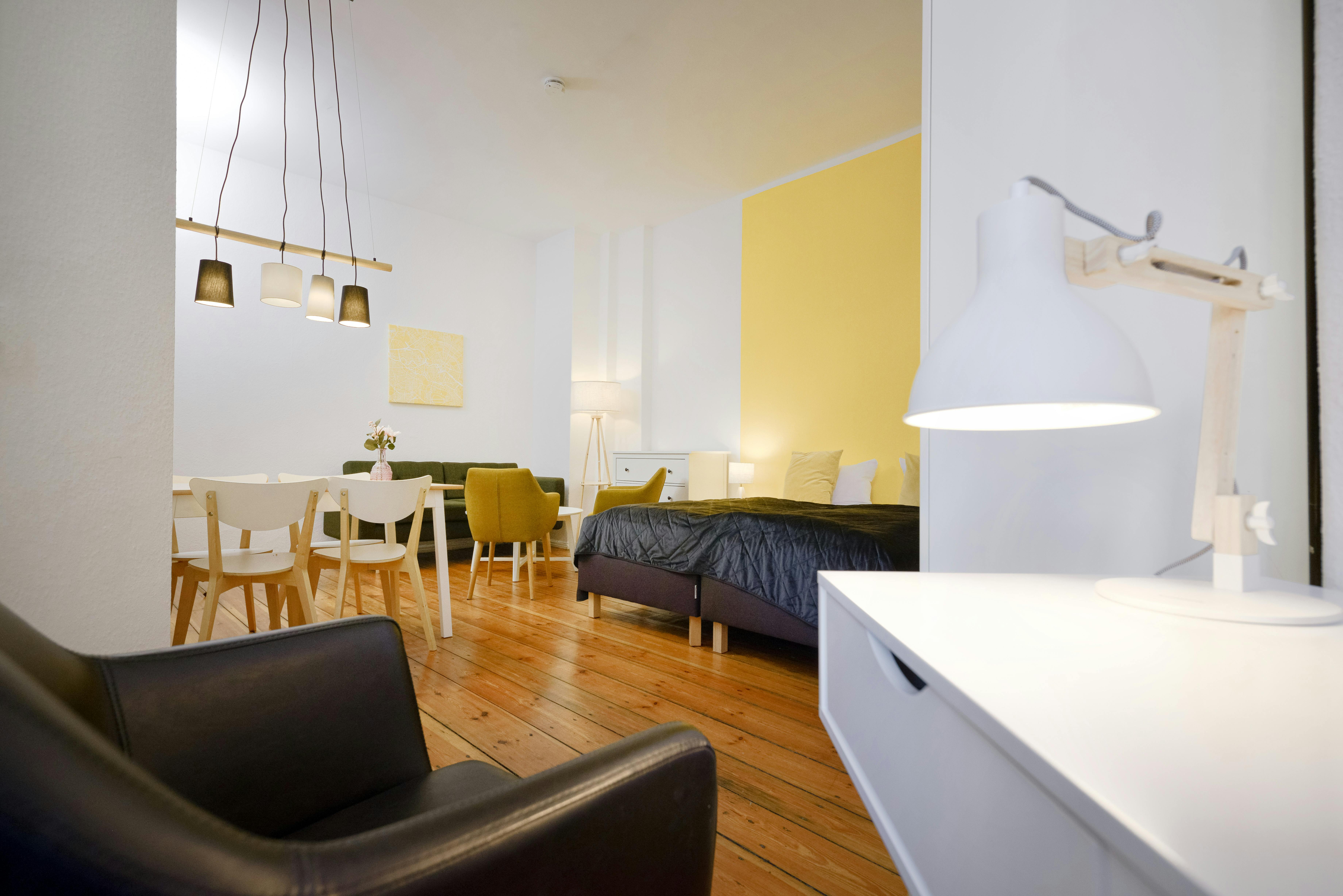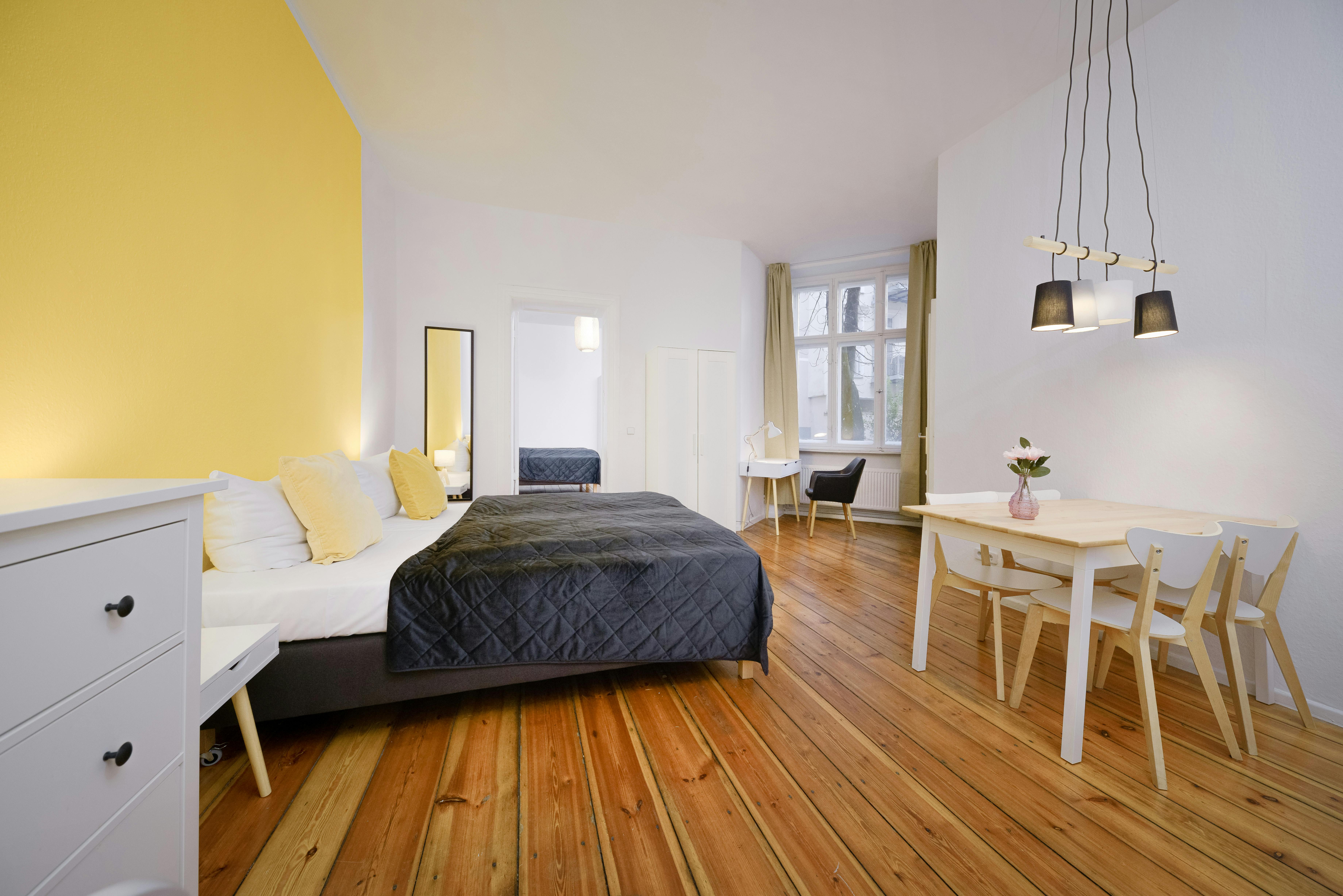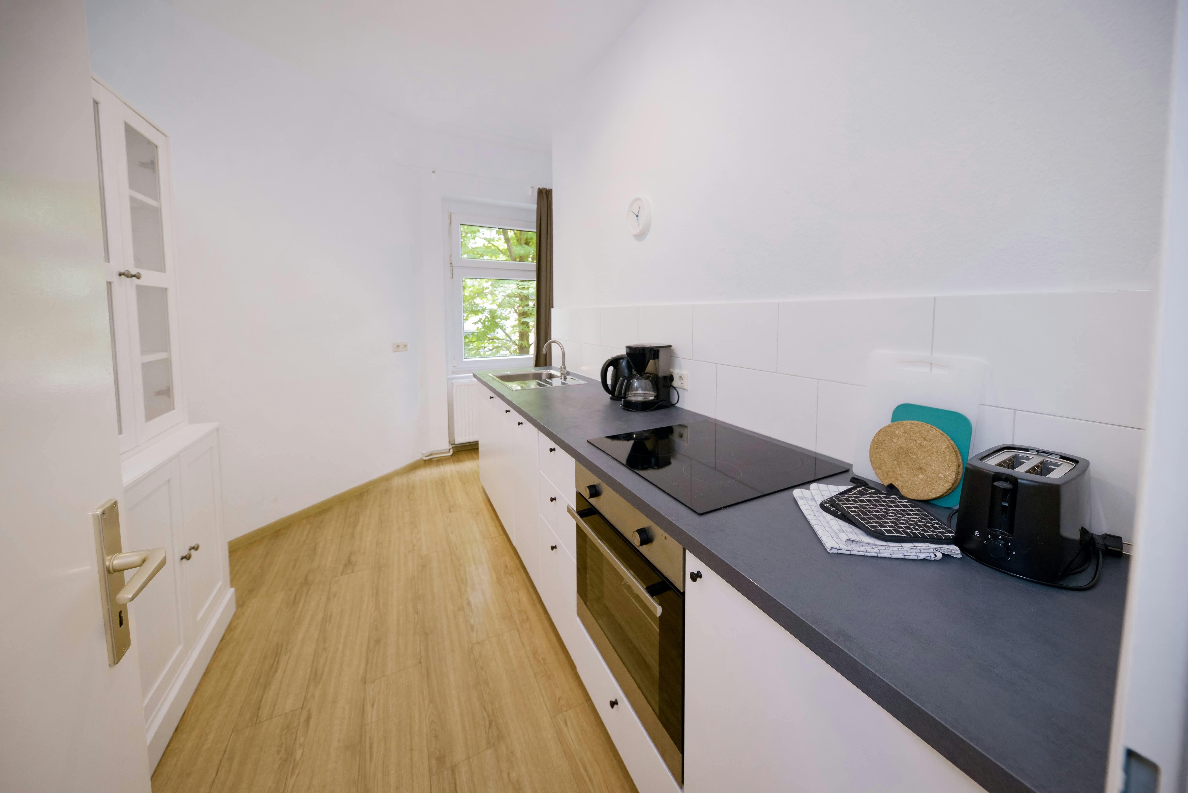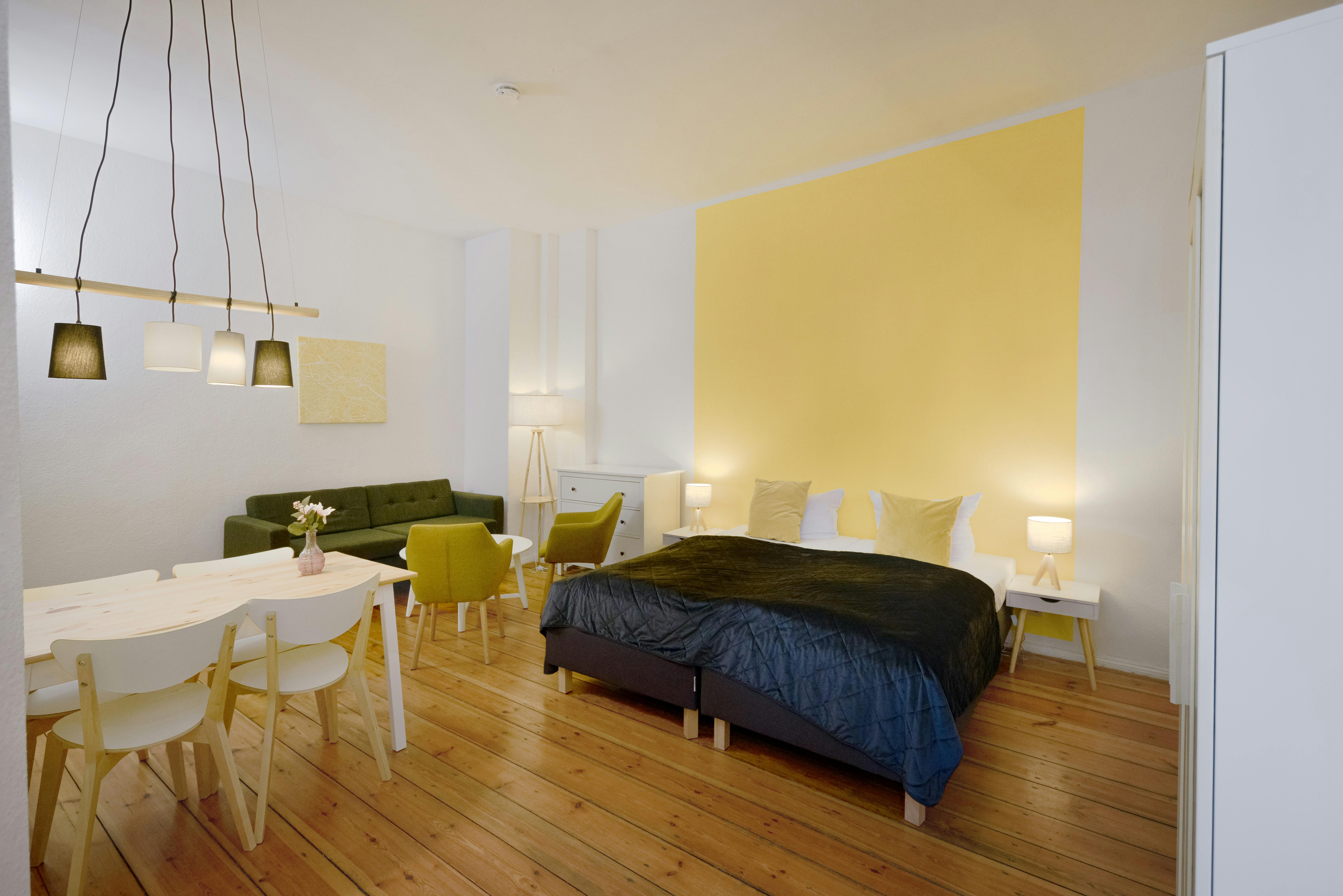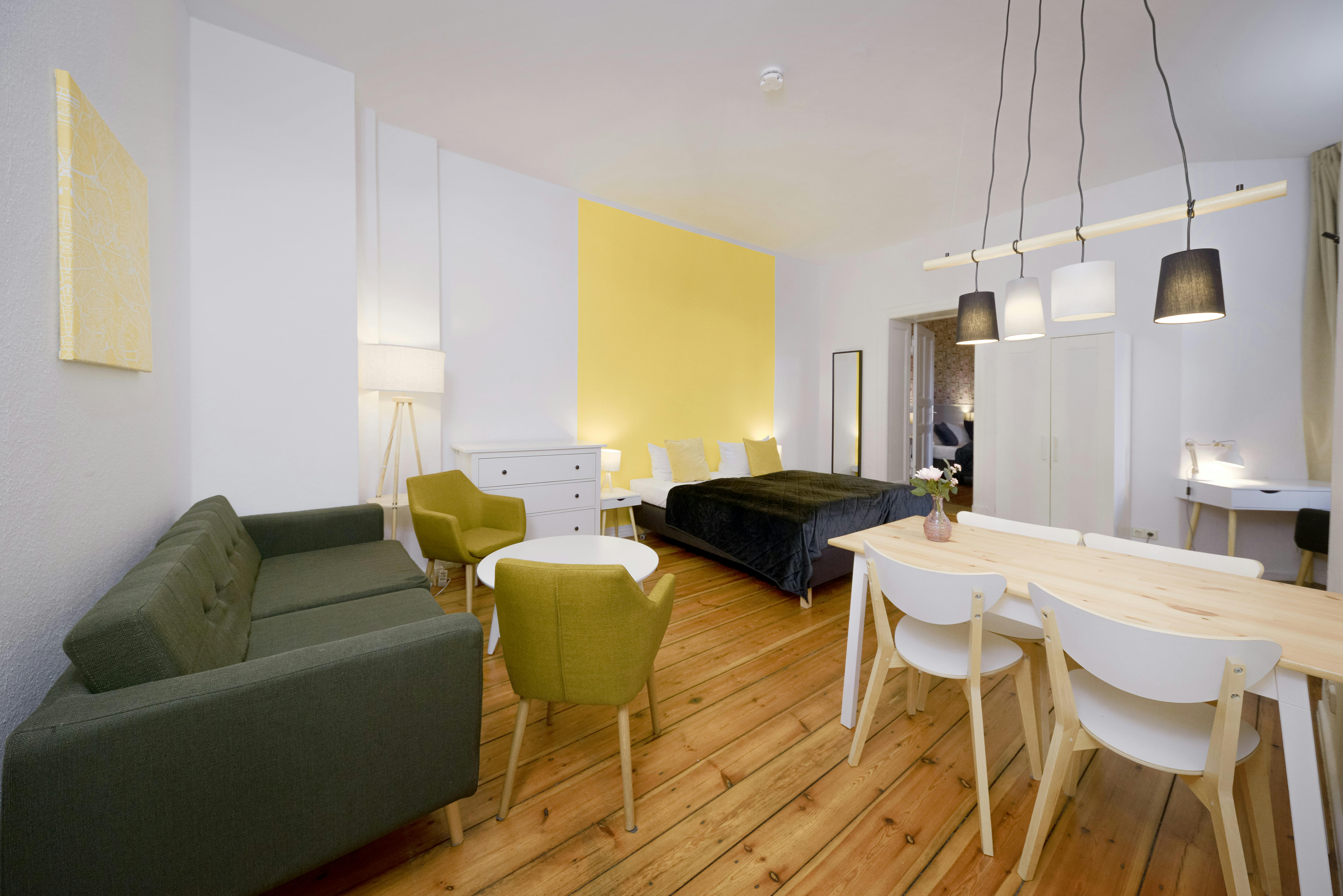 This 2-room apartment in the quiet courtyard by Greifswalder Str offers a living room which has a comfortable seating area, a dining table and chairs in addition to 2 single beds. In the bedroom with 2 single beds, which can be combined to form a double bed, there is a wardrobe, chest of drawers and TV. The kitchen offers all amenities such as stove, oven, dishwasher, dishes, pots and pans and electrical appliances. The bathroom is equipped with shower. Bed linen and towels are provided. The apartment is located on the ground floor. The apartment is situated in the same building...