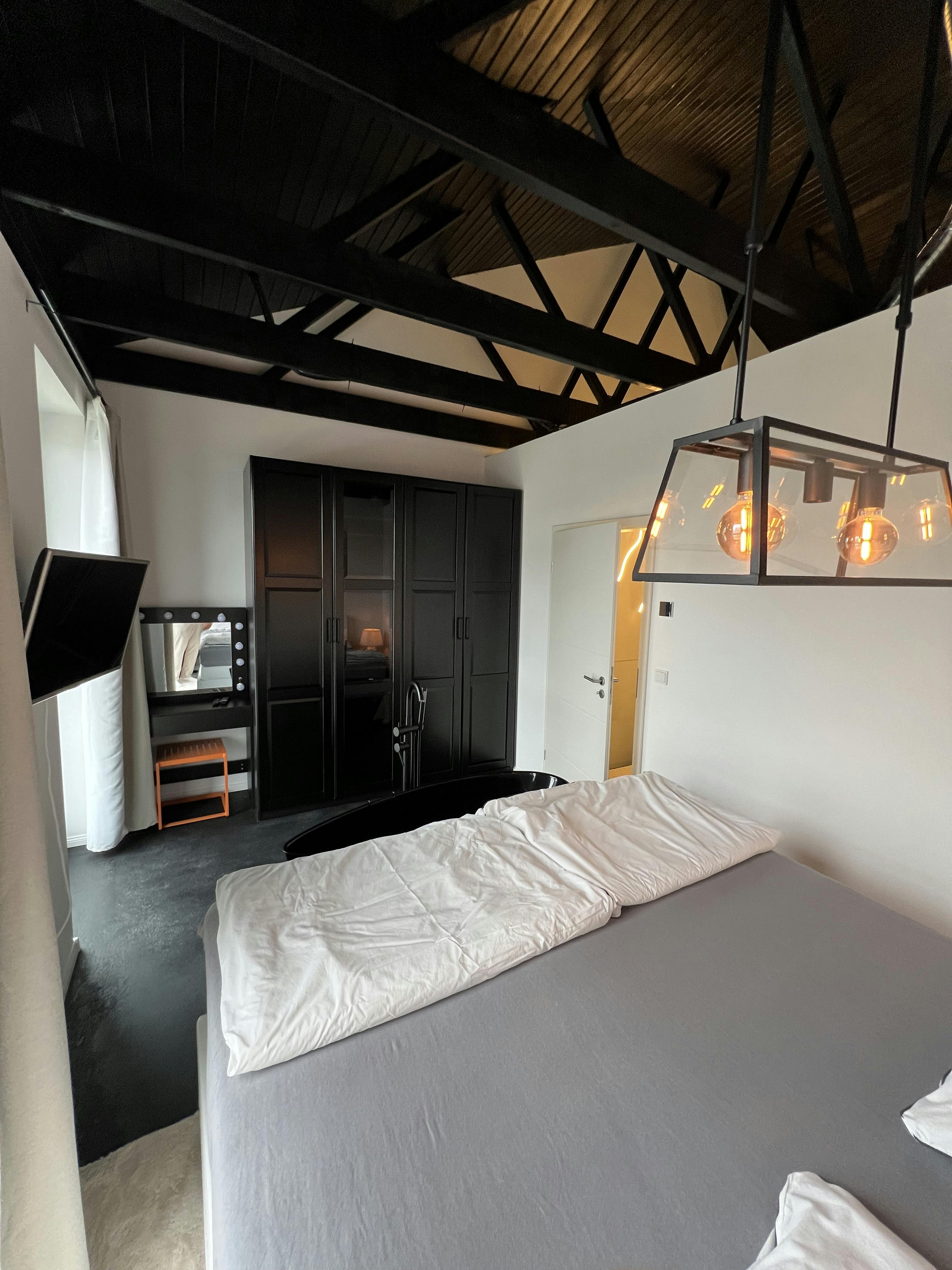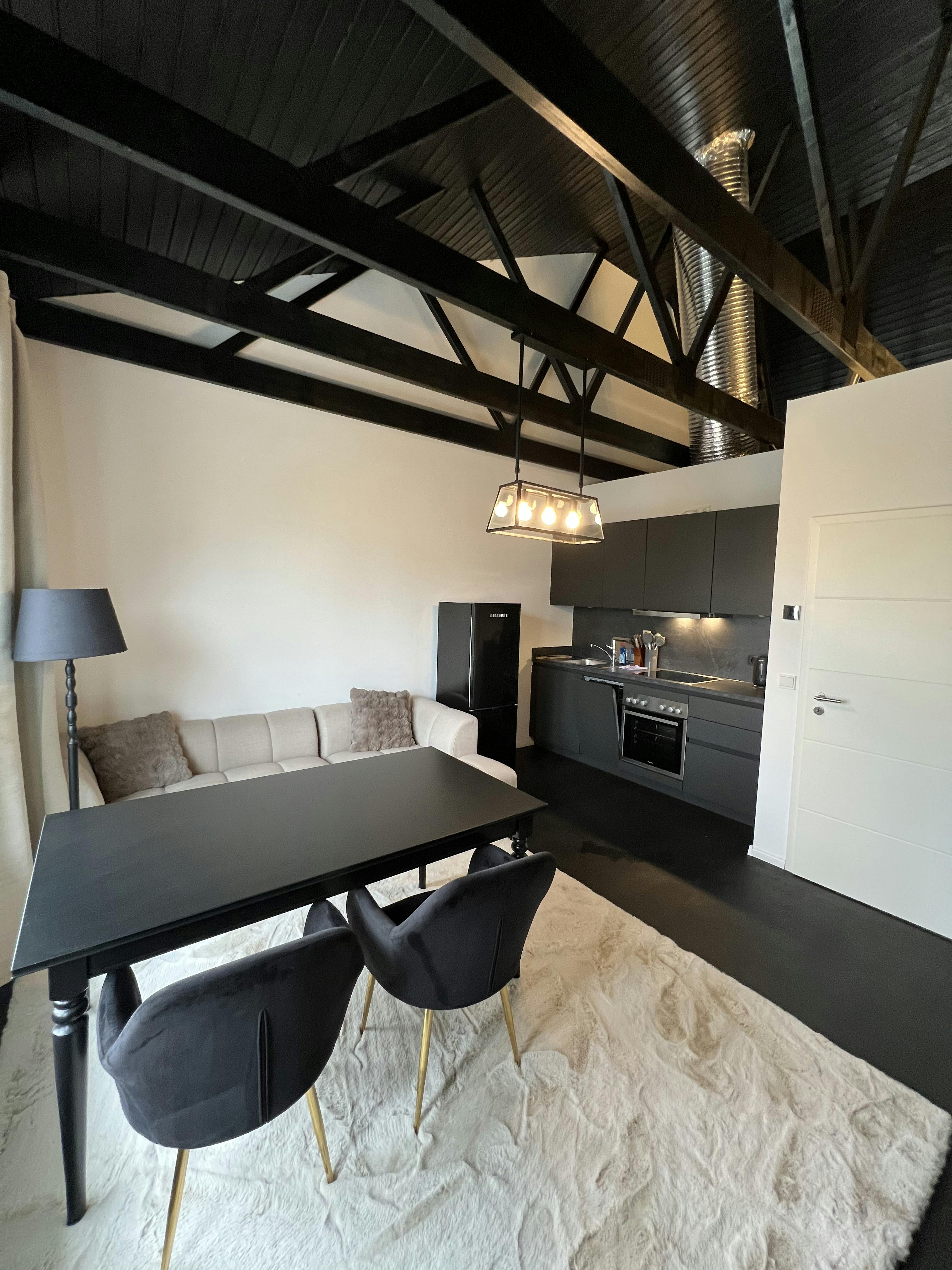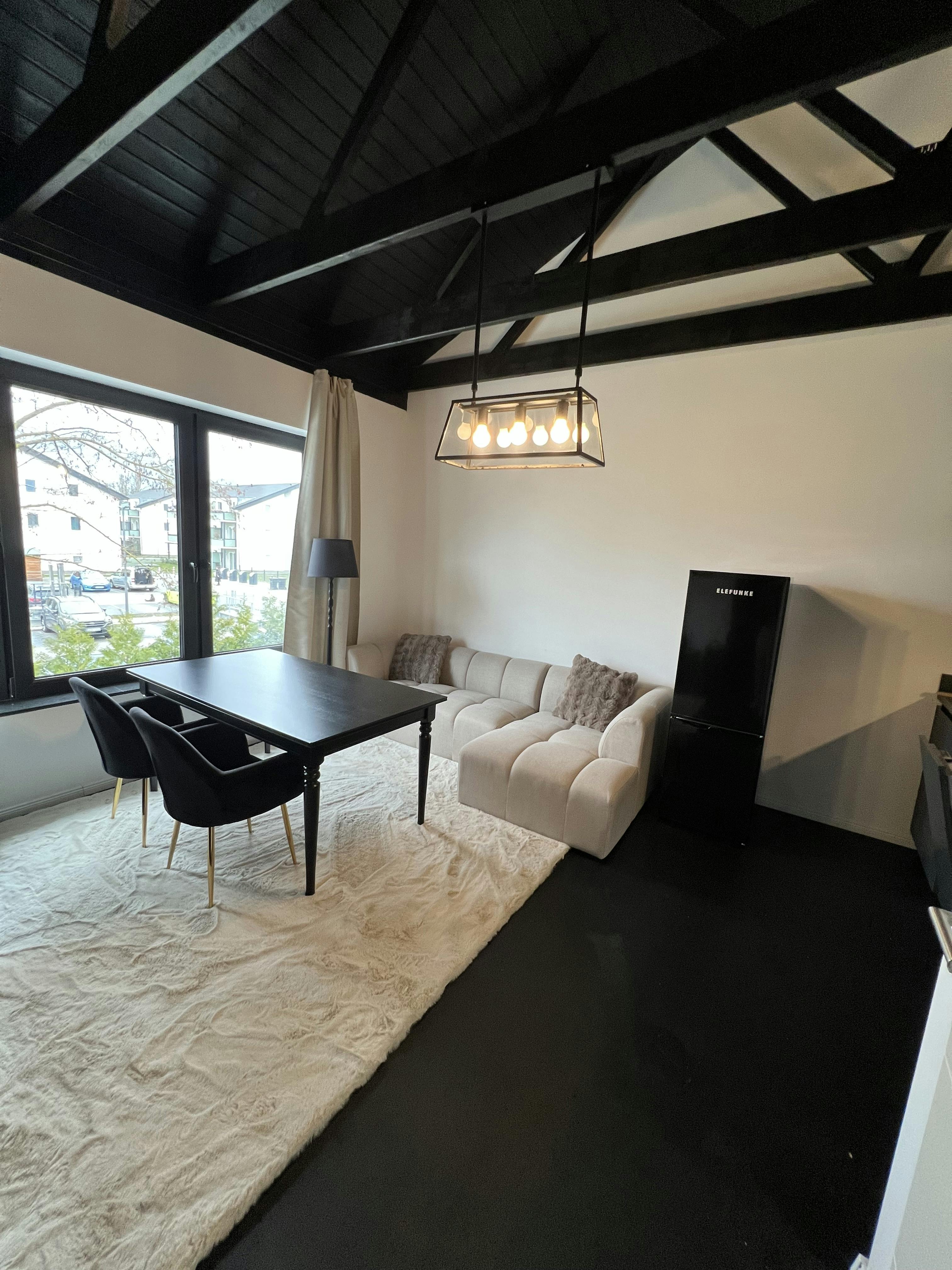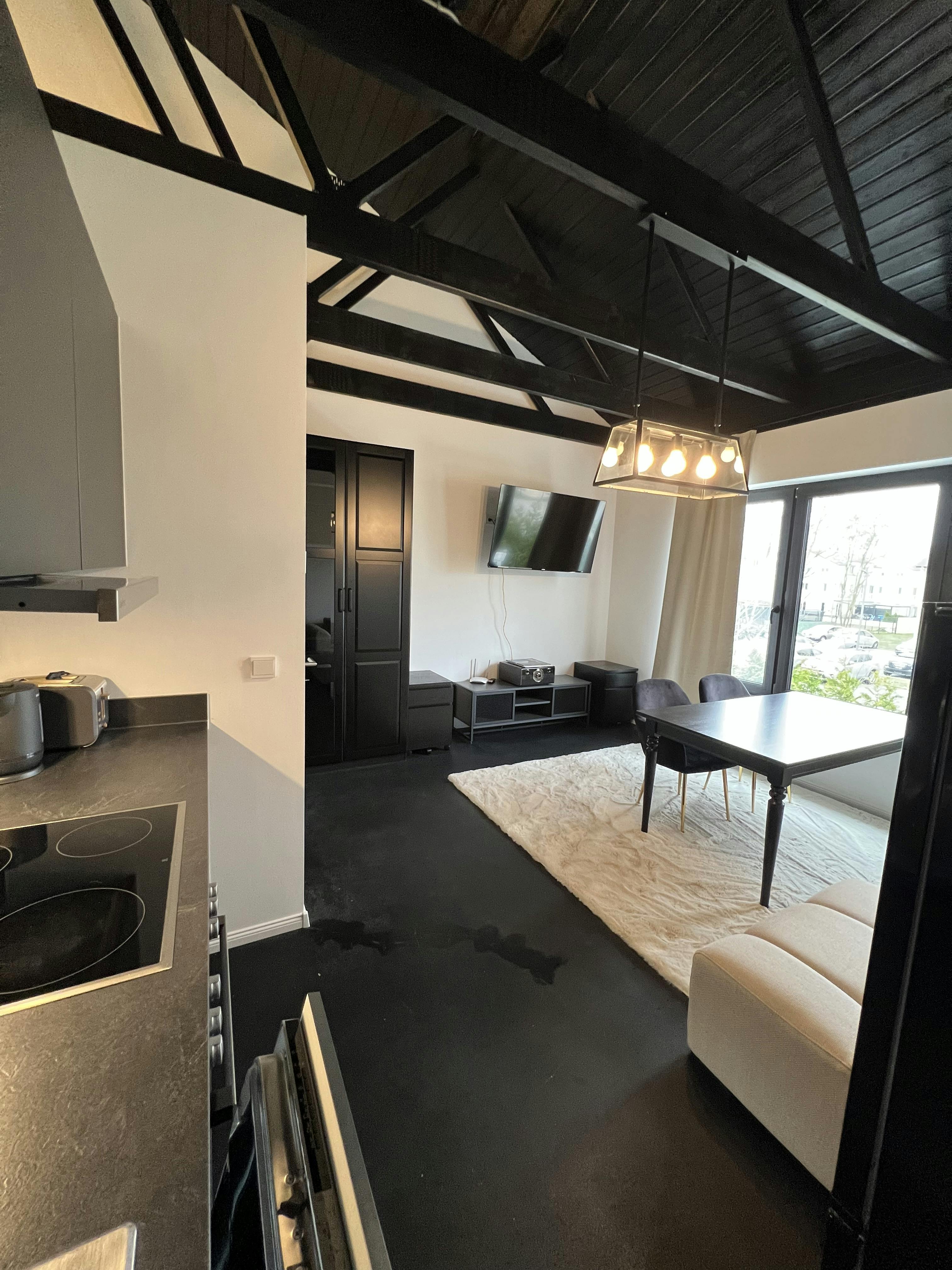 Eine sehr offen eingerichtete 2-Zimmer-Wohnung in Berlin mit industriellem Look. Wohnzimmer: - voll ausgestattete Küche - Geschirrspüler, Ofen, Herd, Dunstabzugshaube, Ek. - Toaster, Wasserkocher, Nespresso. - Großer Smart-TV, 2m Esstisch, 4 Stühle, Eckcouch, Schrank 1mx2m, Sideboard, Decken Schlafzimmer: - 1.80m Box Frühlingsbett, großer Schrank 4mx2m, Ankleidetisch, Badewanne, kleiner Smart TV, Kissen, Decken, Kleiderhaken, ect. Badezimmer: - Haartrockner, Waschmaschinentrockner, Richter, Bügelbrett, Wäschetrockner