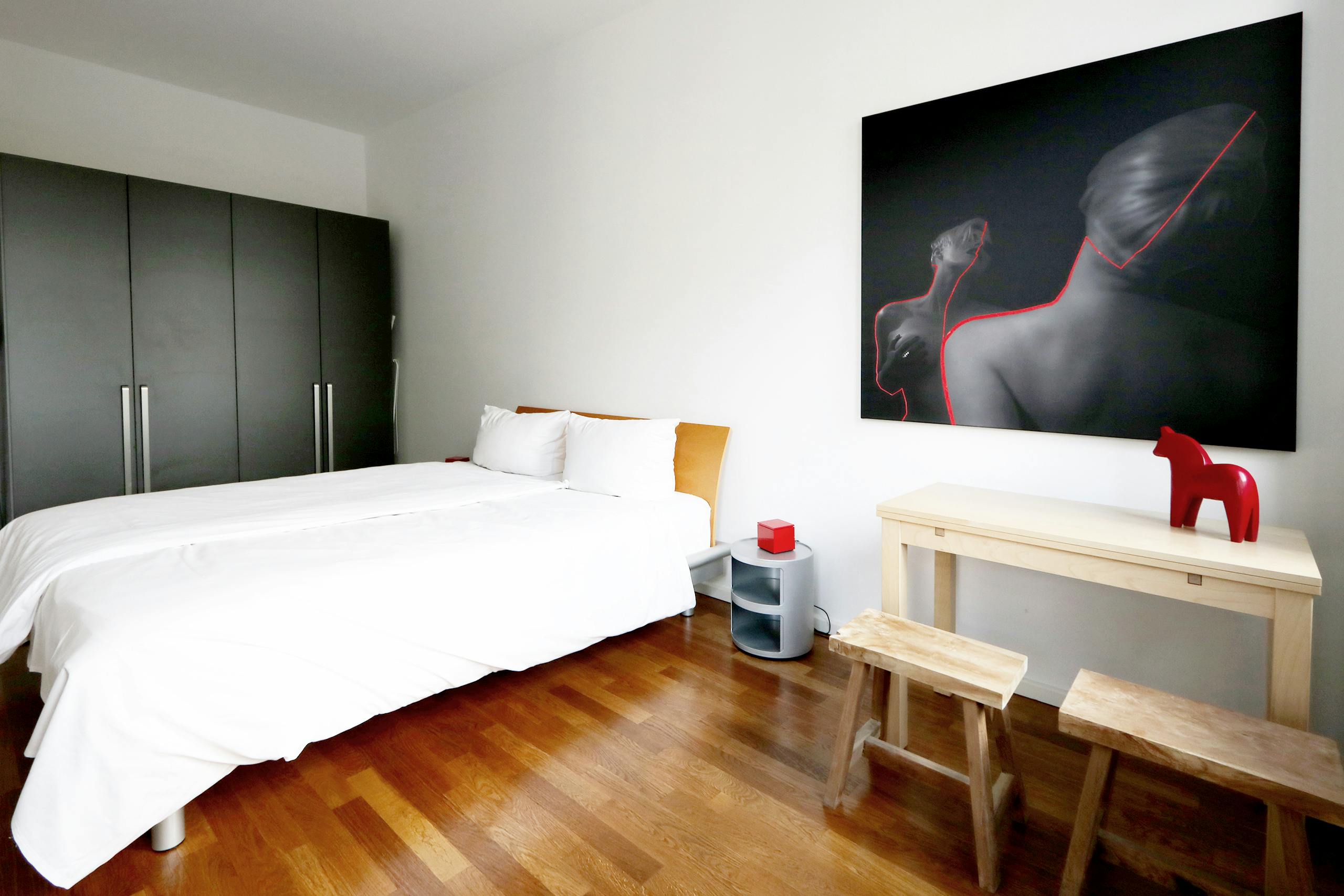 As you enter the charming grand Foyer of the modernised 60`s building assemble you can reach the Apartment by lift on the 3rd floor. The modern one bedroom apartment has a balcony with fantastic views including the TV tower. The living space combines perfectly with the fully equipped open plan kitchen. Beautifully decorated with attention to detail and large arty pictures on the walls. The custom made kitchen features modern appliances and built in cabinets with shiny surfaces. The sofa can be transferred into a bed and can comfortably fit two more persons. The bedroom features a queen size bed...