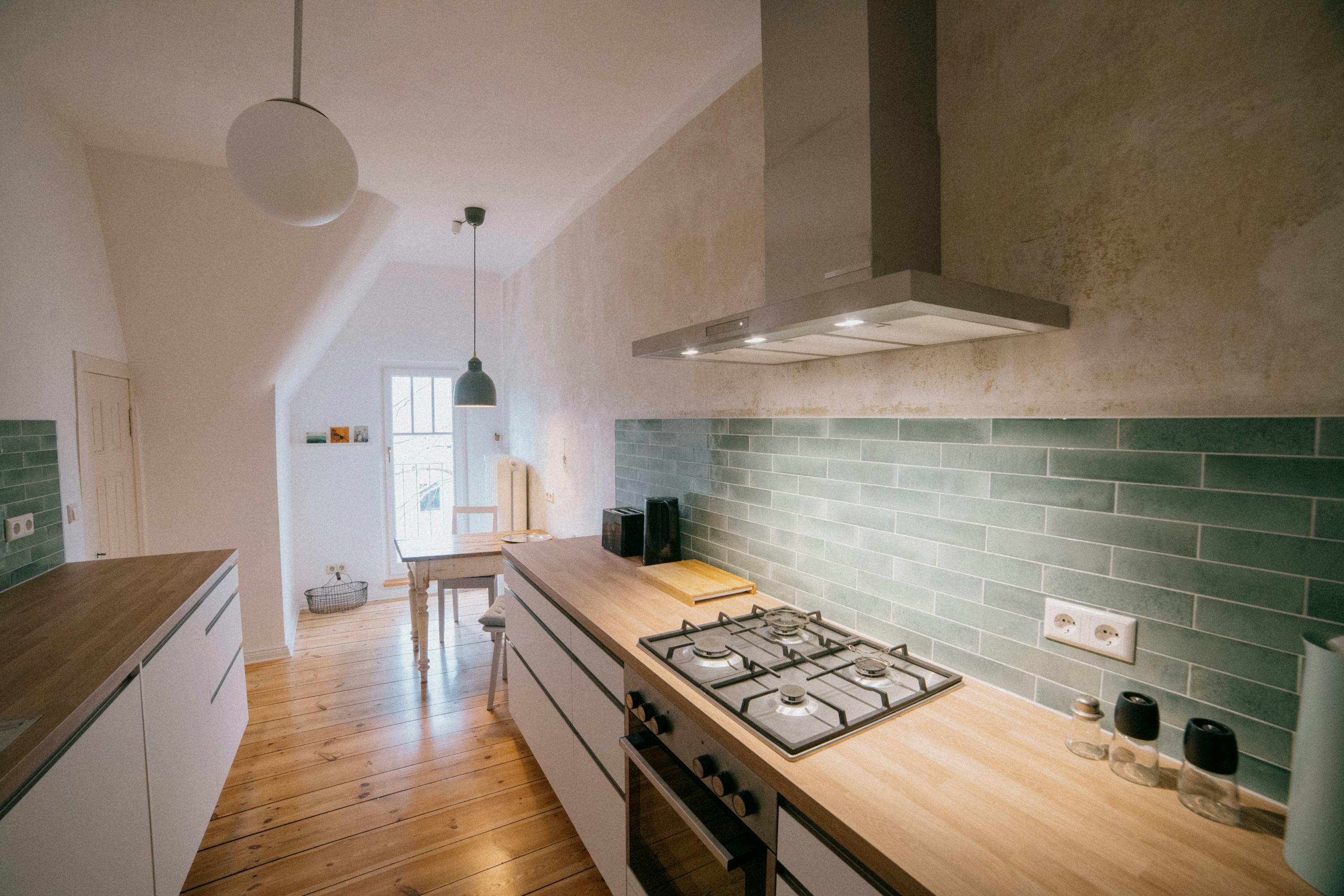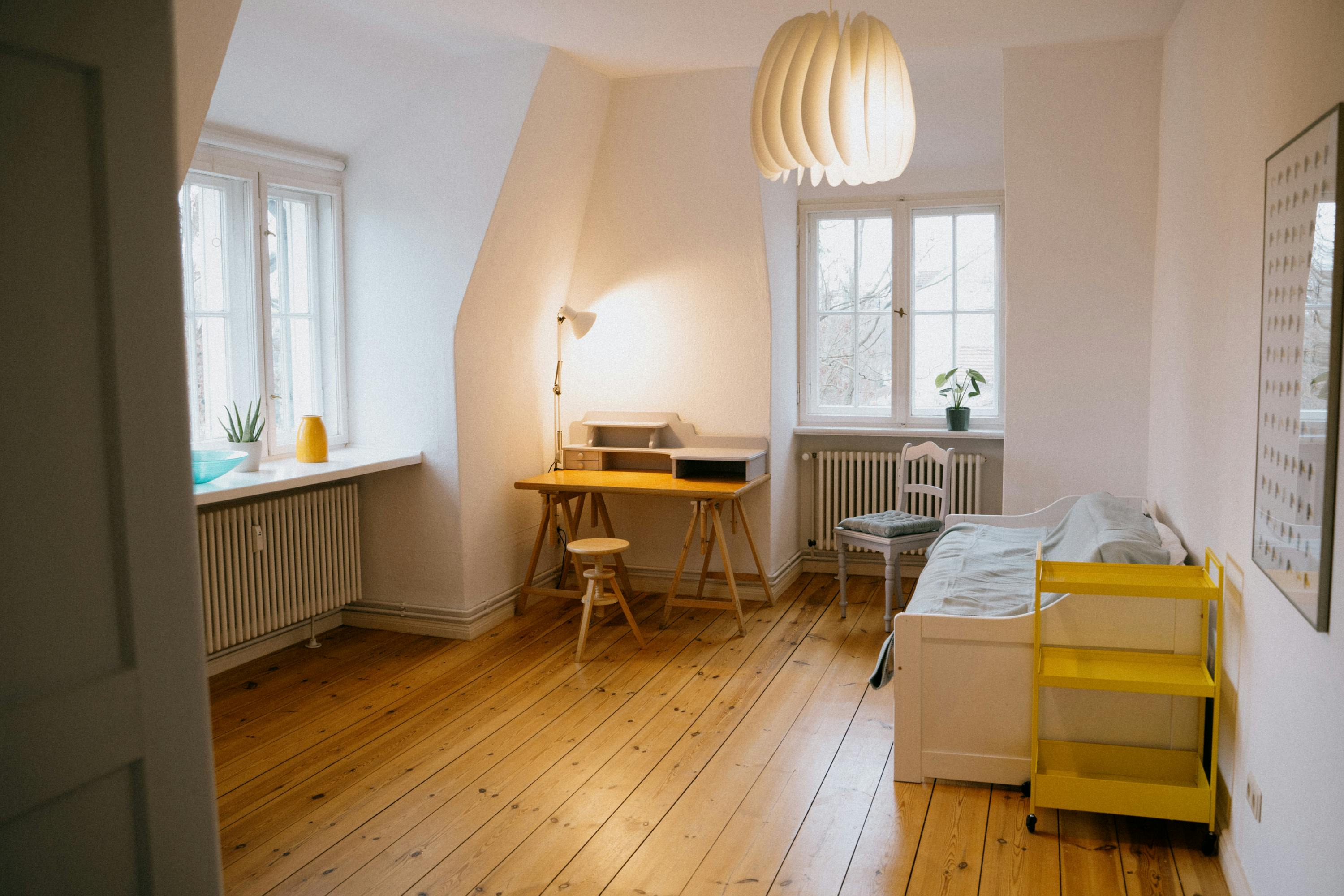 Freshly renovated, this flat is located in the attic of a villa built in 1916. It is sorrounded by old trees and a mystic garden in one of the quieter streets of Berlin Niederschönhausen. Part of the rental agreement is a partail usage of the garden (around 200m2/2200 square feet). Close to numerous stores, public transport and several parcs.