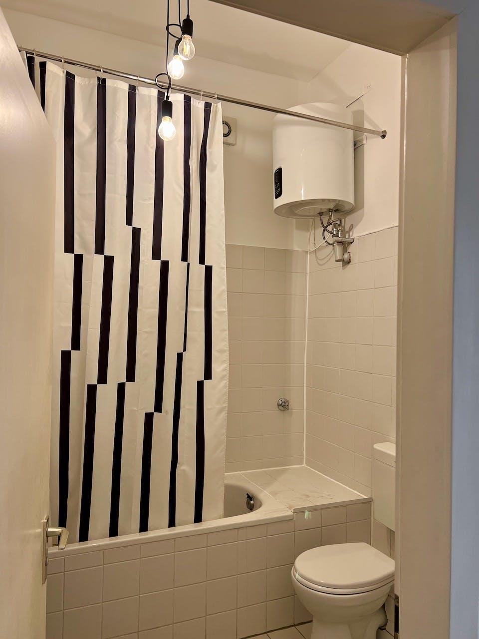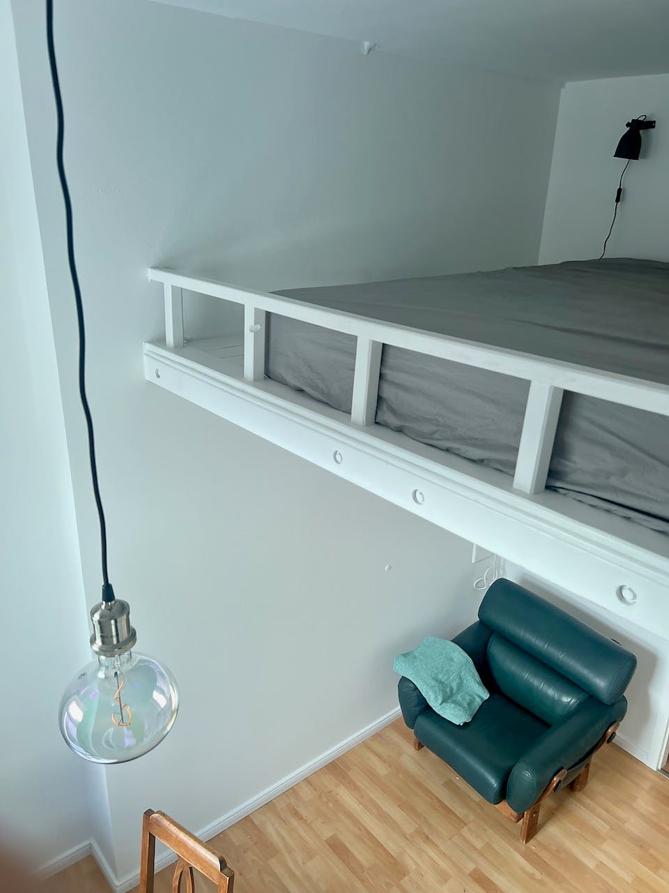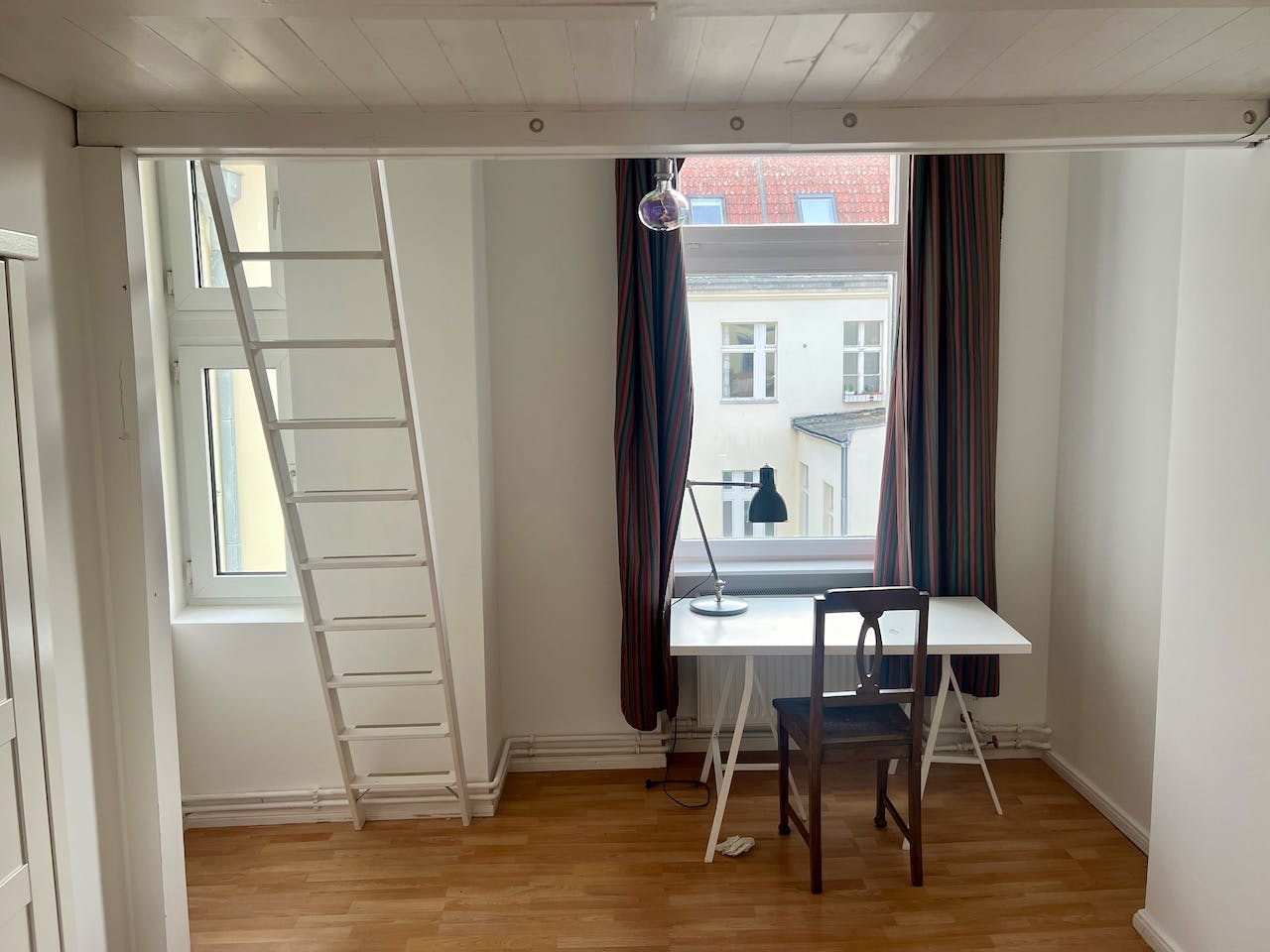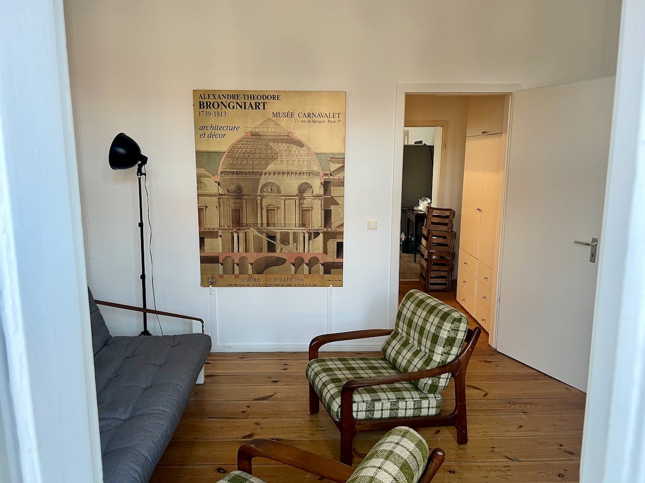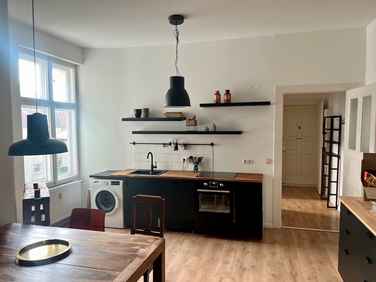 A bright apartment in a lovely Berlin neighborhood with shops and public transport nearby.