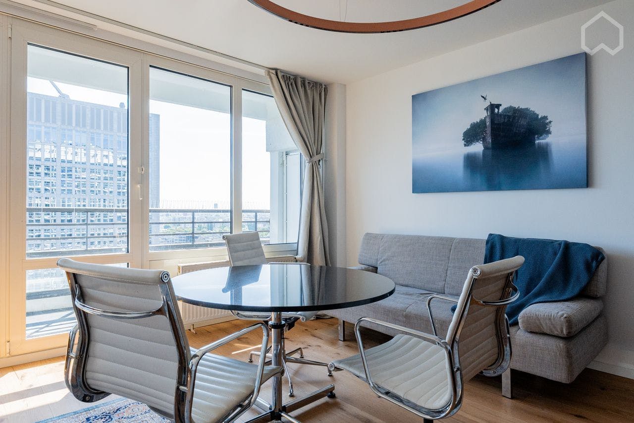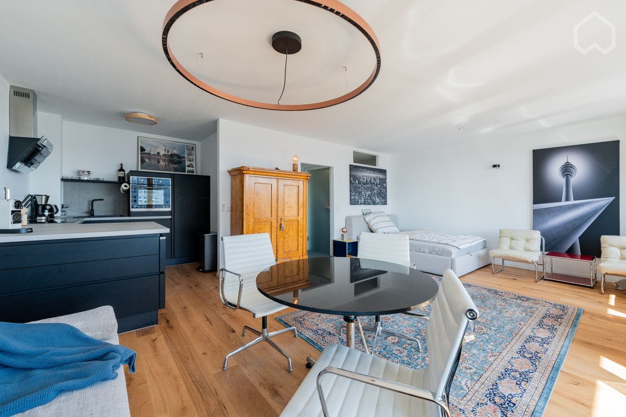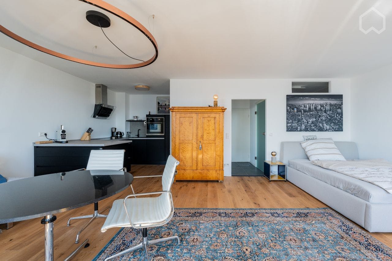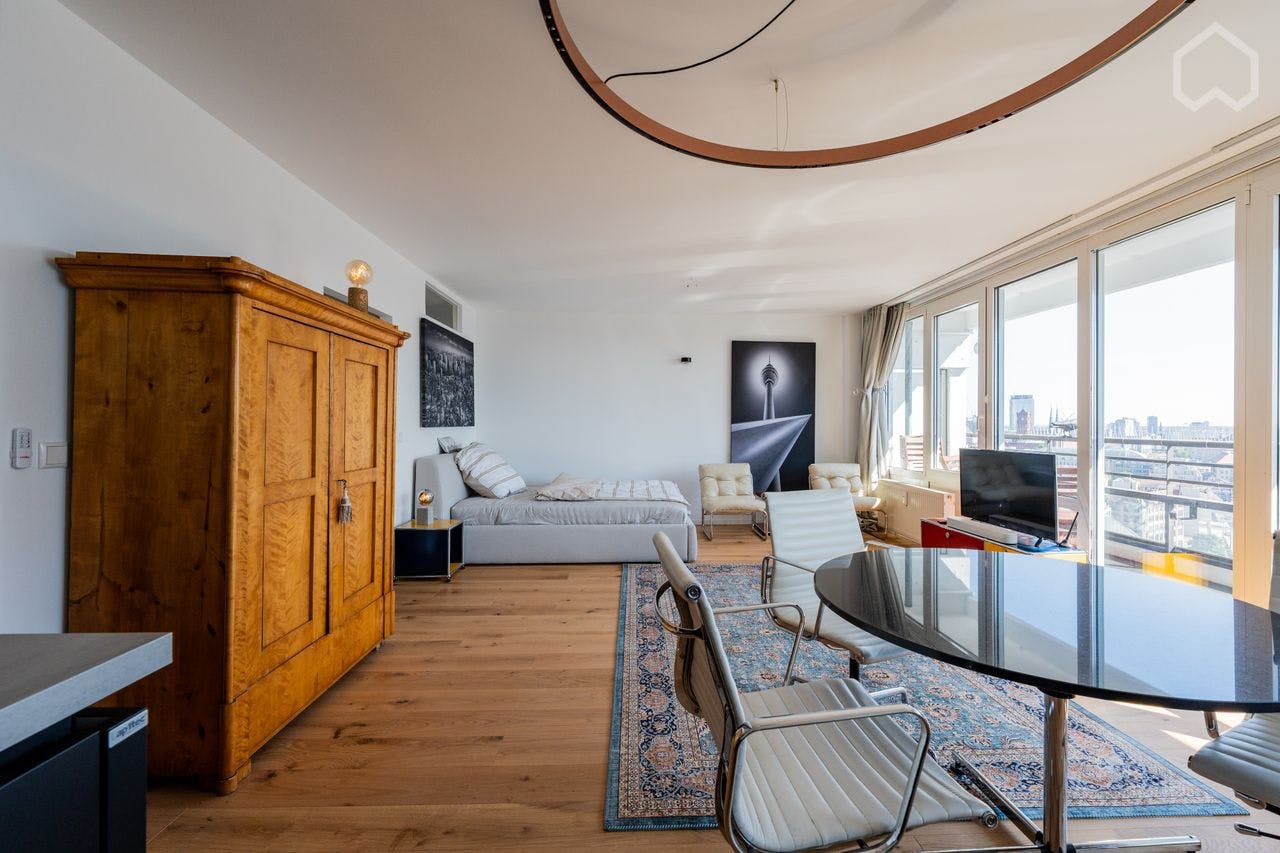 Experience urban living in this 2025 fully renovated and newly furnished studio apartment on the 19th floor of a well-maintained and highly sought-after high-rise building at Leipziger Straße 48 in Berlin-Mitte. This historic building complex is located in one of the most desirable residential areas of the city. With approximately 50 m2 of living space, the apartment offers high-quality features that leave nothing to be desired. The tasteful, design-oriented interior provides the perfect setting to enjoy the spectacular panoramic views of the Berlin TV Tower and the city skyline. A full-length window front ensures the apartment is bathed in natural...