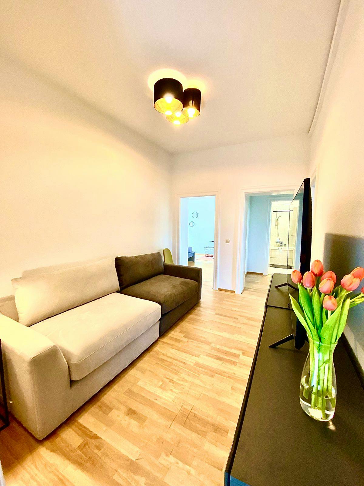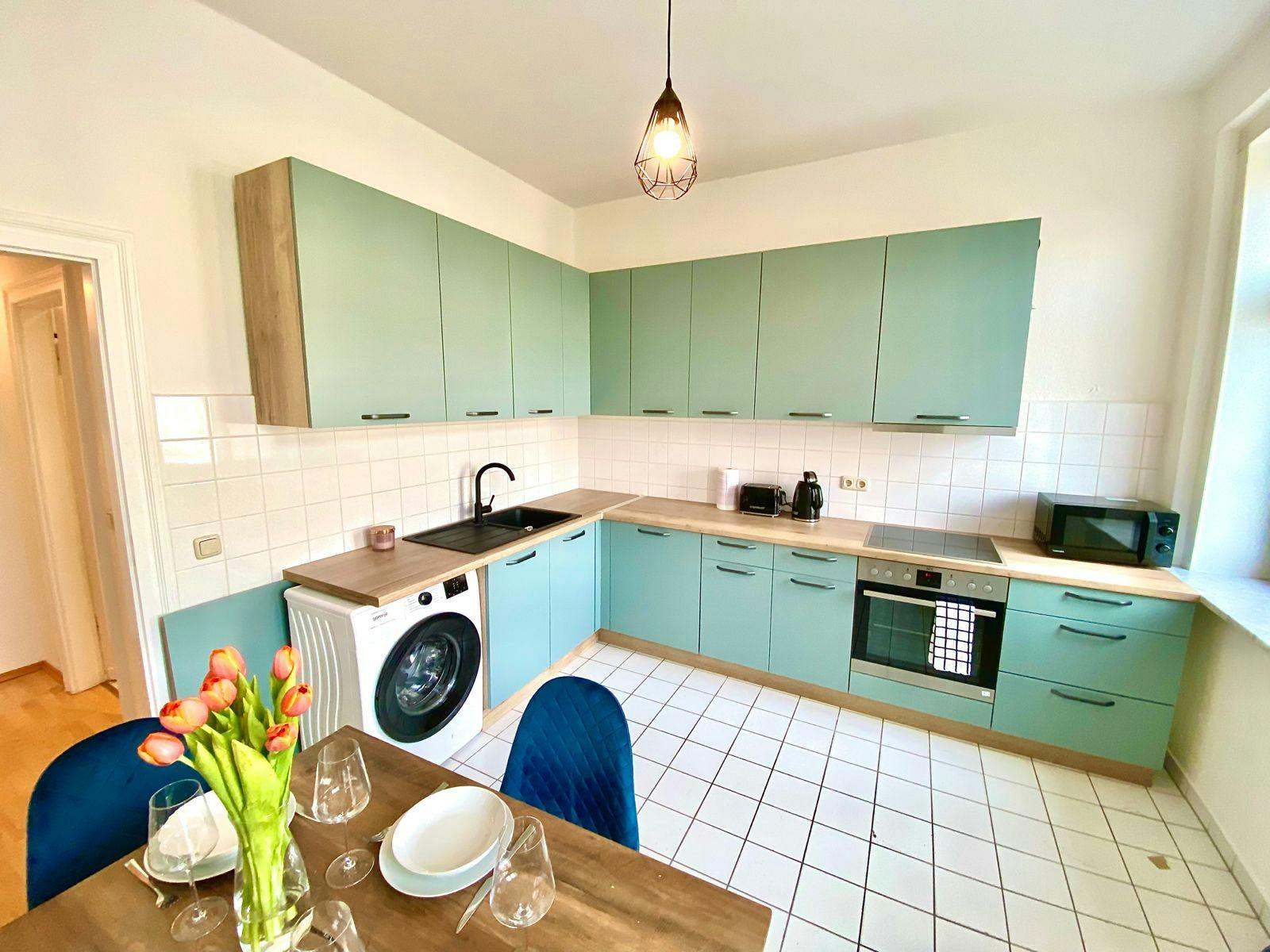 Schönes und helles 3-Zimmer-Apartment: Wer gerne mittendrin lebt und trotzdem seine Oase braucht, kommt hier auf jeden Fall gut an. Diese Wohnung bietet alles, was man braucht - eine sortierte, hochwertige Einbauküche (inklusive Kaffeemaschine, Kühlschrank, Mikrowelle, Wasserkocher, Toaster etc.) mit Esstisch. Sie bietet ein geräumiges Wohnzimmer mit Sofa und TV Set, sowie ein voll gefliestes Badezimmer mit Dusche, WC und Waschbecken.
