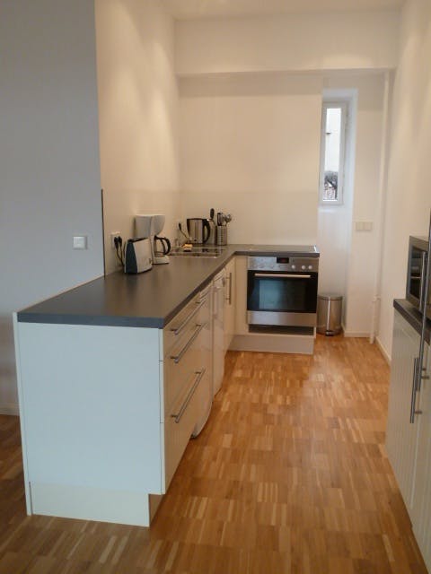 Our comfortable apartment features a separate bedroom and an open living/eating space. The apartment is fully equipped to make your stay a most enjoyable one. The bedroom contains a king-size bed with two separate mattresses (200 x 90 cm). It faces the quiet, green back yard. For your special convenience we provide extra large comforters (220 x 155 cm). The spacious living/eating space (approx. 50 sqm) features two comfortable sofas and faces a quiet garden. The modern kitchen is fully equipped (incl. a modern stove, dishwasher, fridge with freezing compartment, coffeemaker, toaster, electric water kettle etc.) and interacts with the open living/eating space. The bathroom...