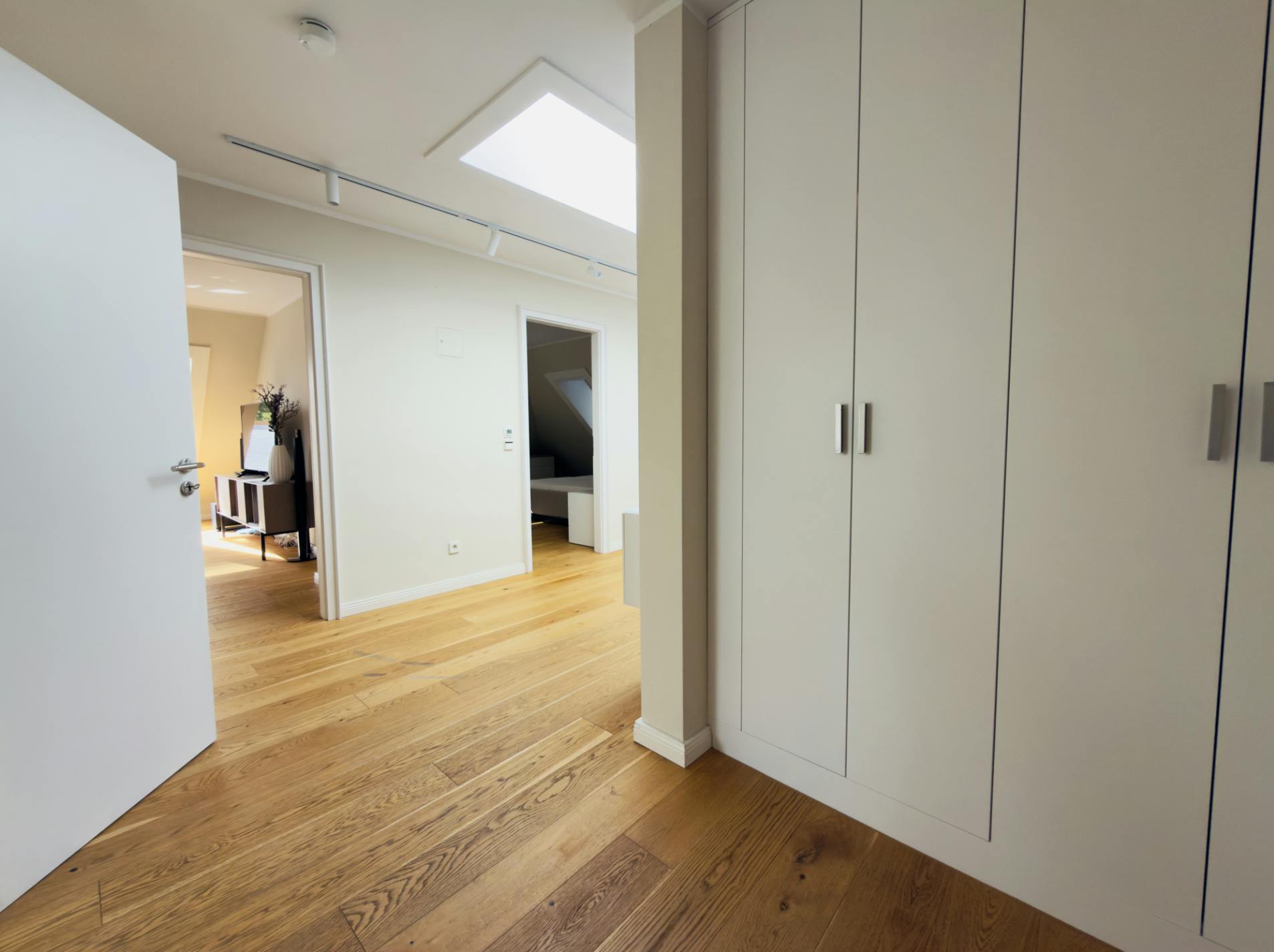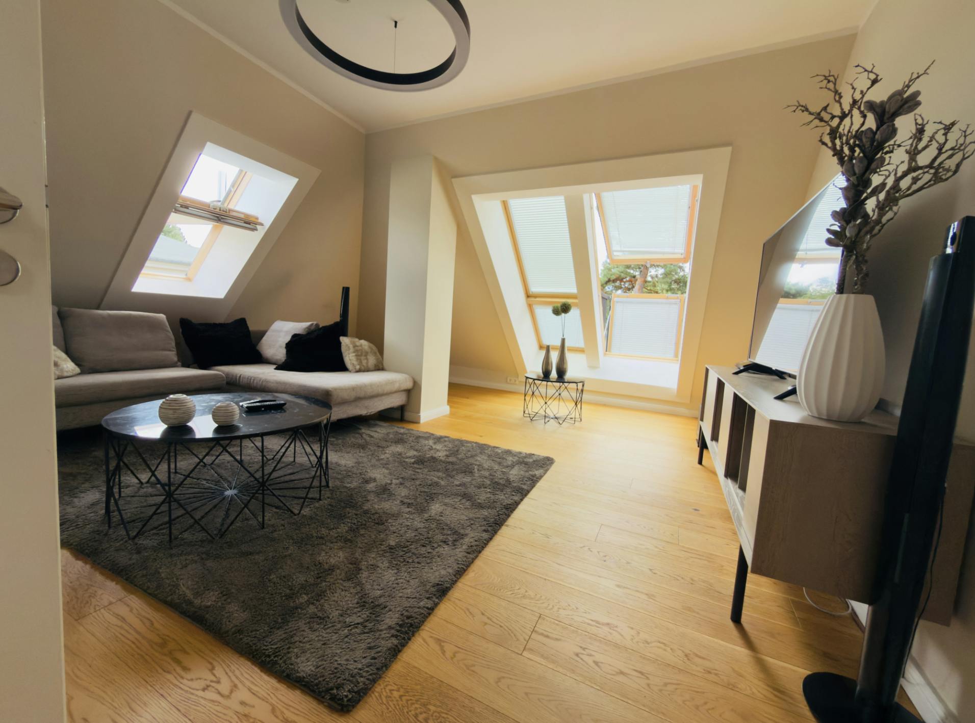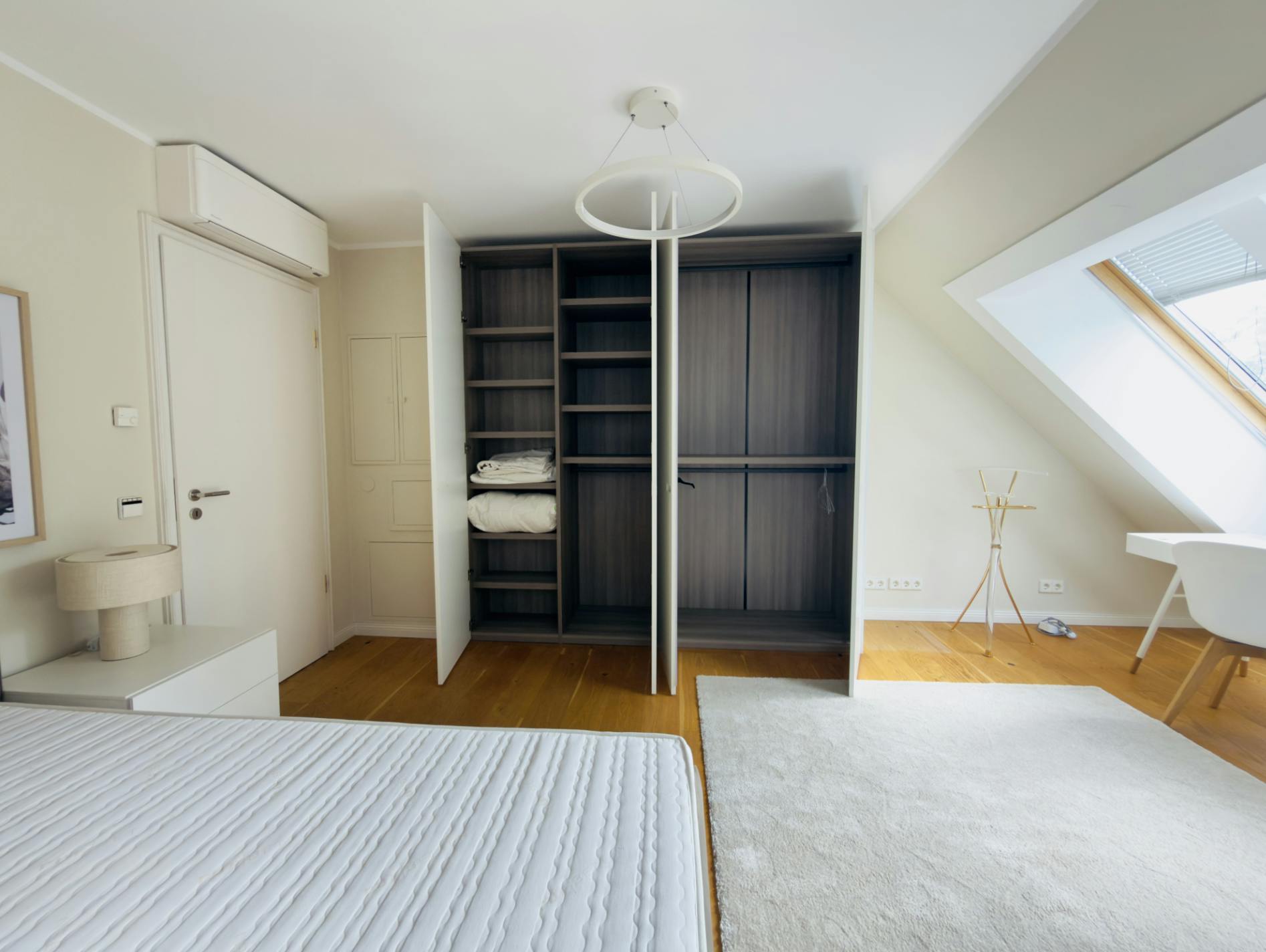 Willkommen in dieser einzigartigen 2,5-Zimmer-Dachgeschosswohnung in einer 1999 errichteten Stadtvilla im Herzen des exklusiven Grunewalds. Bereits beim Betreten erwartet Sie ein elegantes Ambiente: lichtdurchflutete Räume, hochwertige Materialien und eine vollmöblierte Ausstattung. Der offene Eingangsbereich mit stilvoller Essecke führt in den großzügigen Wohnbereich, der gleichermaßen für repräsentatives Wohnen wie für gesellige Abende mit Gästen geschaffen ist. Das Schlafzimmer vereint Ruhe und Funktionalität – mit einem komfortablen Schlafbereich, einer integrierten Arbeitsecke für Homeoffice oder kreative Momente sowie einem begehbaren Kleiderschrank, der zusätzlichen Komfort und Stauraum bietet. Die moderne, voll ausgestattete Einbauküche ist ein weiteres Highlight, das sowohl ambitionierte Hobbyköche als auch den schnellen...