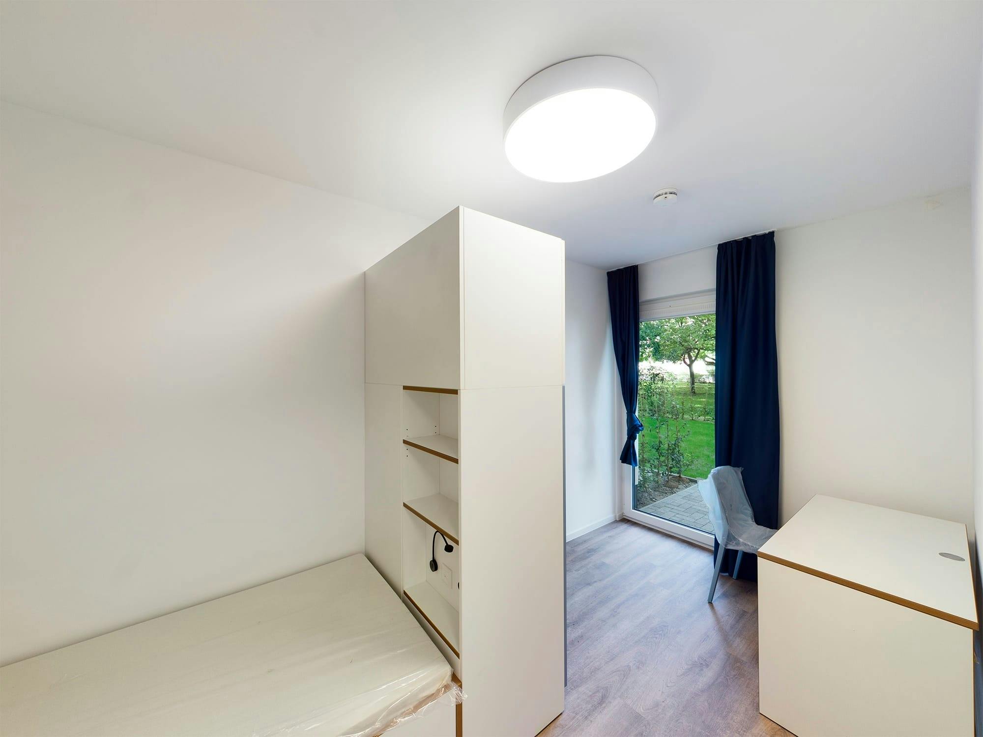 This 1-room apartment is designed to meet the needs of young professionals and students. They are: - fully furnished (bed 100x200, comforter, pillow, bed linen). - desk, chair - spacious closet and cupboards - internet and electricity are included in the warm rent - fully equipped kitchen ( kitchen utensils, vacuum cleaner) - underfloor heating - bathroom with shower - kitchenette - TV/radio broadcasting fees are not included in the warm rent, each household must register and pay for it themselves. - This apartment is for single use only Washing machines: In the basement of the back building there is a laundry room with washing machines and dryers for all residents....