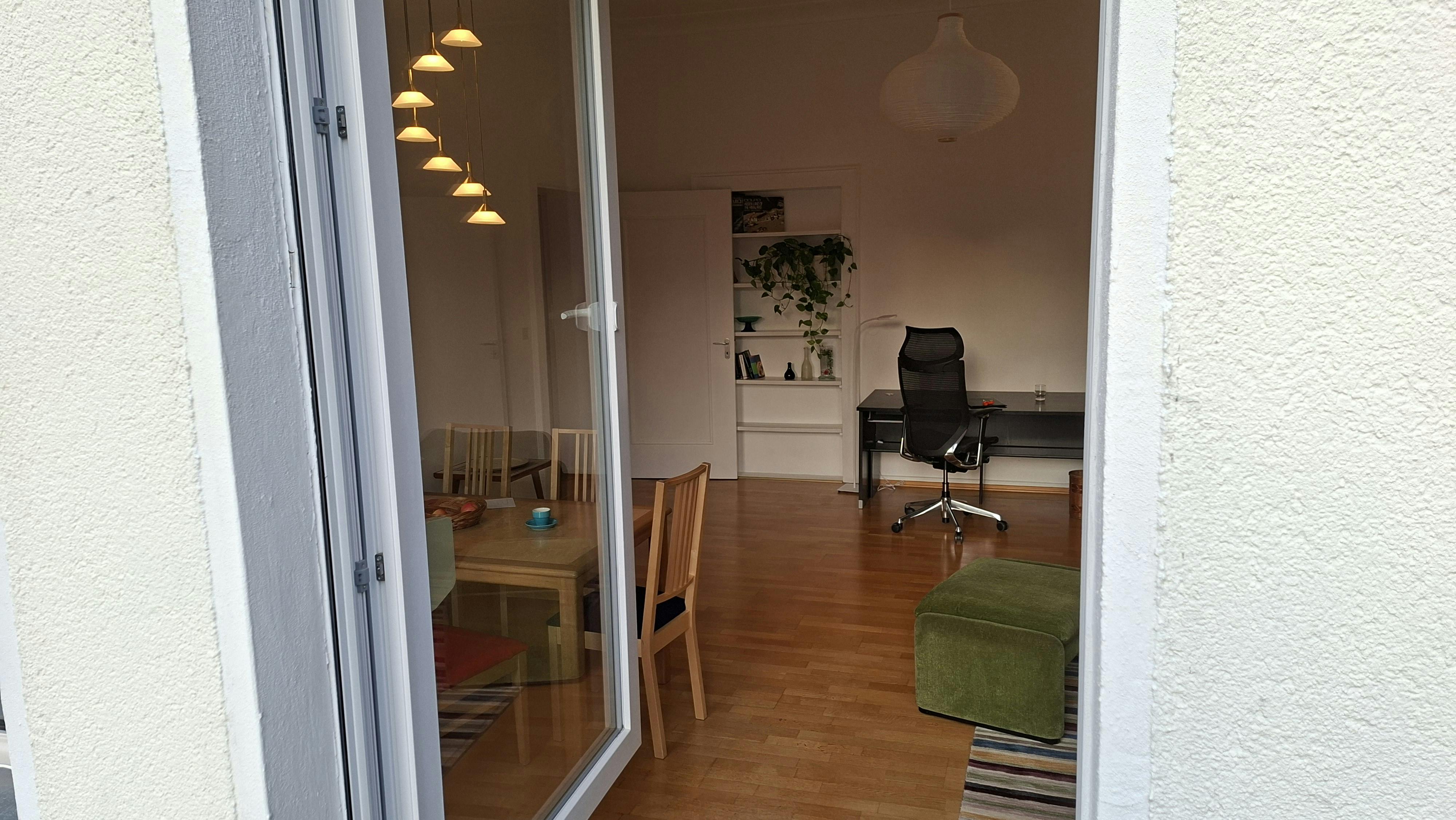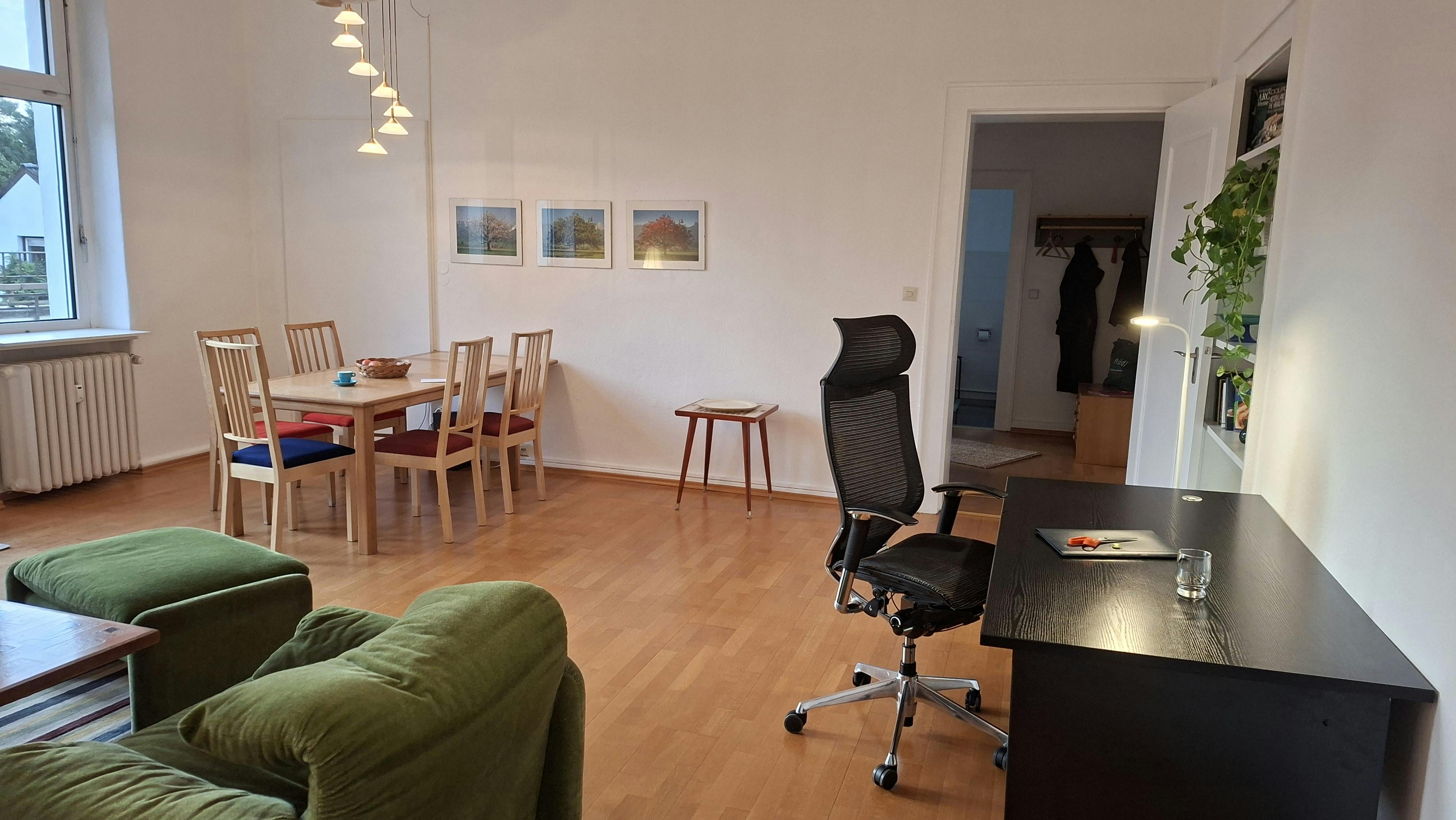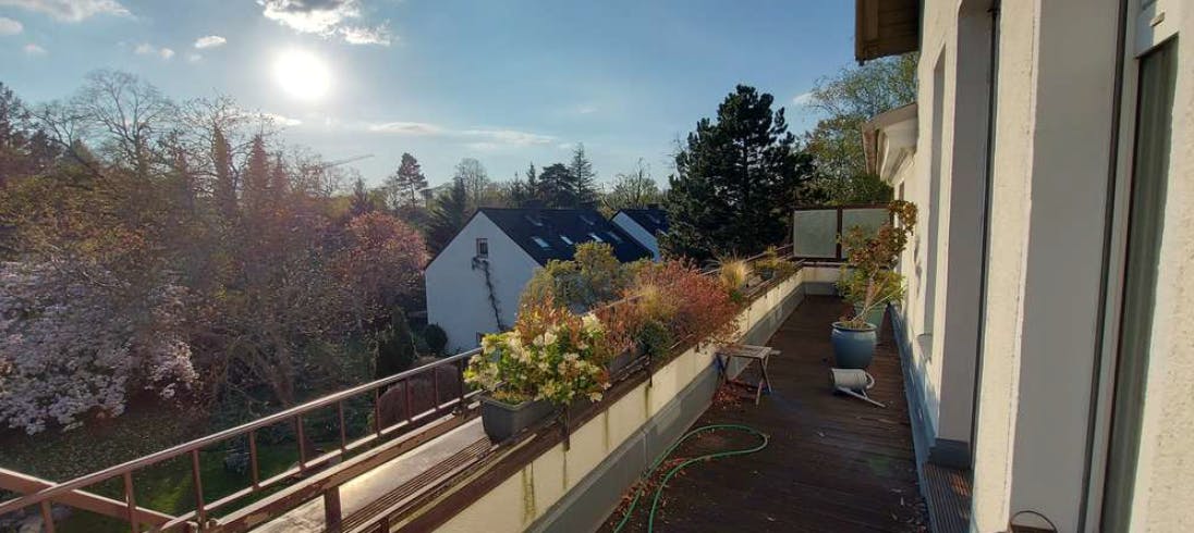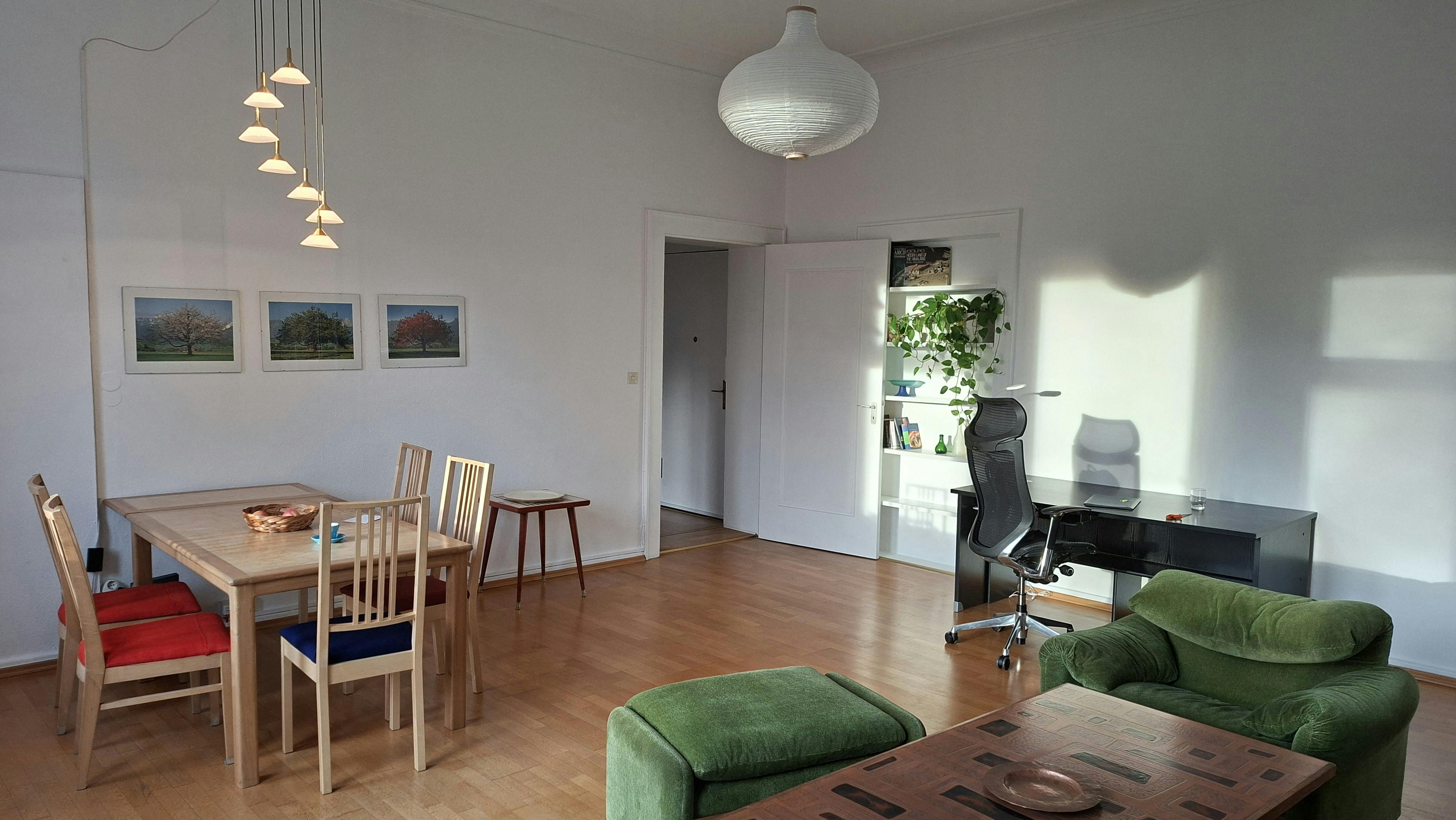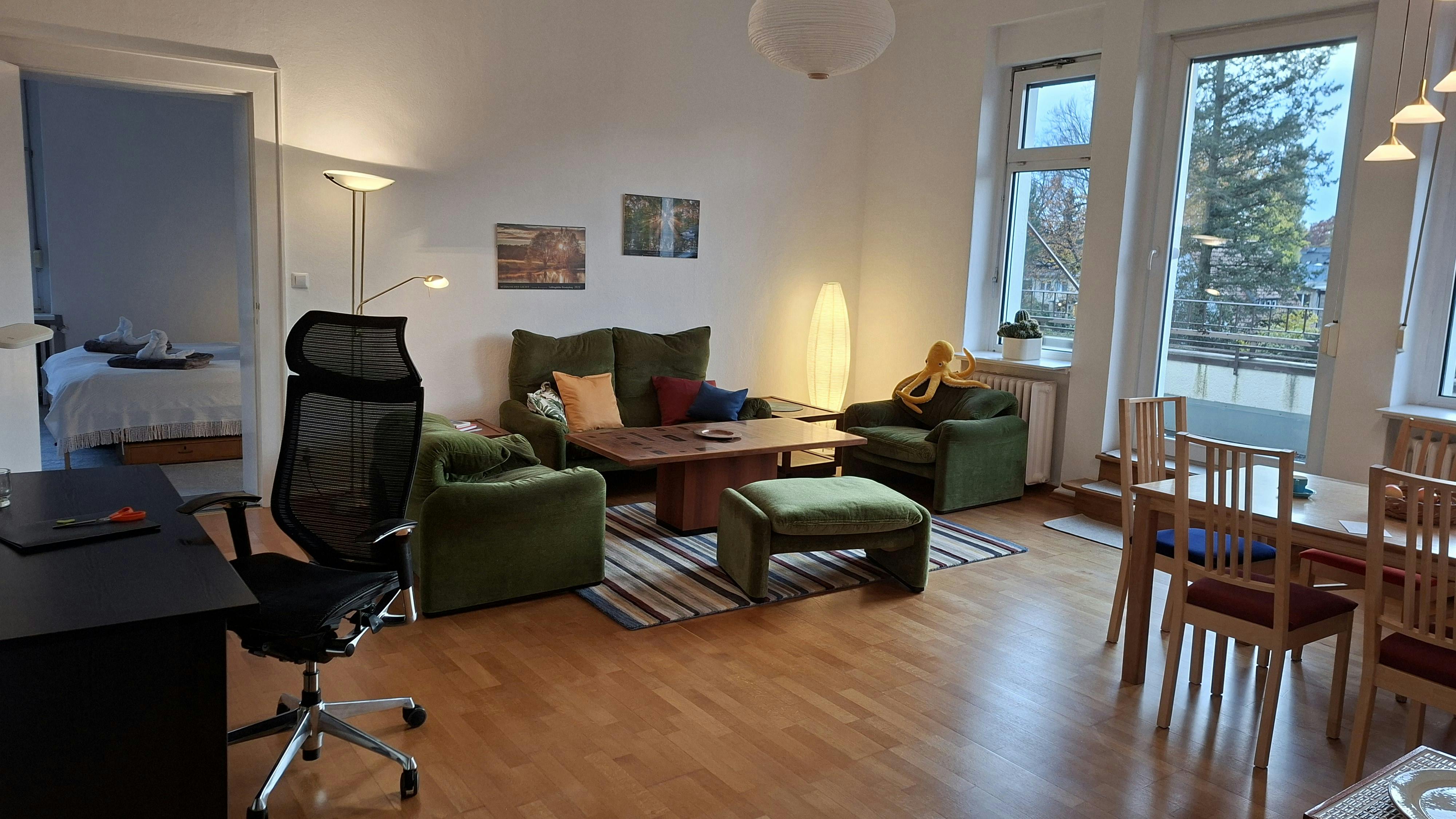 Bright, Spacious 2-Room Apartment by the Botanical Garden (Steglitz) Charming, fully furnished apartment in a well-kept family house with a private entrance. Two balconies with leafy garden views, a calm setting right by the Botanical Garden, close to the Free University (FUB), and still well connected to the city center. Highlights: 2 rooms: a generous living room (walk-through) and a separate bedroom, Two balconies overlooking trees and gardens; shared garden use, Quiet residential area with supermarkets and cafés within walking distance, Family-owned house; owners speak fluent English. Layout note: Spacious living room, cozy bedroom. A child could fit in, but please note access to the bedroom is...