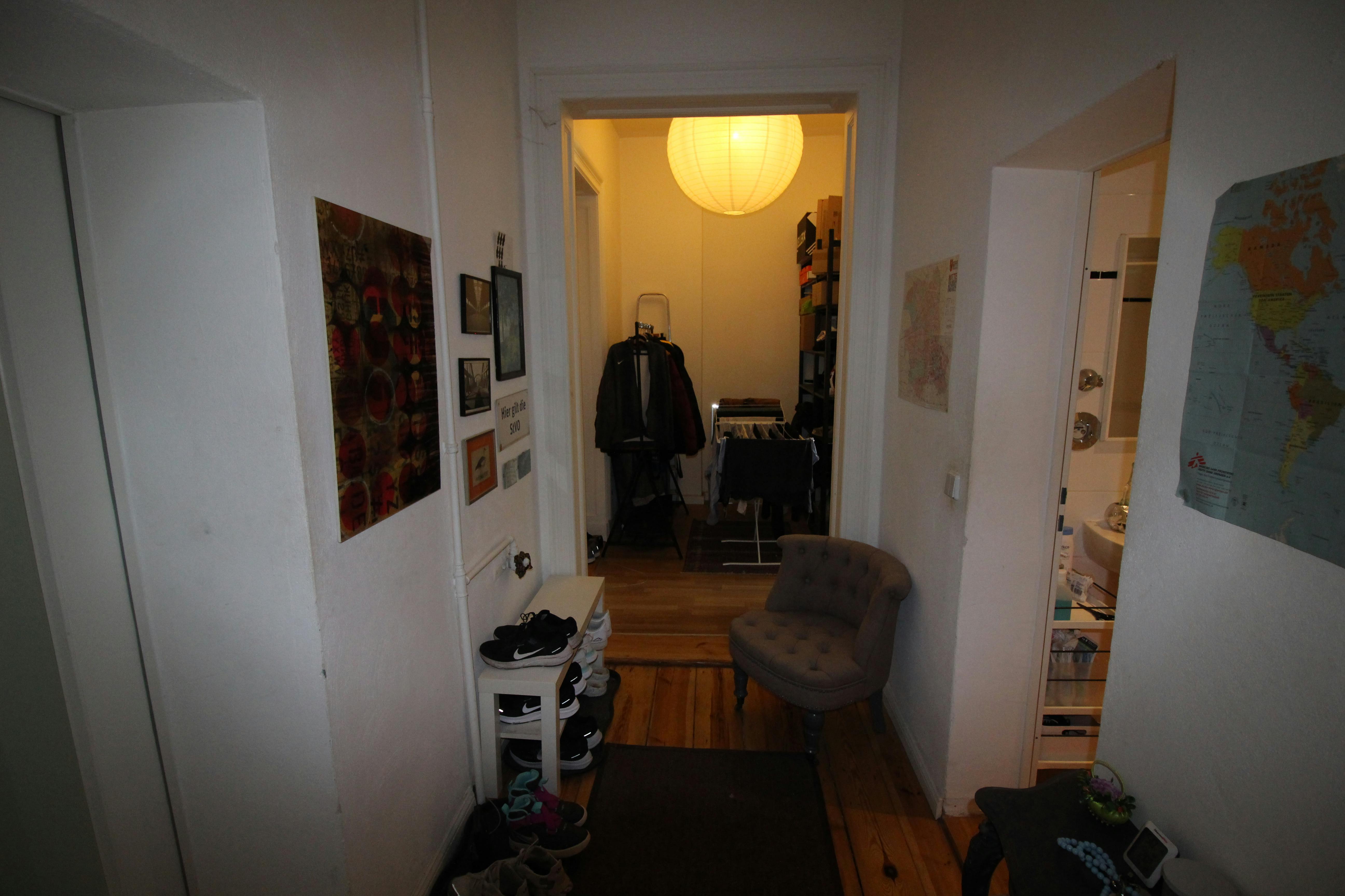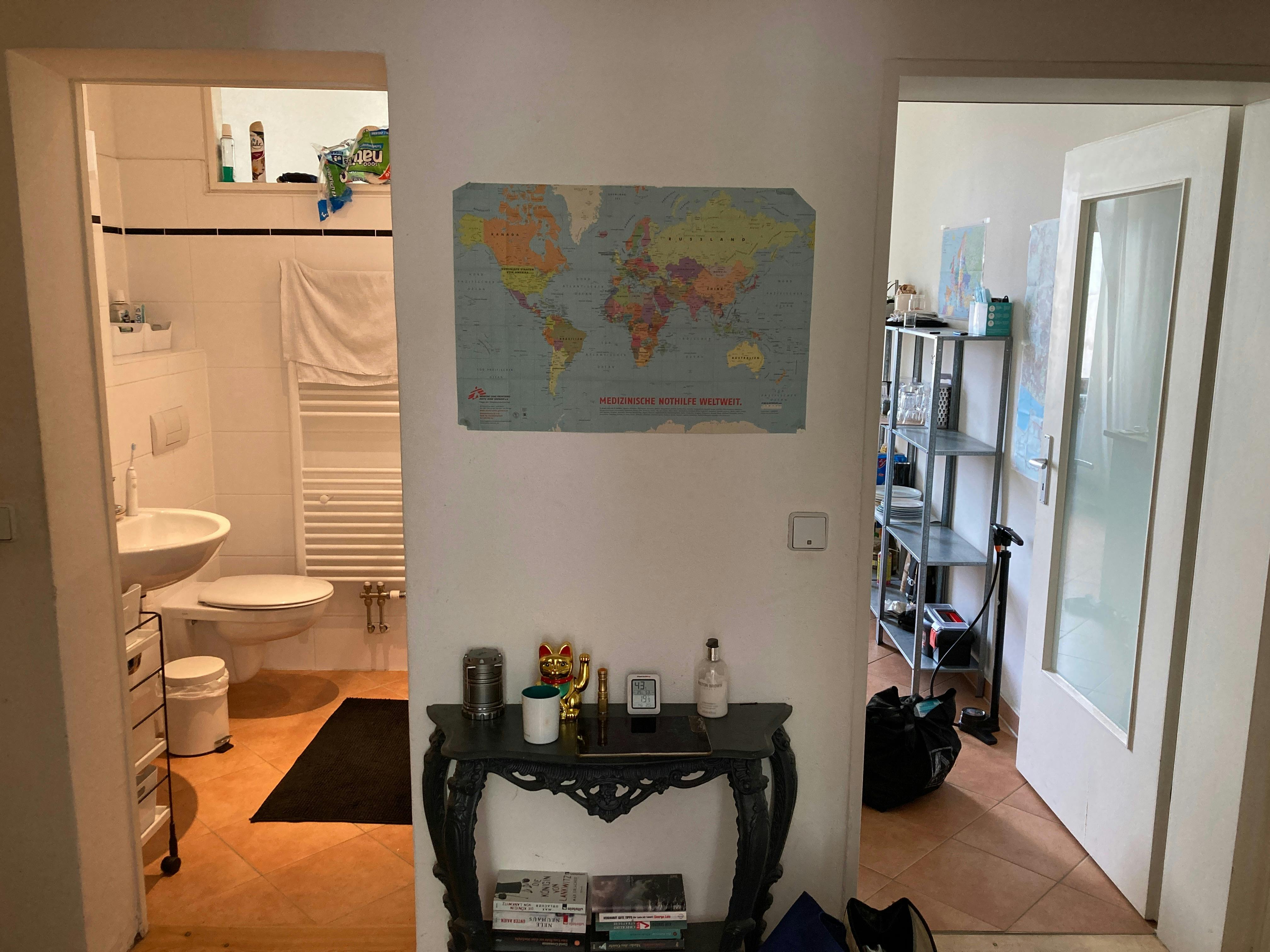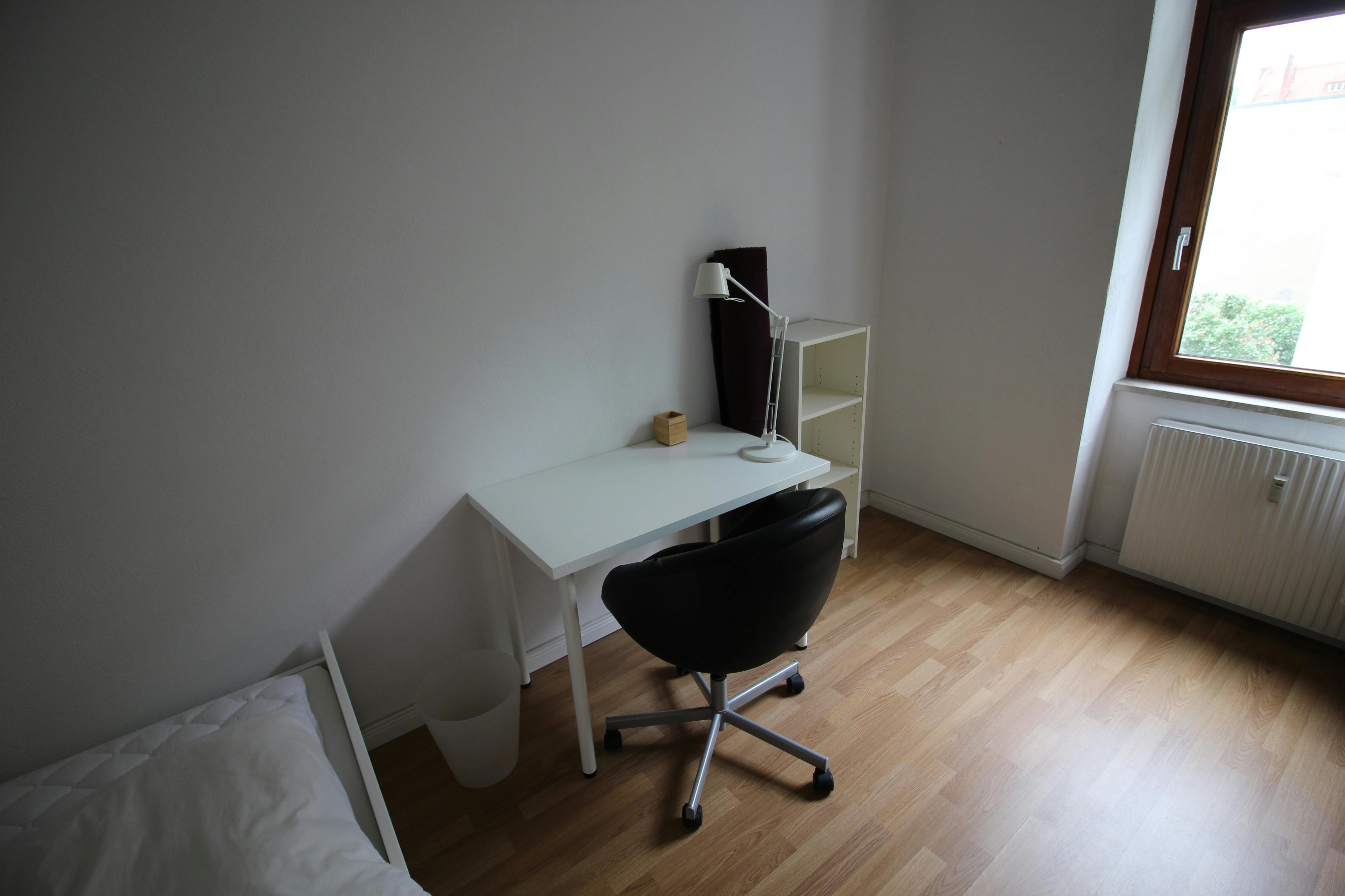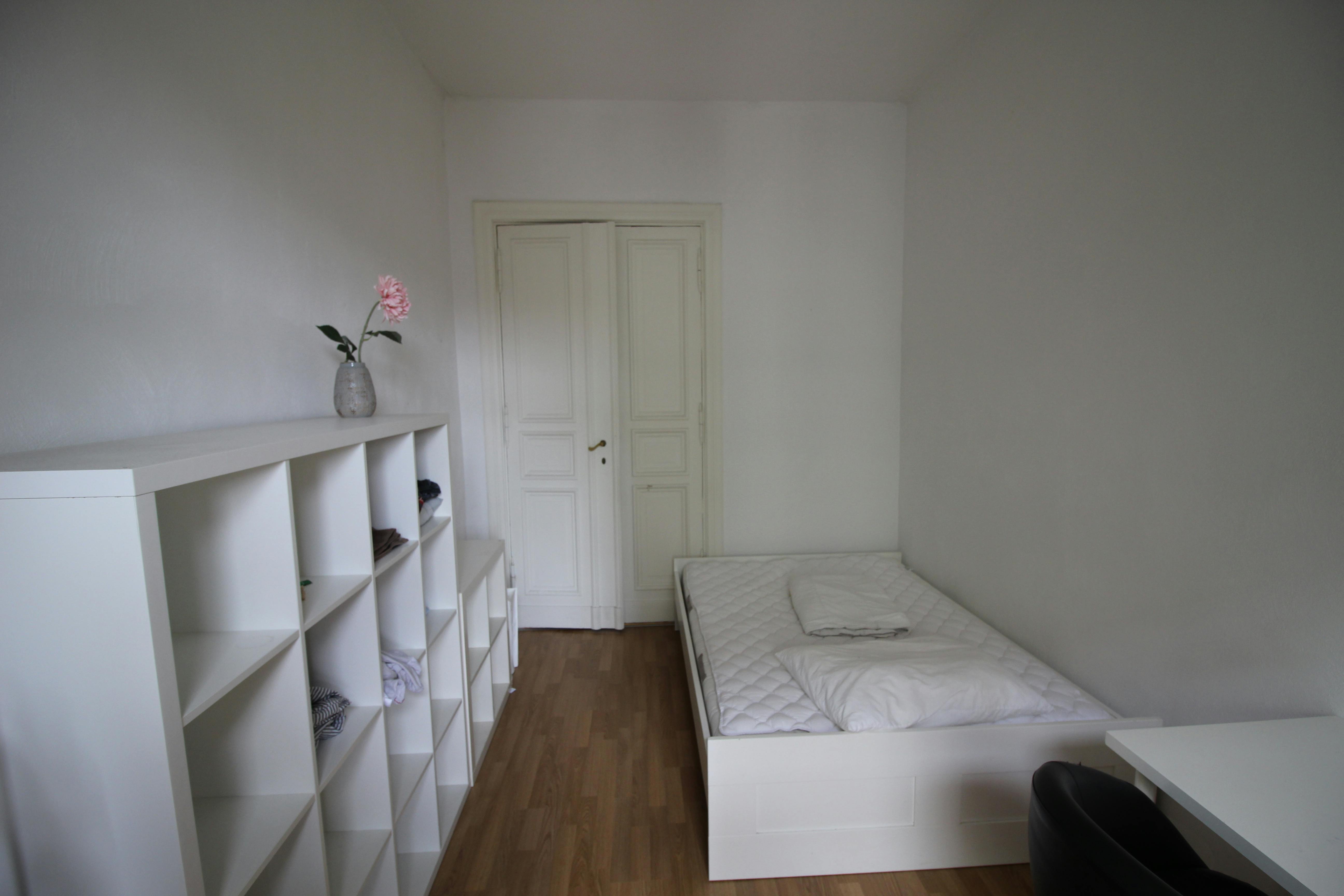 Das Zimmer befindet in einer 3 Zimmer Wohnung mit geräumiger Küche und halbwegs schönem Bad und ist zum Hof gerichtet. Es ist knapp 14m2 groß, hat eine hohe Decke und verfügt bisher über folgende Einrichtungsgegenstände: Bett, Schreibtisch, Ikea Kallax Regal, kleines Sofa.