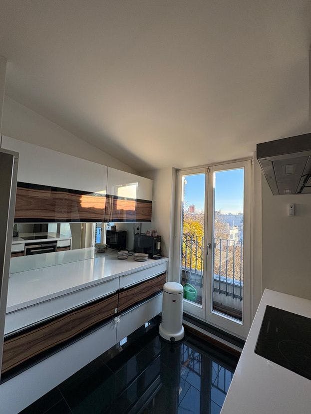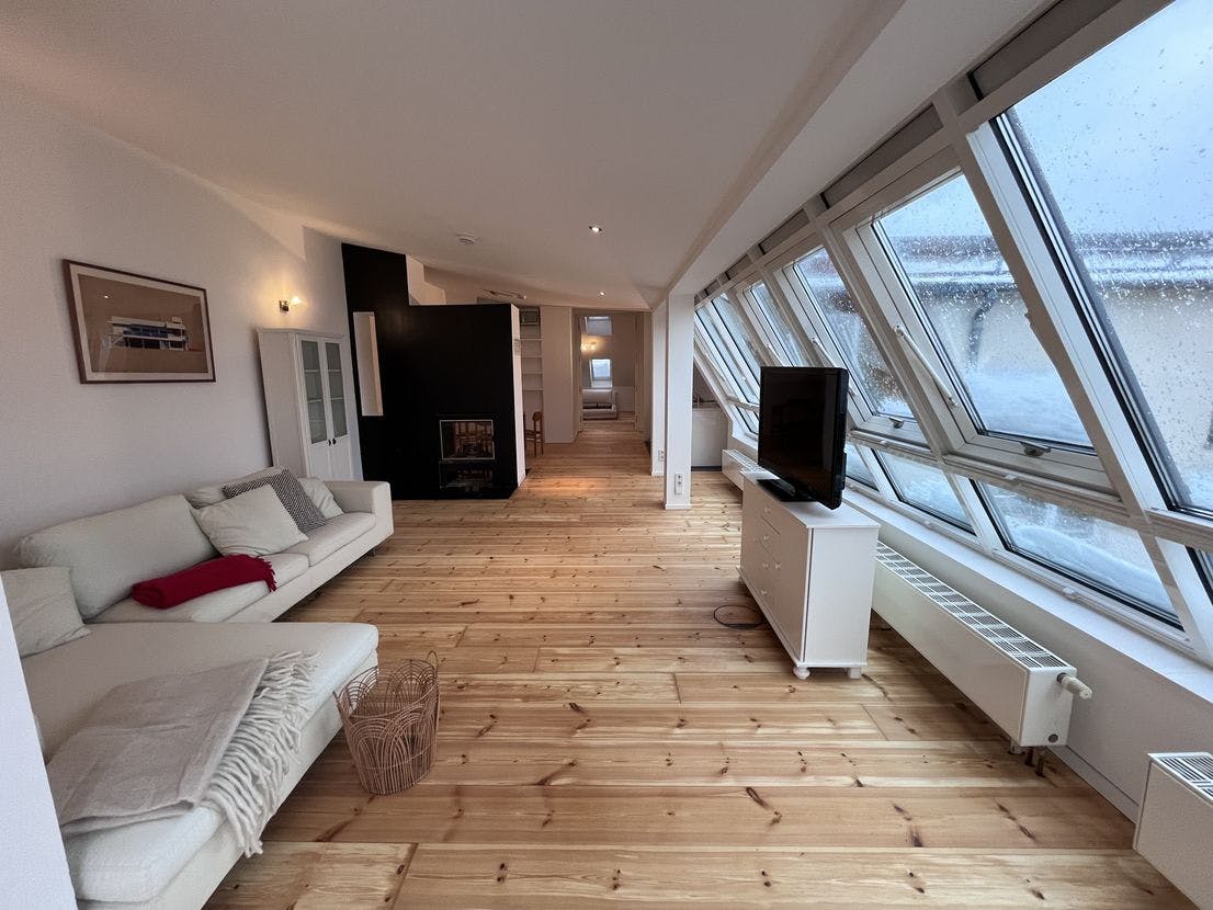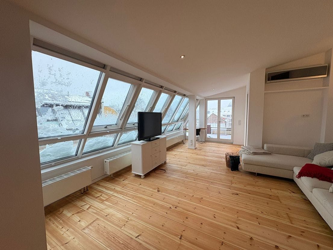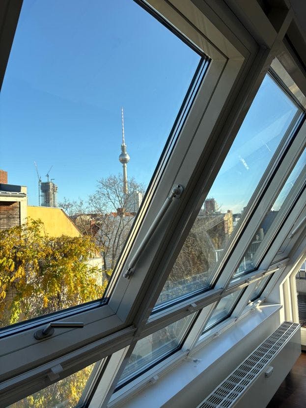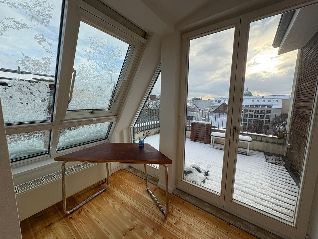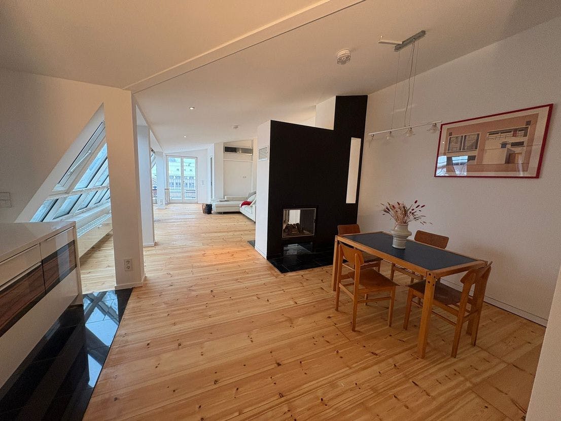 Near Hackescher Markt! A freshly renovated 3-room penthouse in Mitte with a fantastic view over Berlin (including the TV Tower), featuring a rooftop terrace and private access to the “secret” Krausnickpark. Quiet yet centrally located, on the 5th floor, with partially 4-meter-high ceilings. Available for a fixed rental period from January 1, 2025, to July 31, 2026 (8 months). Open-plan dining and living area with fireplace, two bathrooms. Fully furnished with a double bed, sofa, kitchen including Siemens appliances, ... Located between Hackescher Markt, Oranienburger Straße, and Monbijou Park. Close to Sankt Hedwig Hospital, including a medical center offering excellent...