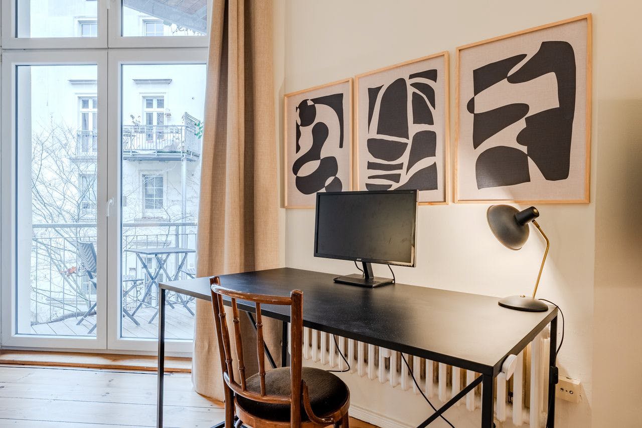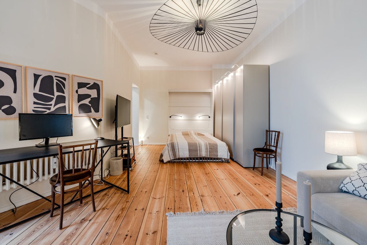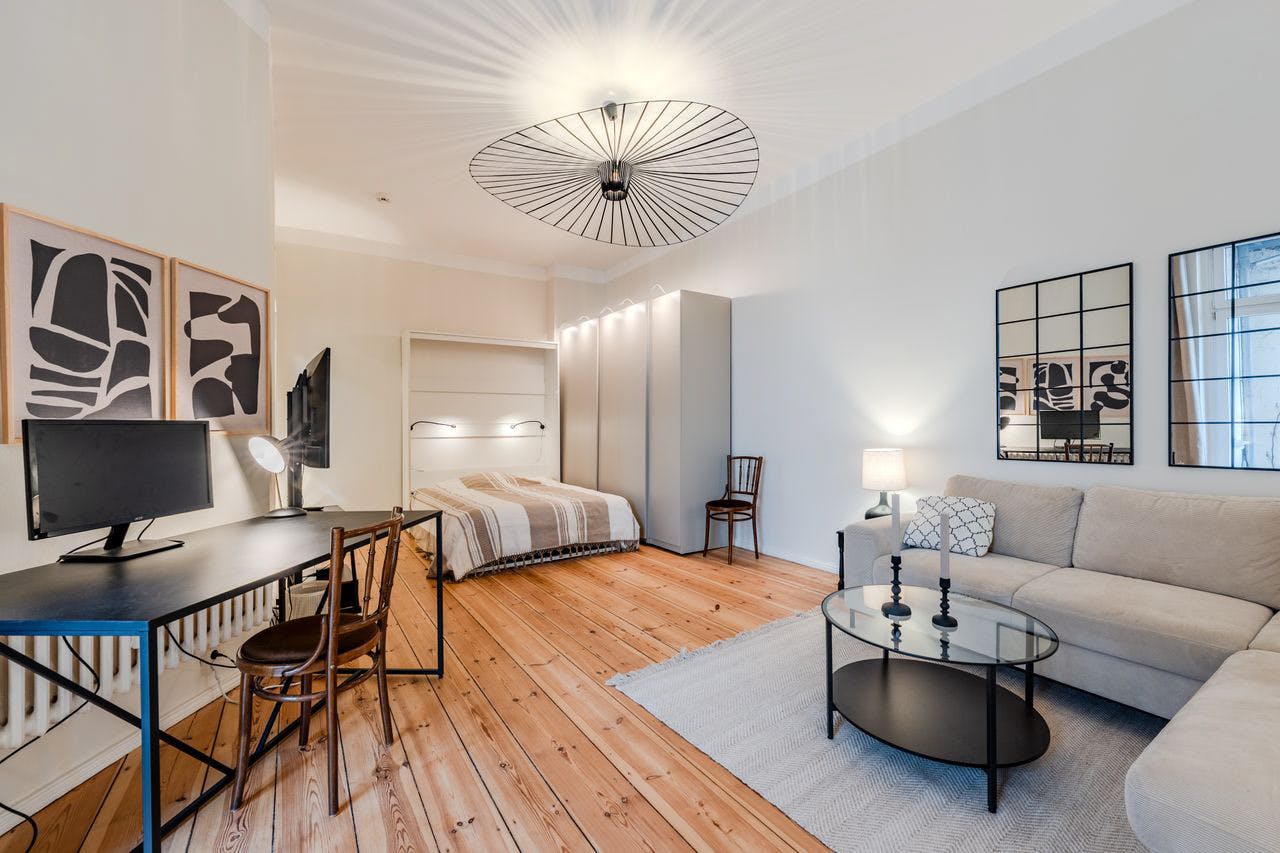 This bright and modern apartment on Liegnitzer Straße, 10999 Berlin offers 45 m2 of comfortable living space in a central yet quiet location. The balcony facing the inner courtyard provides a relaxing spot right in the heart of the city. Features: - Spacious living and bedroom area with a king-size bed, a cozy L-shaped sofa and work desk with screen (all accessories included) - Modern, newly fitted and fully accessorised kitchen with dishwasher, oven, stove, coffee machine etc. - Bathroom with bathtub - Balcony overlooking the quiet inner courtyard - Washing machine - TV and high speed Wi-Fi - Fully furnished and ready to move in - Electricity, heating,...