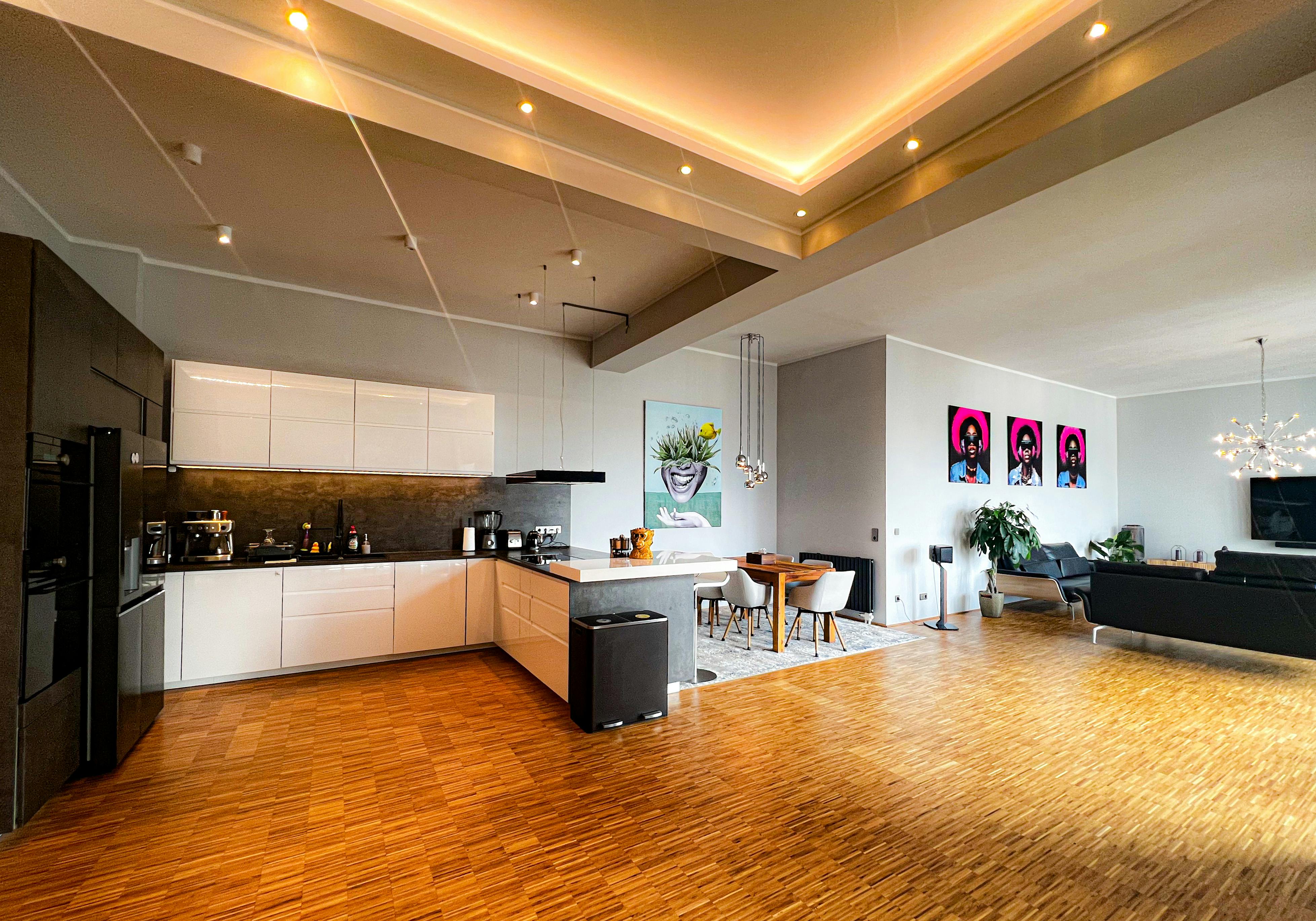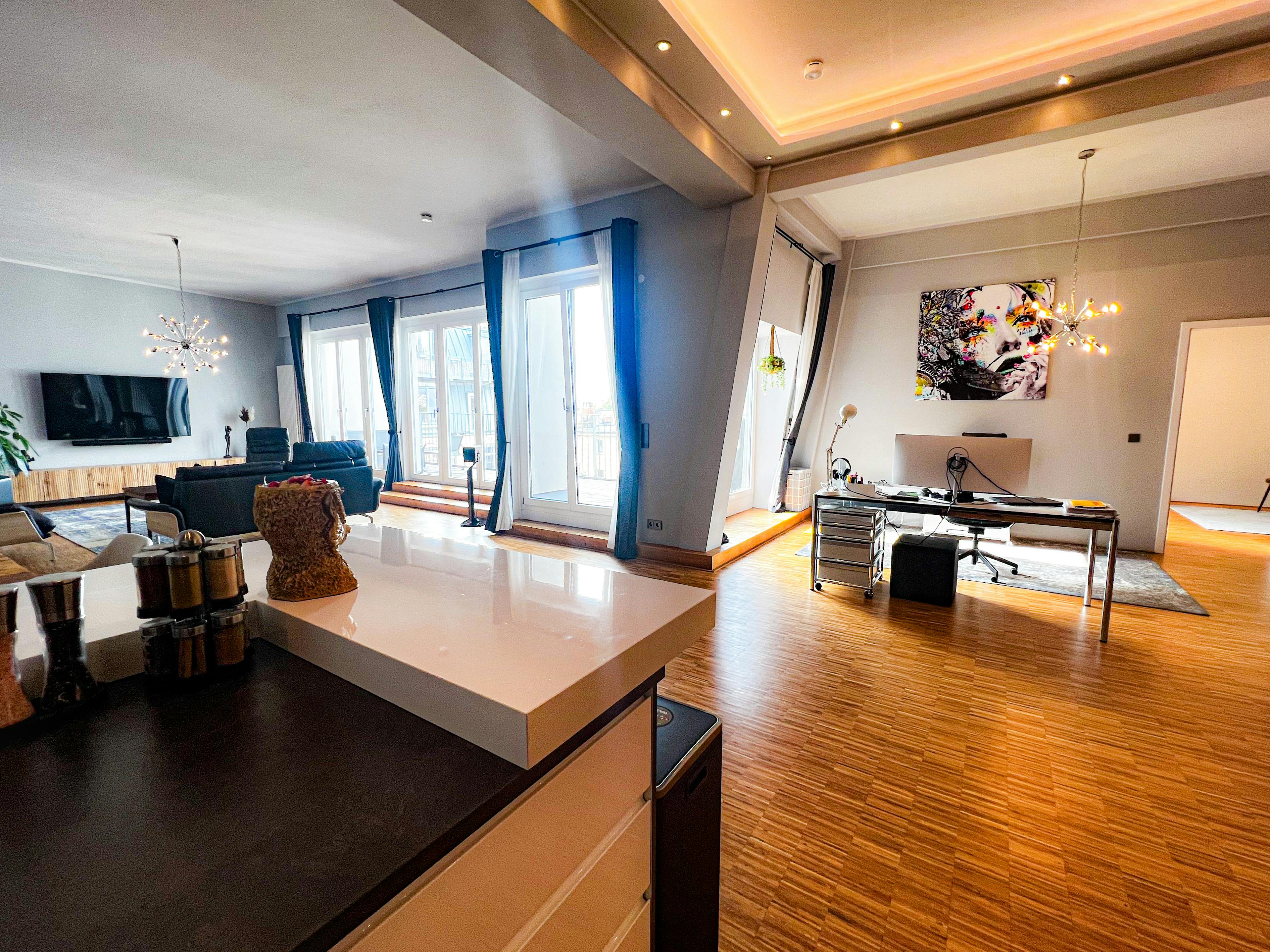 A 156 m2 fully furnished design loft with 3.8 m ceilings, sunset terrace views across Berlin, and full doorman service, located on the 5th floor of a historic 1910 Gründerzeit telecommunications factory in Kreuzberg. The apartment is defined by scale and openness. A 100+ m2 open-plan living area forms the core of the loft, allowing clear separation between living, dining, and working zones while remaining visually open. 3.8 m high ceilings run throughout, creating a bright, airy atmosphere that is rare in Berlin residential properties. Large windows lead directly to a large west-facing terrace with open, unobstructed sunset views across the city,...