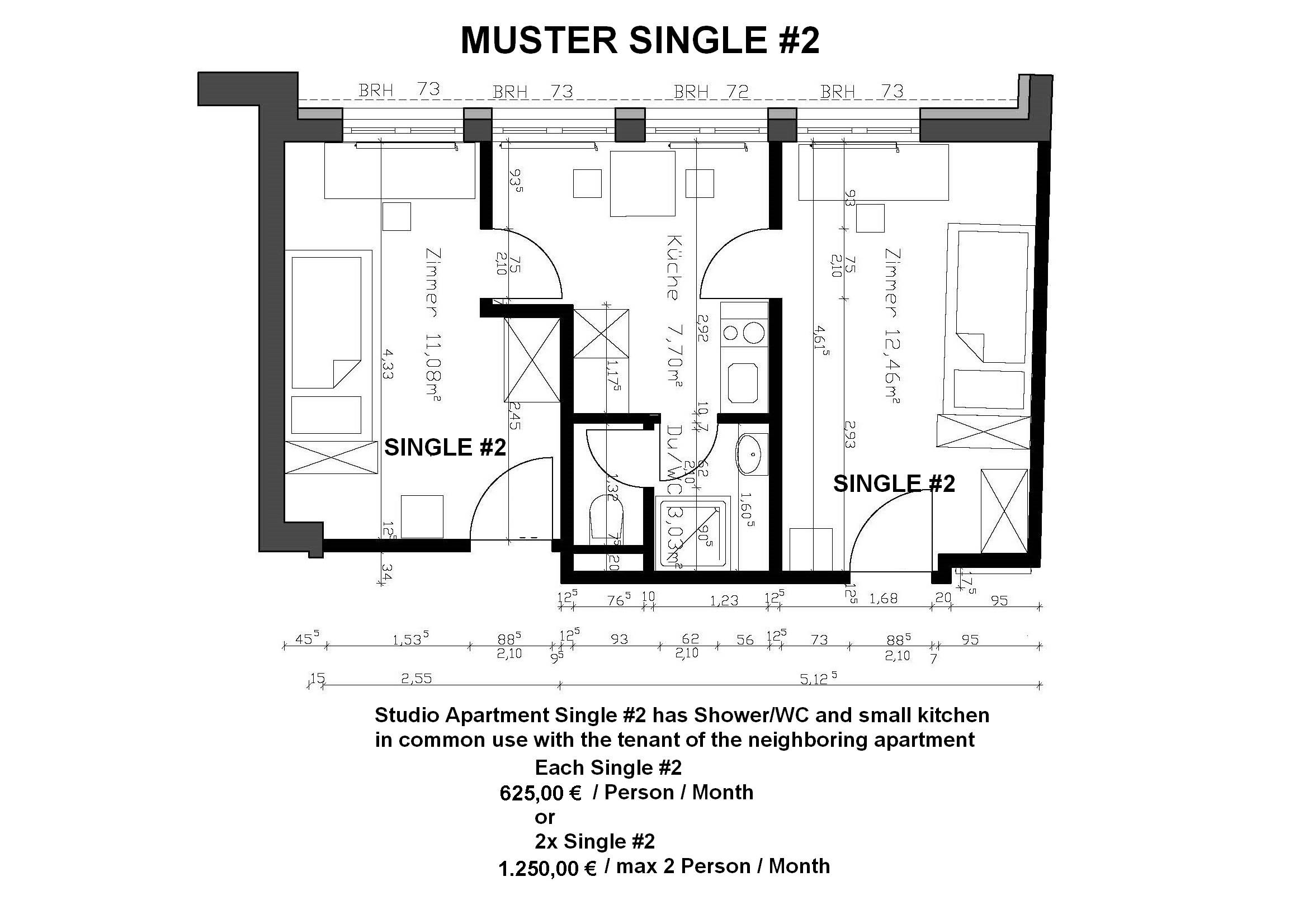 Studio Apartment Single #1 Einzelapartment für 1 Person mit geteilter Küche, WC und Dusche.