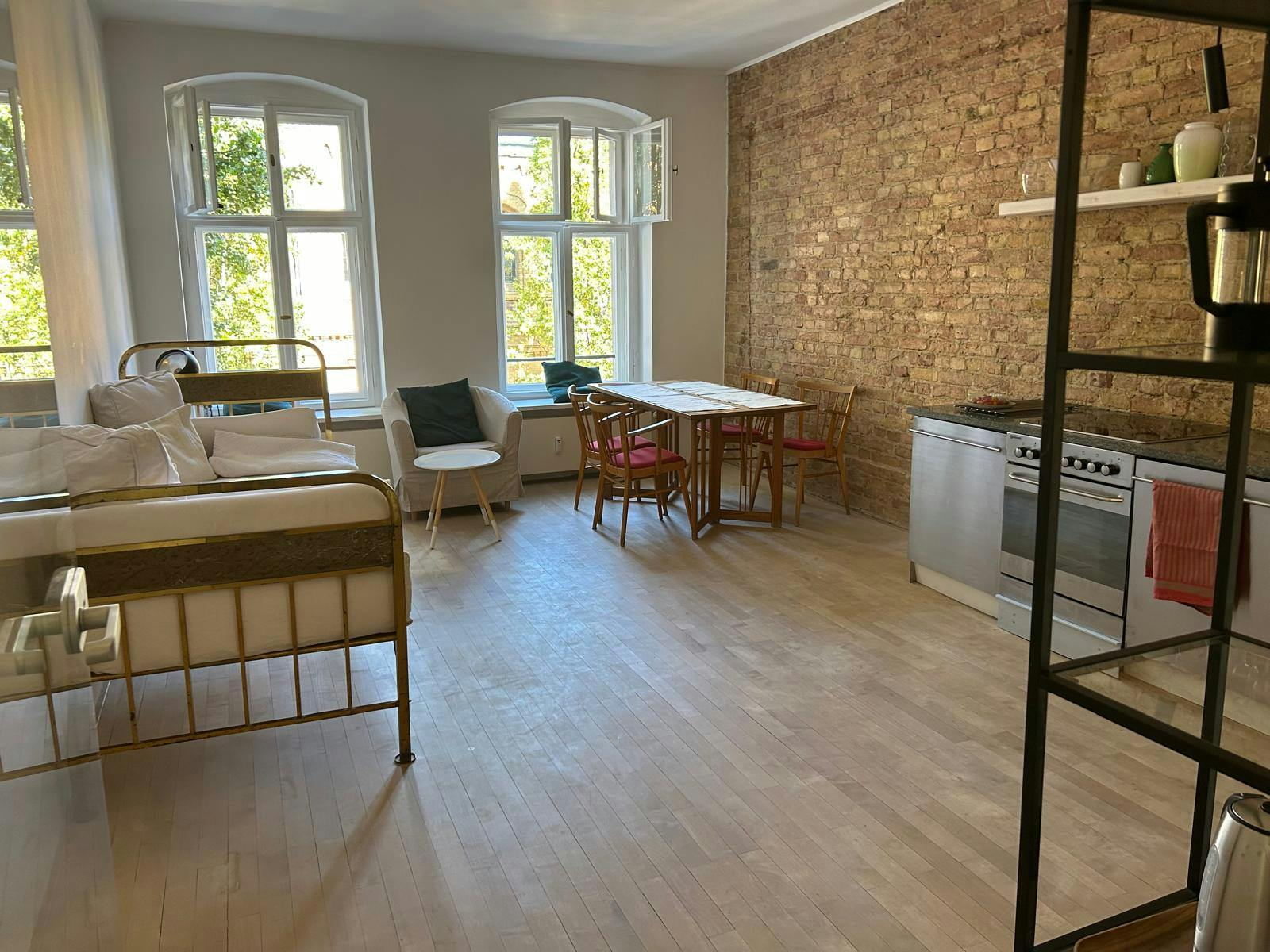 This charming two-room loft apartment combines style and comfort, featuring a king-size bed in the bedroom and a single (guest) bed, that is made up as a sofa in the living space. The open-plan kitchen is fully equipped, making it easy to prepare meals, while the living area invites for relaxation. There is also a desk in the bedroom. The bathroom includes a tub, perfect for unwinding. Step onto the balcony to enjoy views into the quiet yard, from the front window you have a view to Kulturbrauerei, a lovely landmark building. Located in the vibrant heart of popular Prenzlauer Berg...