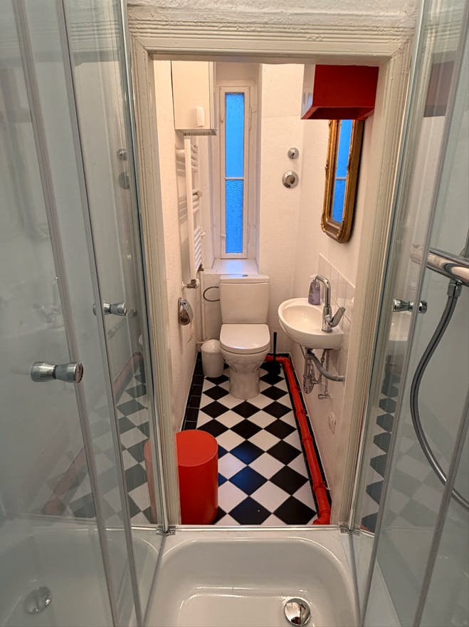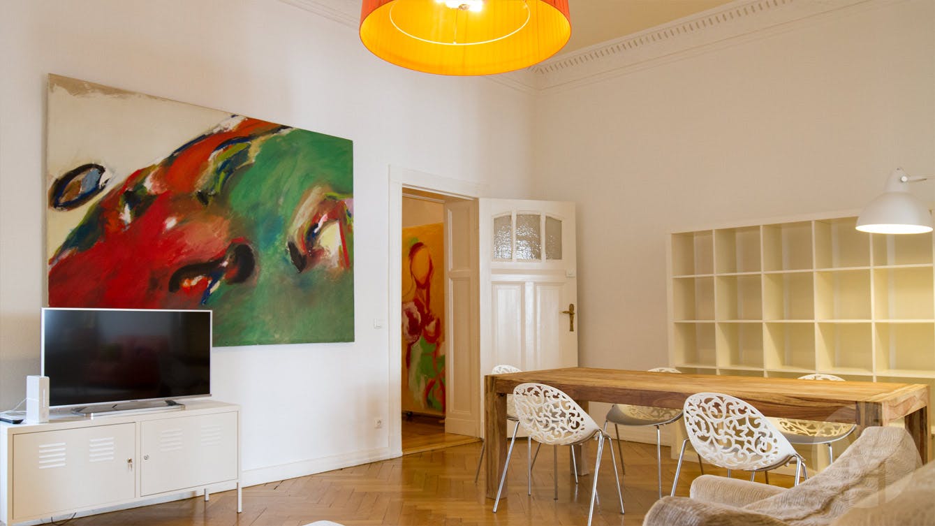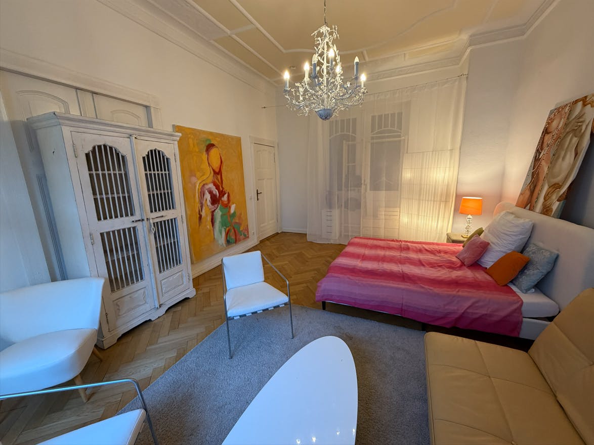 This furnished room with an own big balcony is part of a beautiful "Berlin Style" flat with the typical high ceilings and spacious rooms. The flat is located in the heart of Ku'damm, Schlüterstraße and Kantstraße area, where you can find a variety of nice restaurants and cafes. Public transport is available in the vicinity. It has all ammenities: fully equipped kitchen, washing machine, dryer, internet. You'll be sharing the flat with me and another flatmate.