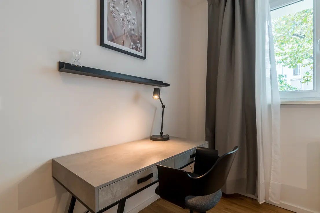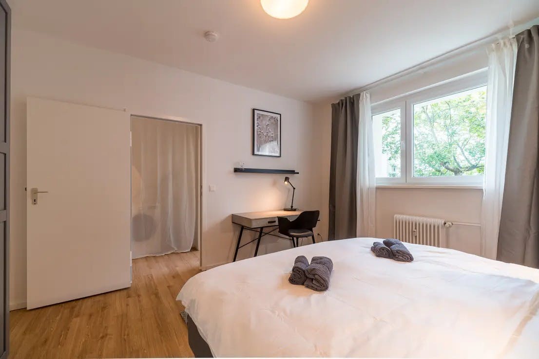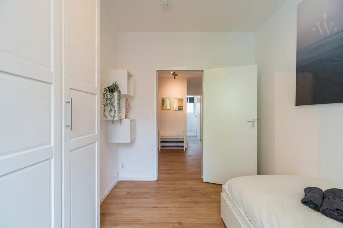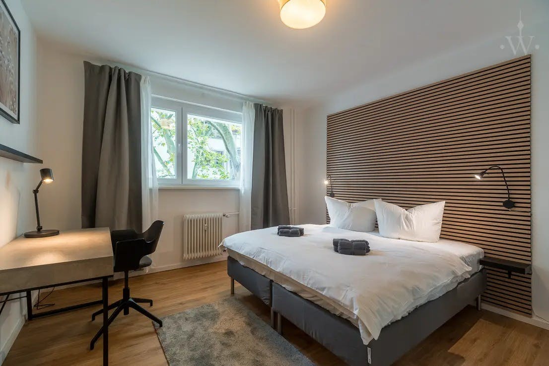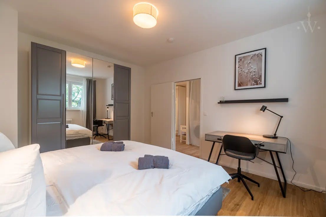 ??? Stylish 2.5-room apartment in Berlin-Schöneberg This lovingly furnished apartment is located on a quiet side street near Bayerischer Platz and Schöneberg Town Hall. It features a spacious living room with a work area, a comfortable bedroom, and a fully furnished guest room. The high-quality bathroom with a bathtub and a balcony offer ample space to relax after a long day. The smaller bedroom/guest room has a pull-out bed, comfortably accommodating two people. equipment The following highlights await you: - Maisonette apartment - 2 bedrooms with double beds - Wardrobes - Desks - fully equipped open kitchen(Electrical appliances, cutlery, dishes, etc.) including) - Dining area for up to 4 people -...
