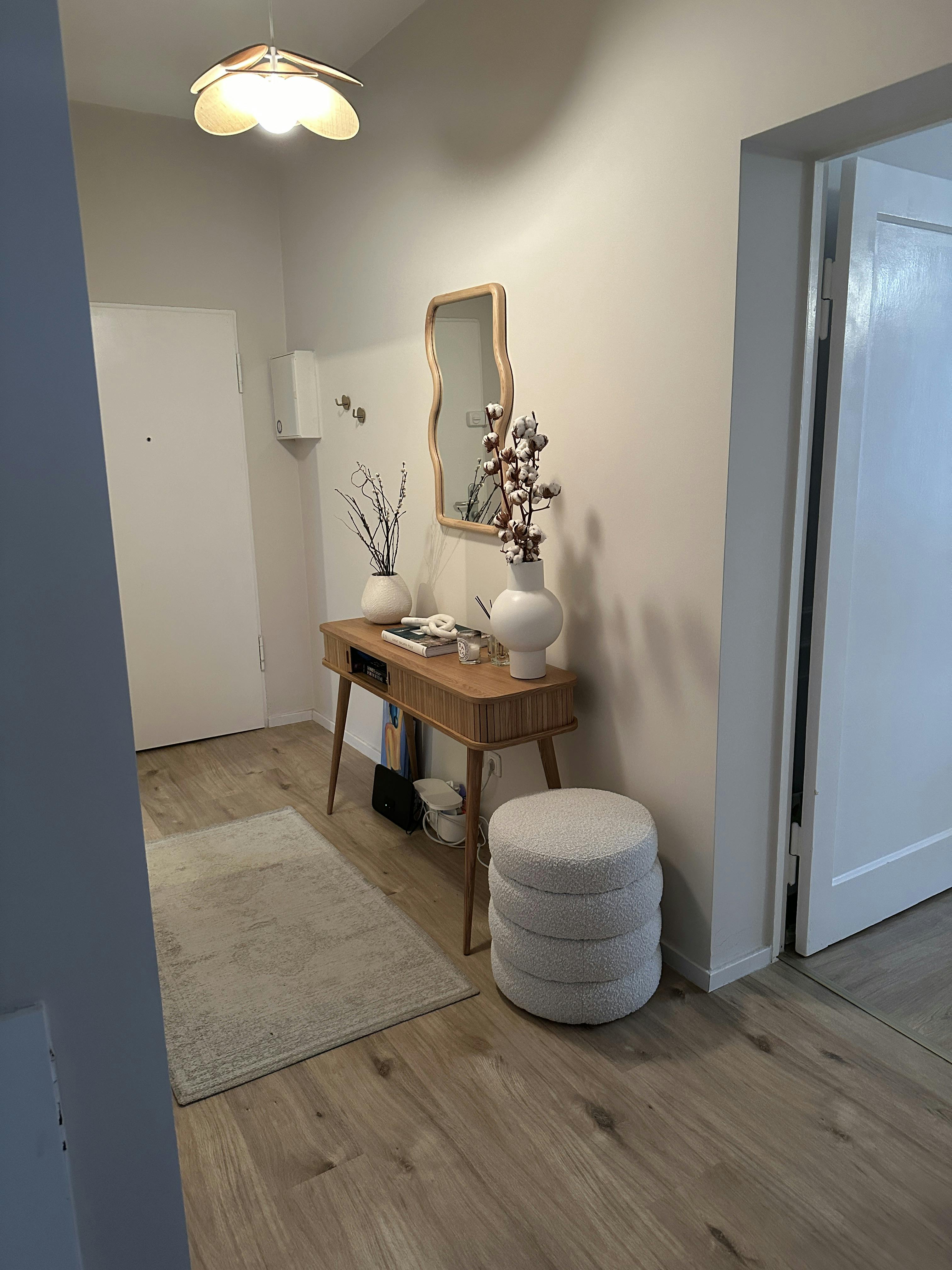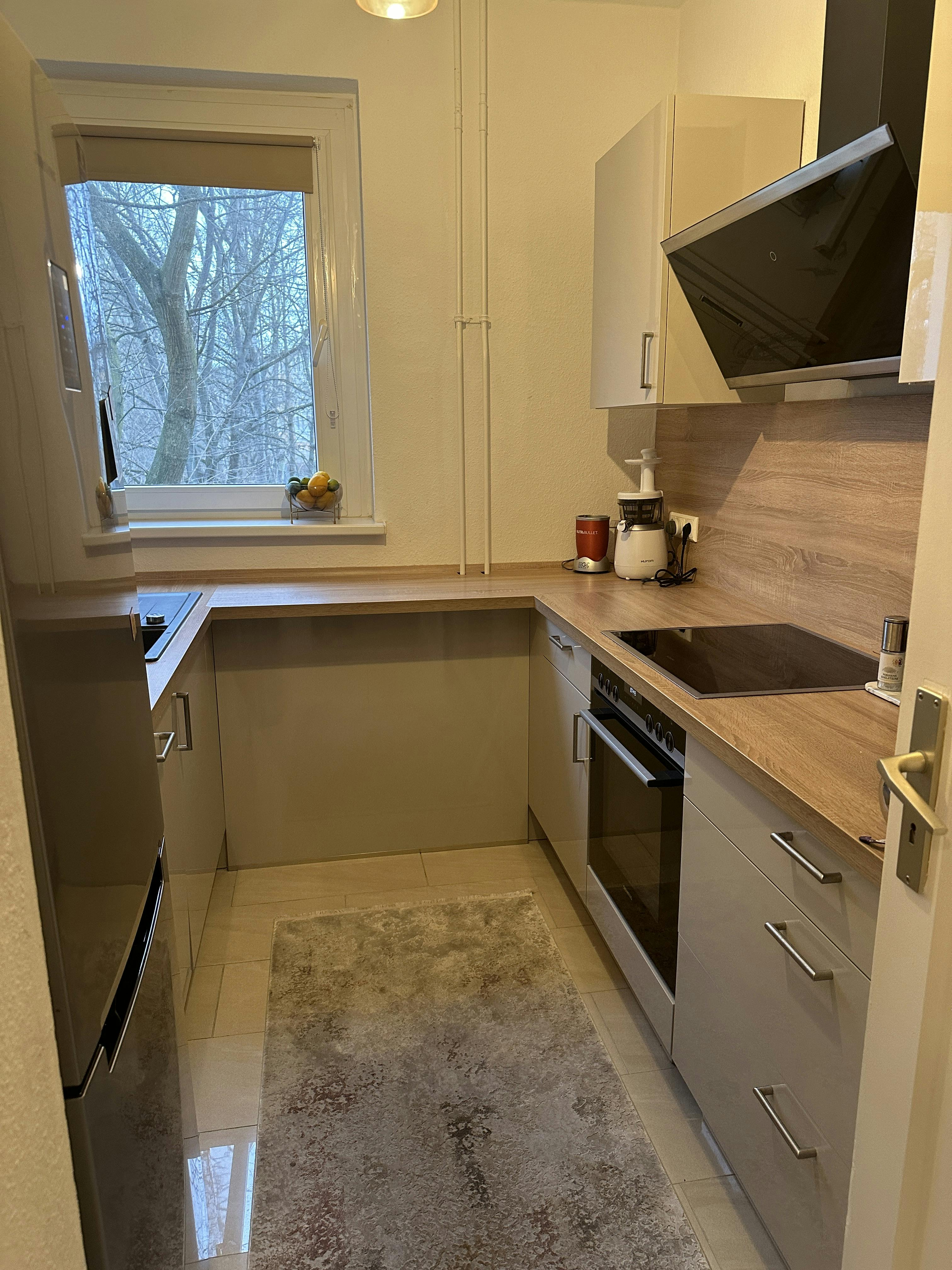 This partly-furnished apartment has been renovated to a high standard, providing a modern and comfortable living atmosphere in a quiet, green area. Size: 55m2, net rent 1190€+ 230€ running costs (incl. heating) gross rent: 1420€/ month (Note: GEZ, internet and electricity needs to be registered and paid for by the tenant) Bedroom: 1 with a spacious wardrobe (bed not included) Bathroom: Bathtub, Siemens washing machine, water filter Entrance Area: With storage space and built-in shoe rack Kitchen: new fully fitted kitchen with Siemens oven, Samsung refrigerator, Bauknecht dishwasher, and a separate tap for filtered water Living Room: Equipped with Samsung Smart TV, TV...