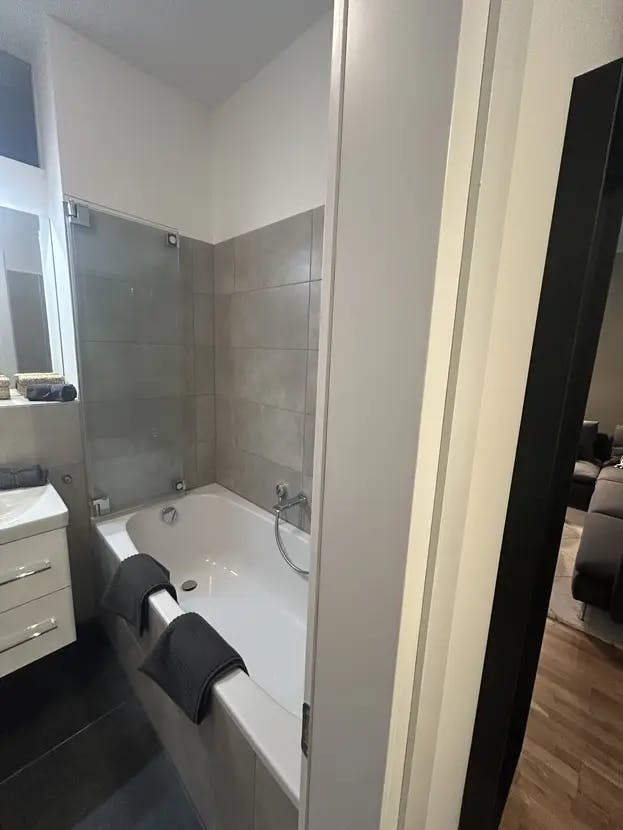 ??? Our modern 2-room apartment in Wilmersdorf with balcony This cozy 2-room apartment is located on the second floor of a beautiful new building built in 2018 and has a spacious living room with sofa bed, a kitchen with high-quality fitted kitchen, a cozy bedroom and a modern bathroom with tub and walk-in shower. equipment The following highlights await you: - Bedroom with double bed - closet - fully equipped kitchen (electrical appliances, cutlery, crockery etc. included) - dining area for up to 4 people - bed linen and towels - walk-in shower and bath tube - Washing machine - Living room comfort with sofa and Smart TV - Terrace with...