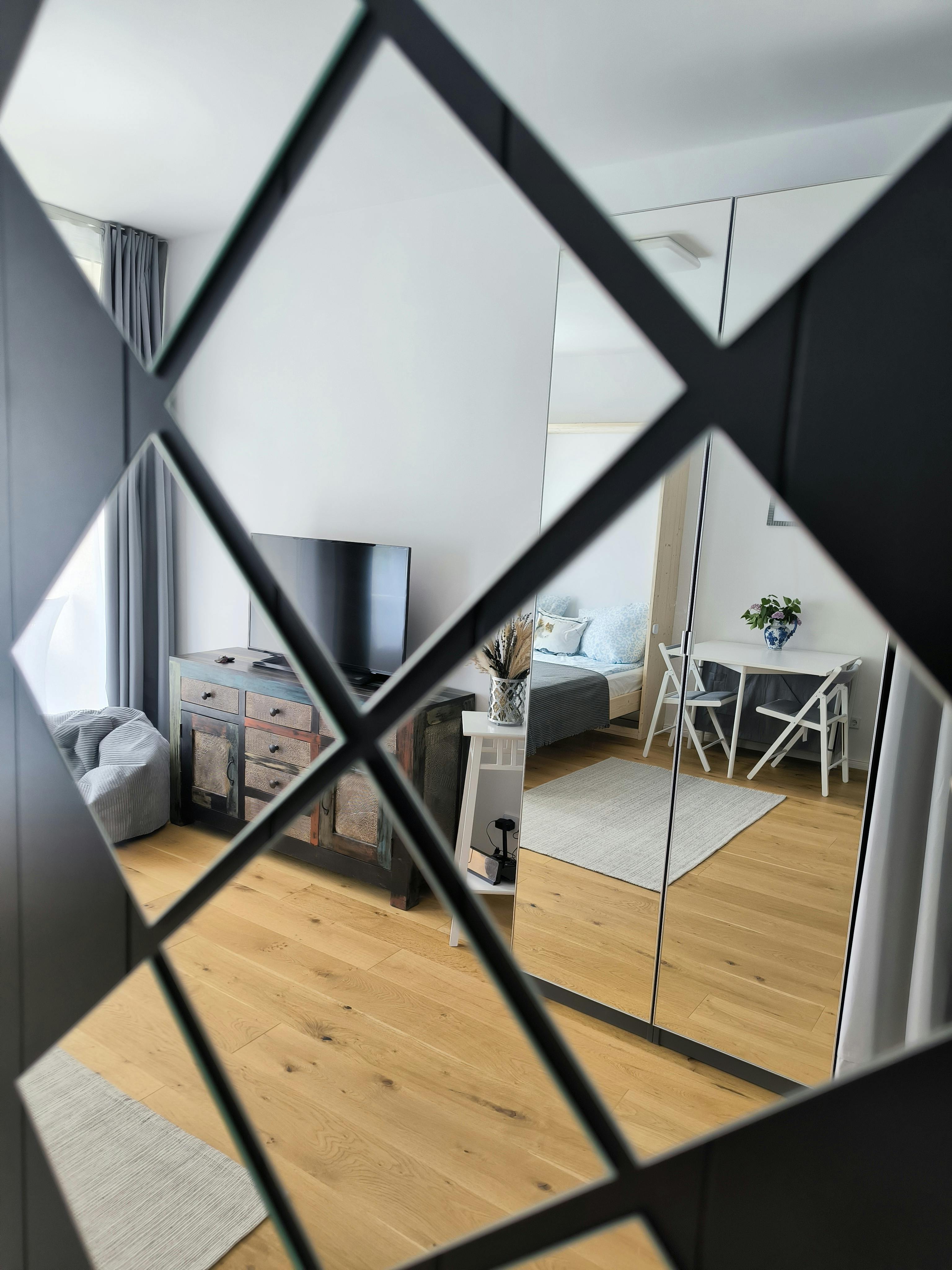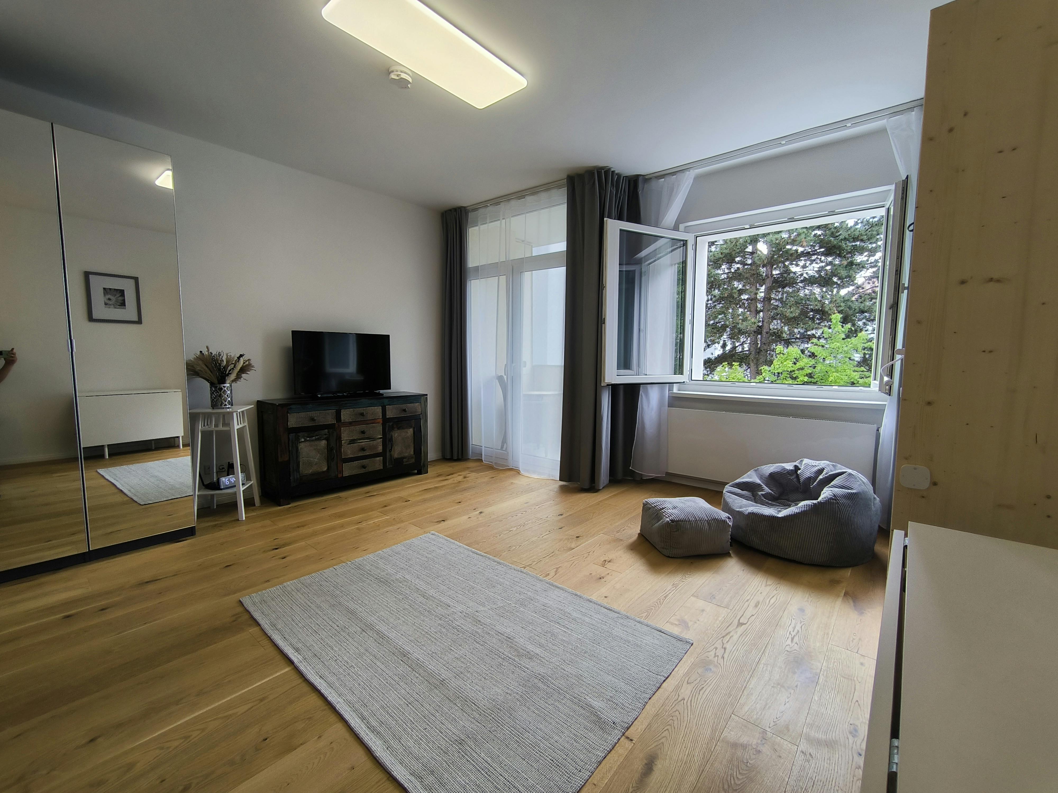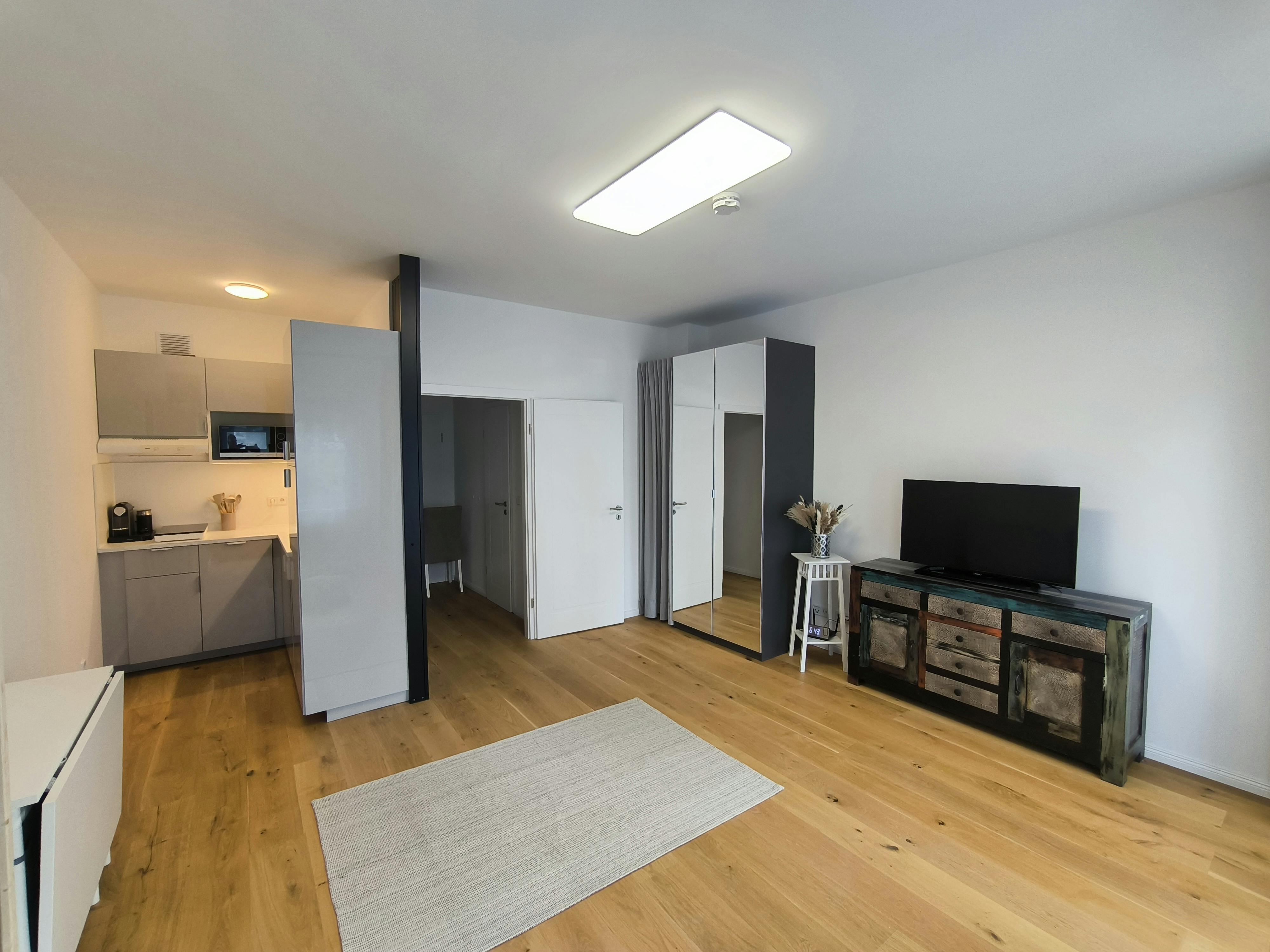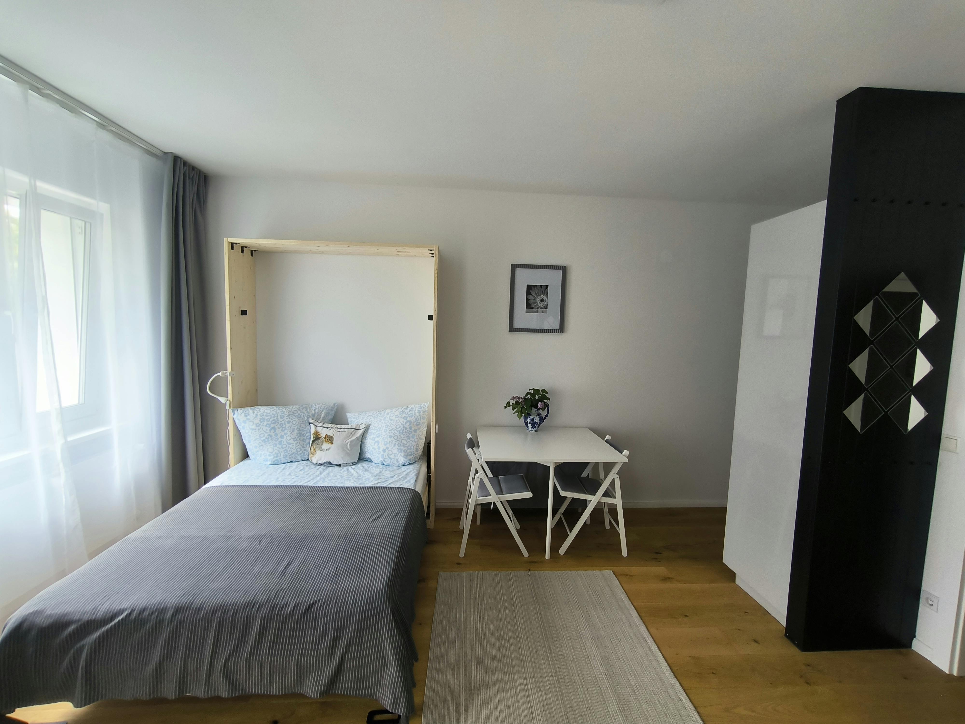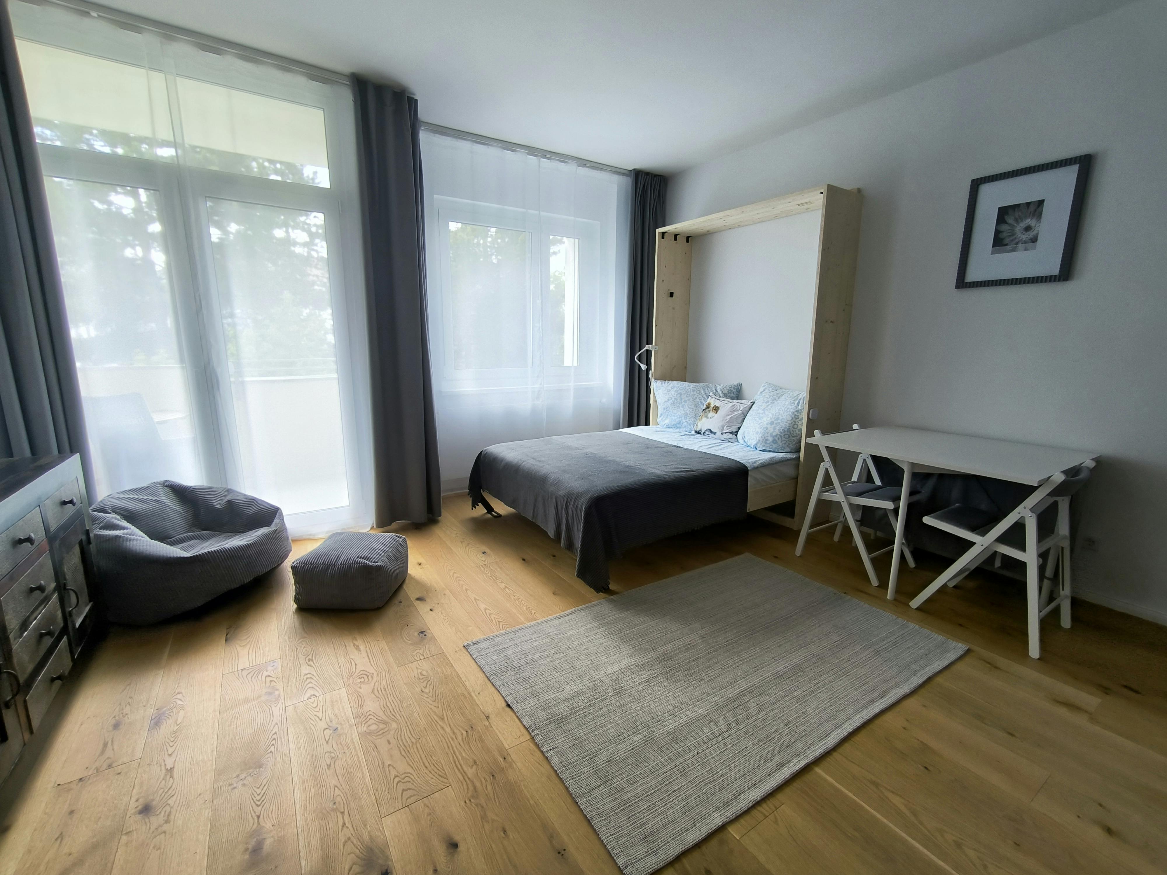 Stylish Living in an Excellent Location with a Thoughtful Layout This charming apartment impresses with its prime location and tasteful, modern furnishings combined with an efficiently designed floor plan. The spacious living and sleeping area is wonderfully bright thanks to a large window and the directly adjacent south-facing balcony. A high-quality, brand-new built-in kitchen equipped with modern appliances and a full set of cookware and tableware leaves nothing to be desired. You can use an Aigostar Airfryer for baking instead of a conventional oven. Additionally, the room features an elegant fold-away bed made of solid wood, which can be easily stored to transform...