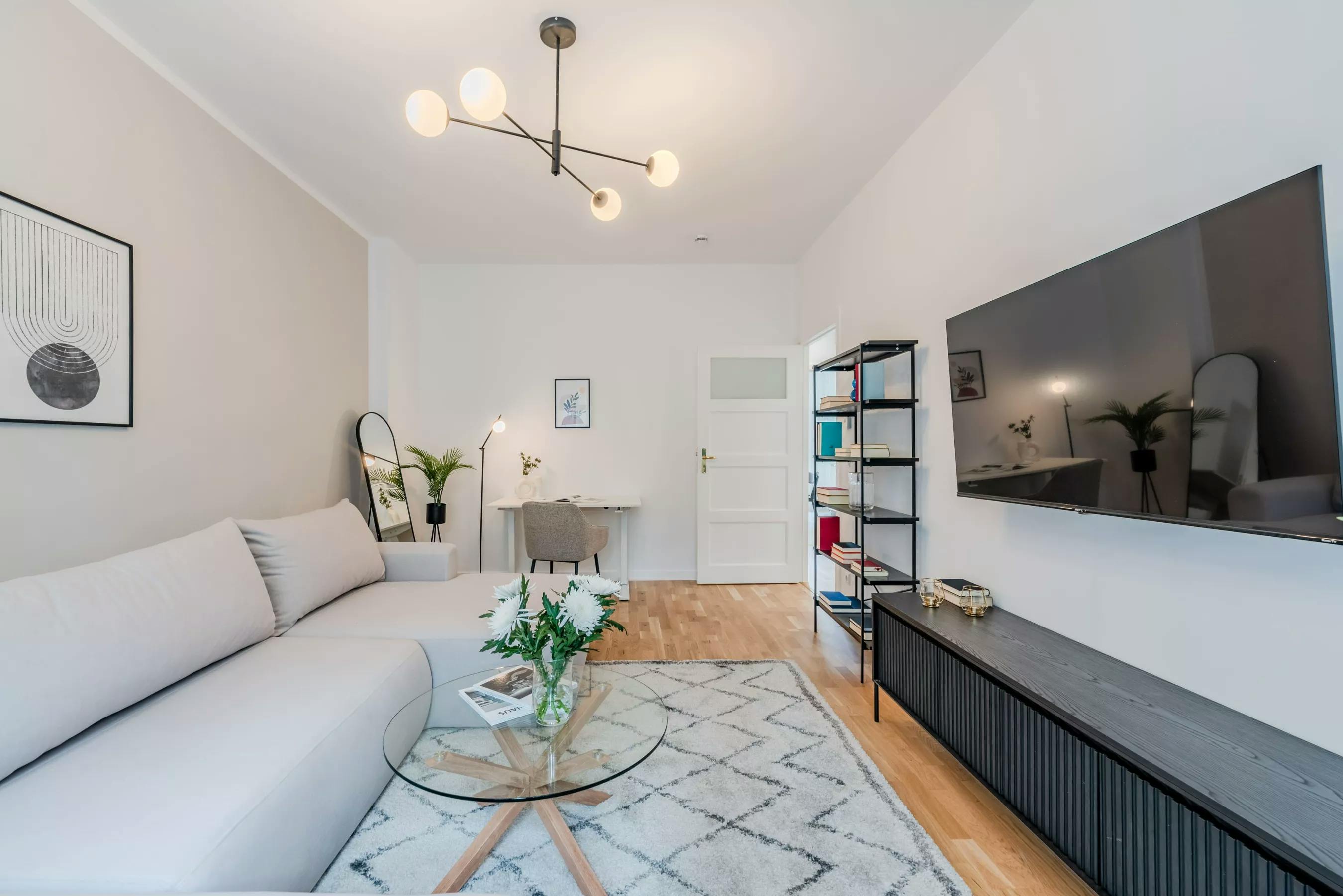Discover modern living in Neukölln, Berlin, with this newly renovated apartment. Spanning 60 sqm, it expertly blends style and functionality, making it perfect for those seeking a temporary yet sophisticated living space. The layout encompasses an organized entrance hall, a spacious bedroom, a comfortable living room, a fully-equipped kitchen and a contemporary bathroom. The bedroom is well-appointed with a brand-new large bed, extensive wardrobe, and curtains ensuring privacy. Adjacent to the bedroom, the living room features a 4K TV, a large convertible sofa, ample shelving, and a working desk—all designed for both productivity and relaxation. Large windows flood the space with natural...